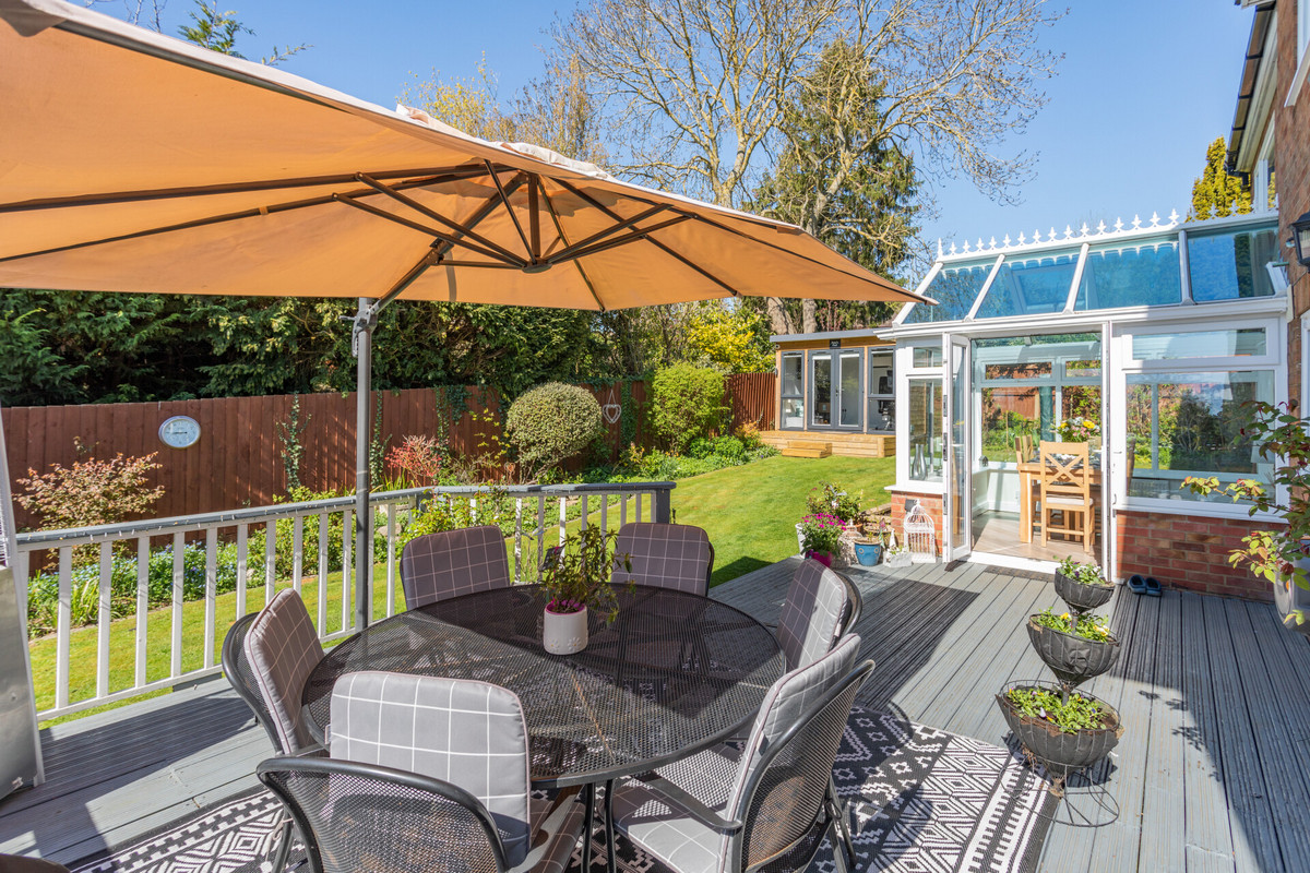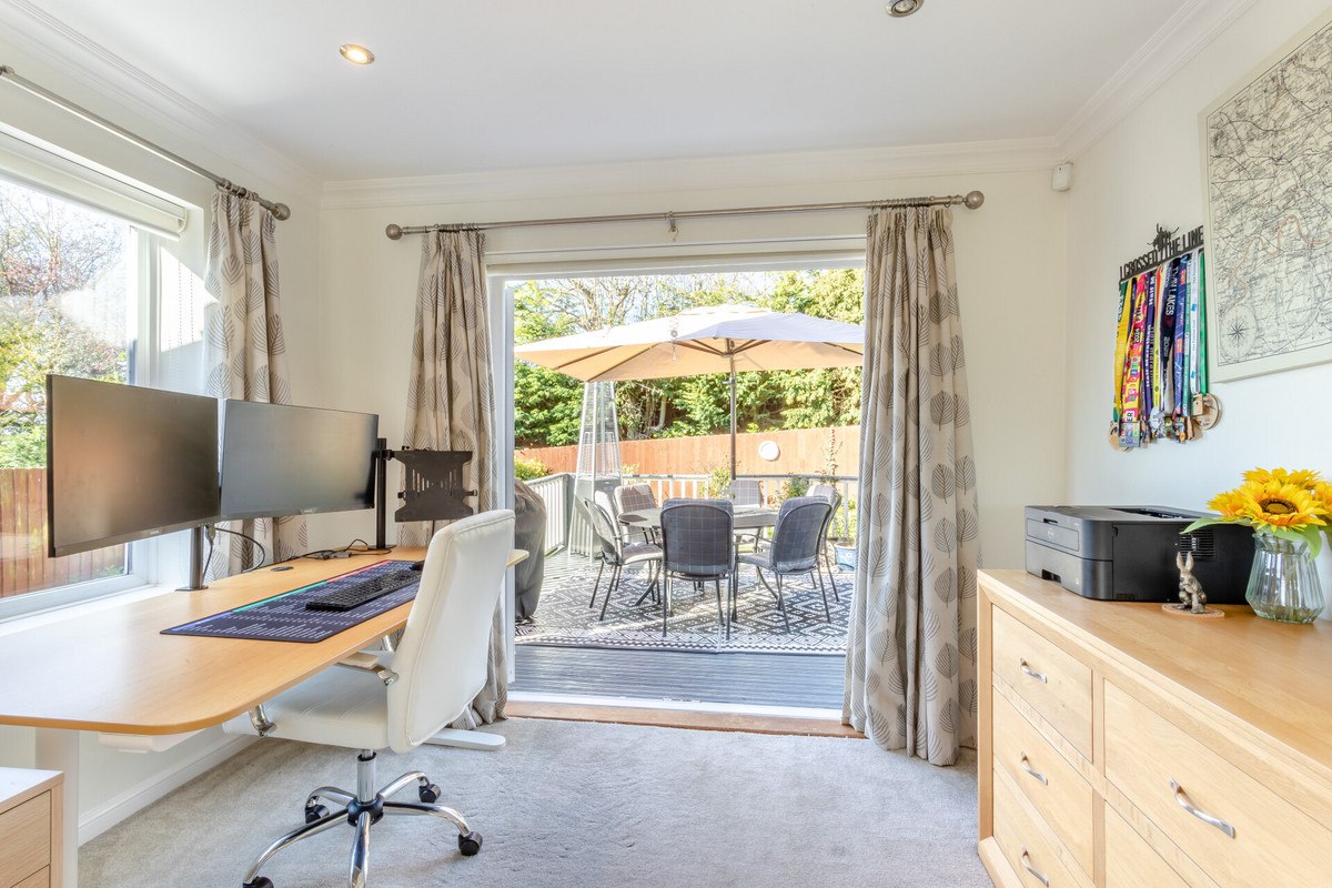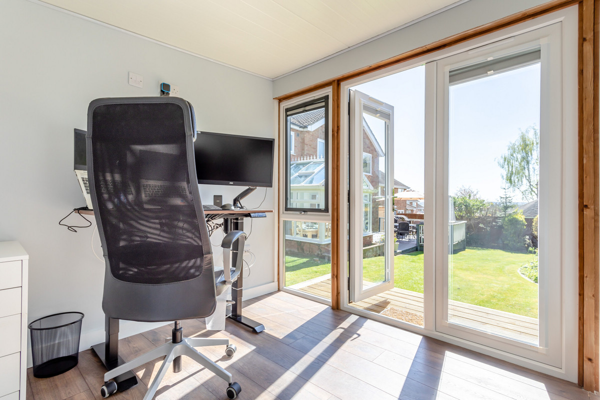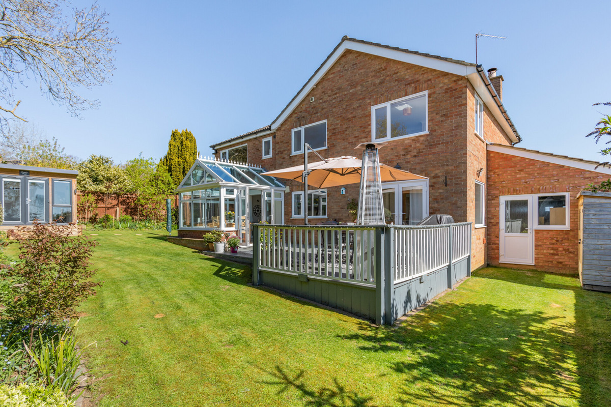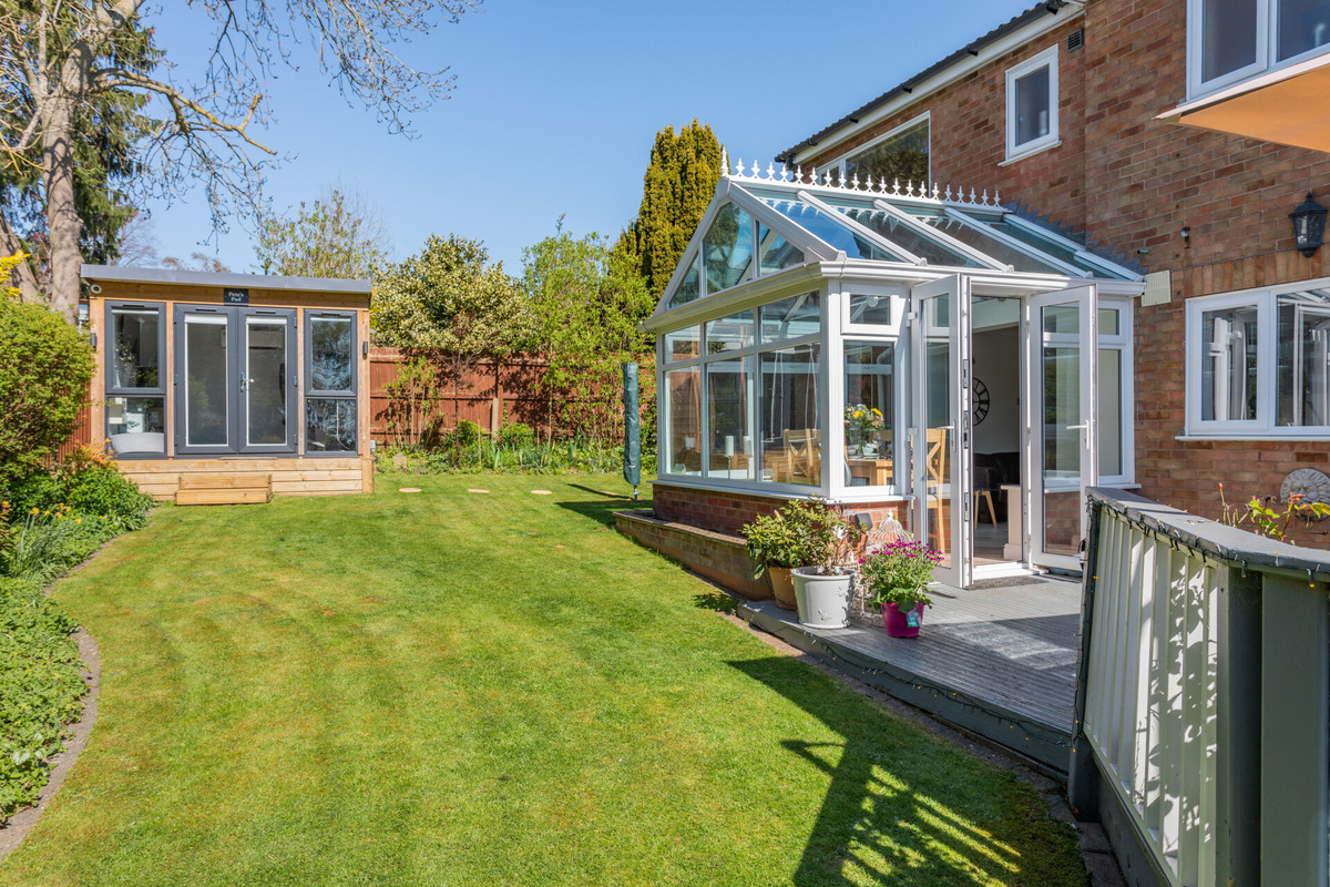 Outside, the home is set within a manicured plot at the end of a quiet cul-de-sac. The front features a well-maintained lawn and a driveway leading to an attached garage. To the rear, a private, south-west facing garden offers a sun-soaked lawn bordered by mature planting, as well as a raised decked terrace – perfect for al fresco dining or unwinding in the evening sun. Additionally, a purpose-built garden studio offers flexibility as a home office, gym, or creative space.