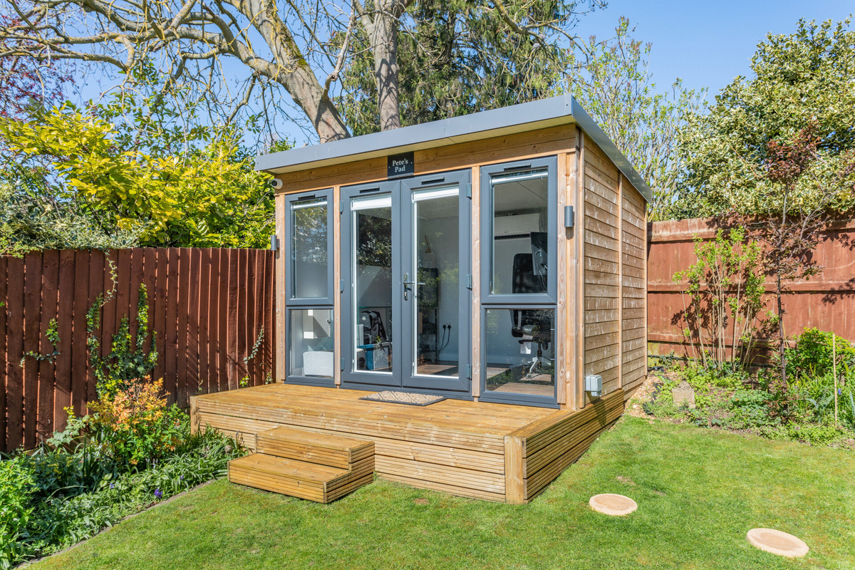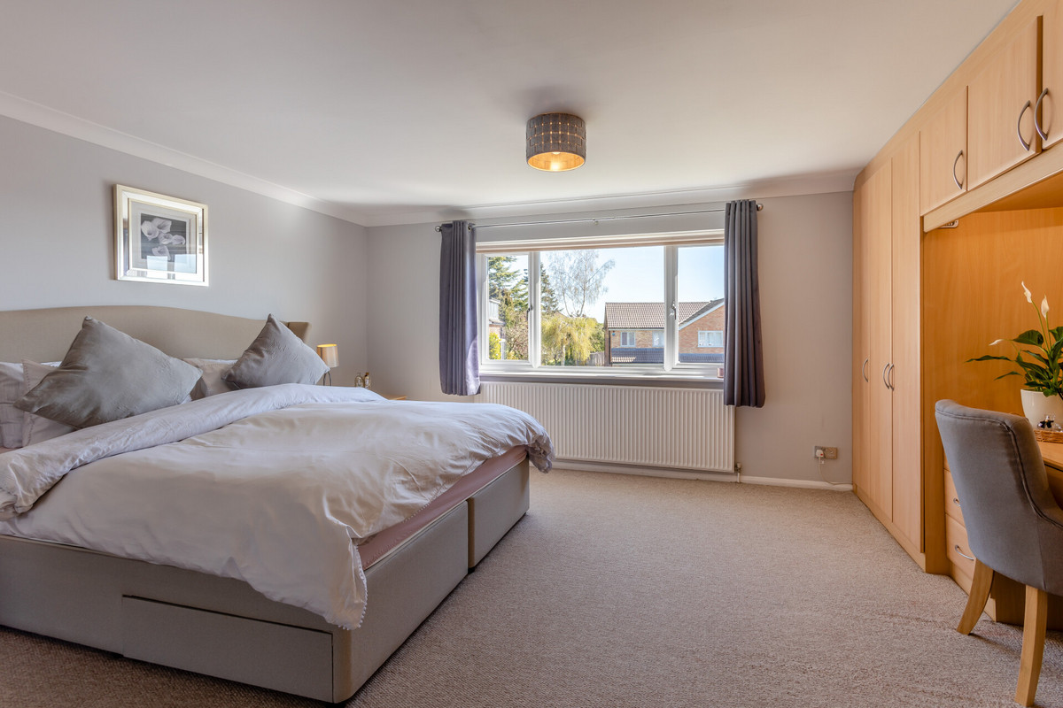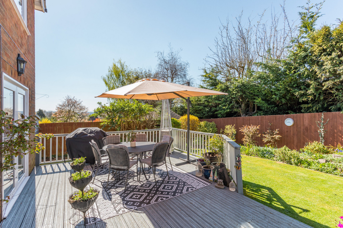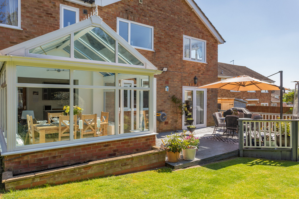 Outside, the home is set within a manicured plot at the end of a quiet cul-de-sac. The front features a well-maintained lawn and a driveway leading to an attached garage. To the rear, a private, south-west facing garden offers a sun-soaked lawn bordered by mature planting, as well as a raised decked terrace – perfect for al fresco dining or unwinding in the evening sun. Additionally, a purpose-built garden studio offers flexibility as a home office, gym, or creative space.