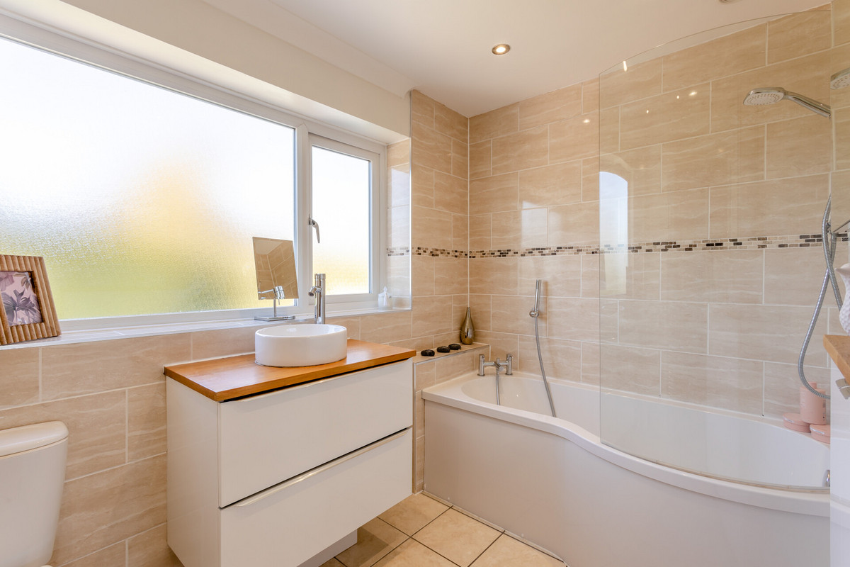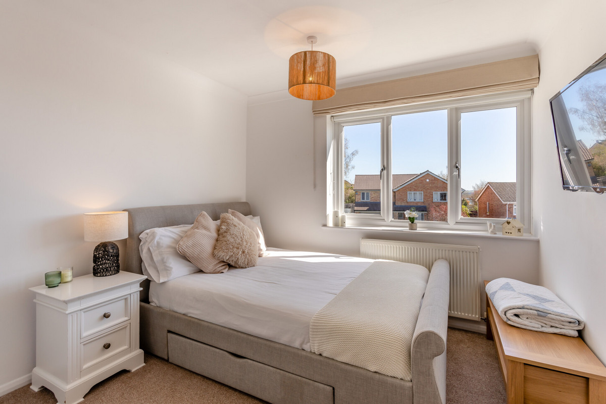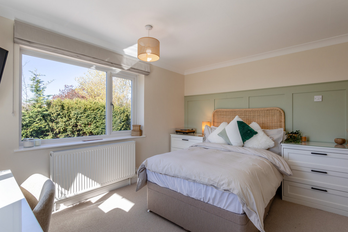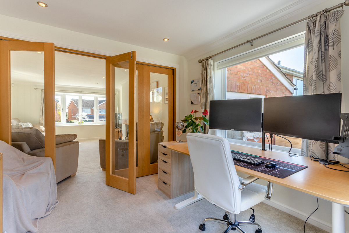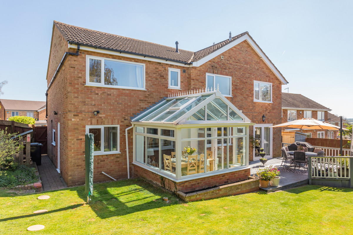 Outside, the home is set within a manicured plot at the end of a quiet cul-de-sac. The front features a well-maintained lawn and a driveway leading to an attached garage. To the rear, a private, south-west facing garden offers a sun-soaked lawn bordered by mature planting, as well as a raised decked terrace – perfect for al fresco dining or unwinding in the evening sun. Additionally, a purpose-built garden studio offers flexibility as a home office, gym, or creative space.