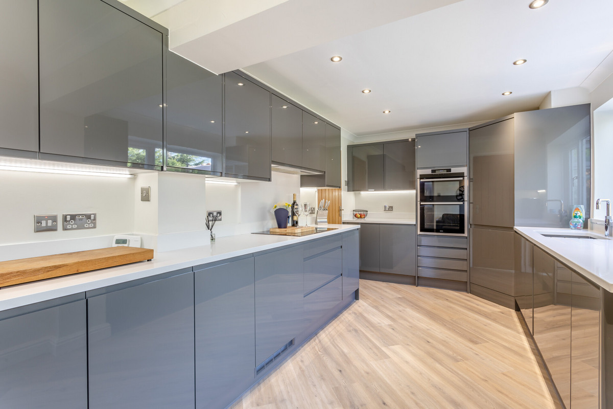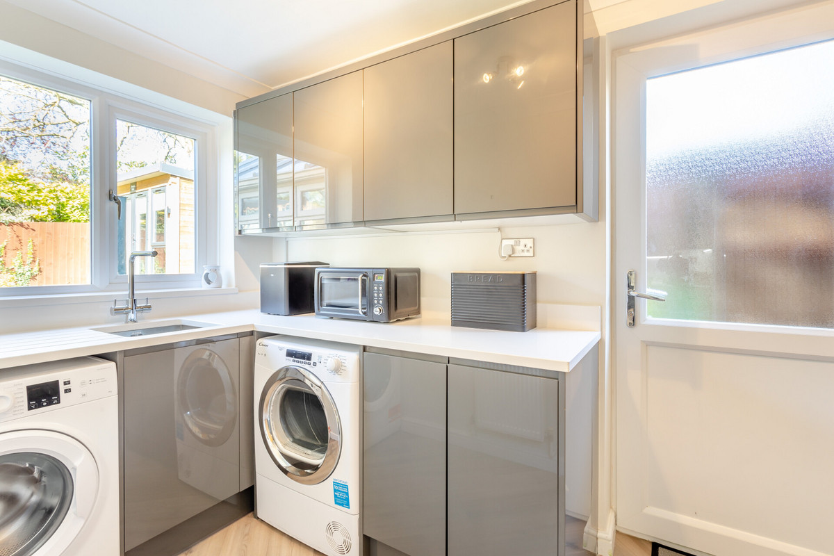 At the heart of the home lies an expansive open-plan kitchen, dining, and conservatory area – perfect for family life and entertaining. The kitchen is fully fitted with a premium range of sleek units, quartz work surfaces, Quooker hot tap and integrated AEG appliances. The generous dining area seamlessly flows into the conservatory, offering garden views and an abundance of natural light. A separate utility/laundry room ensures everything has its place.