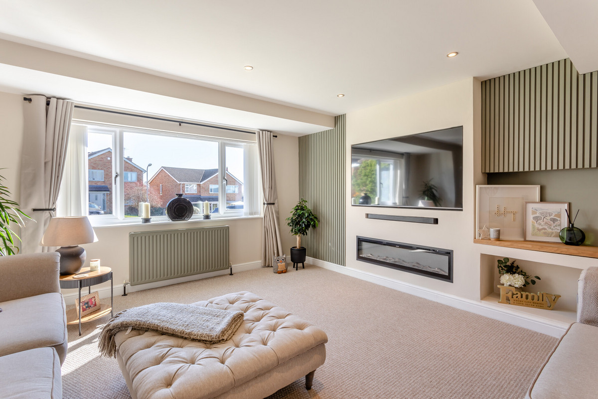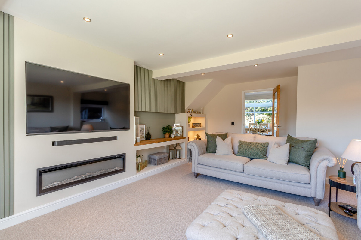 To the front of the house, a further beautifully presented large family room features bespoke fitted bookshelves with concealed lighting, creating an elegant library area. This space also houses a home entertainment zone with a modern inset fire, ideal for cozy movie nights or relaxed entertaining.