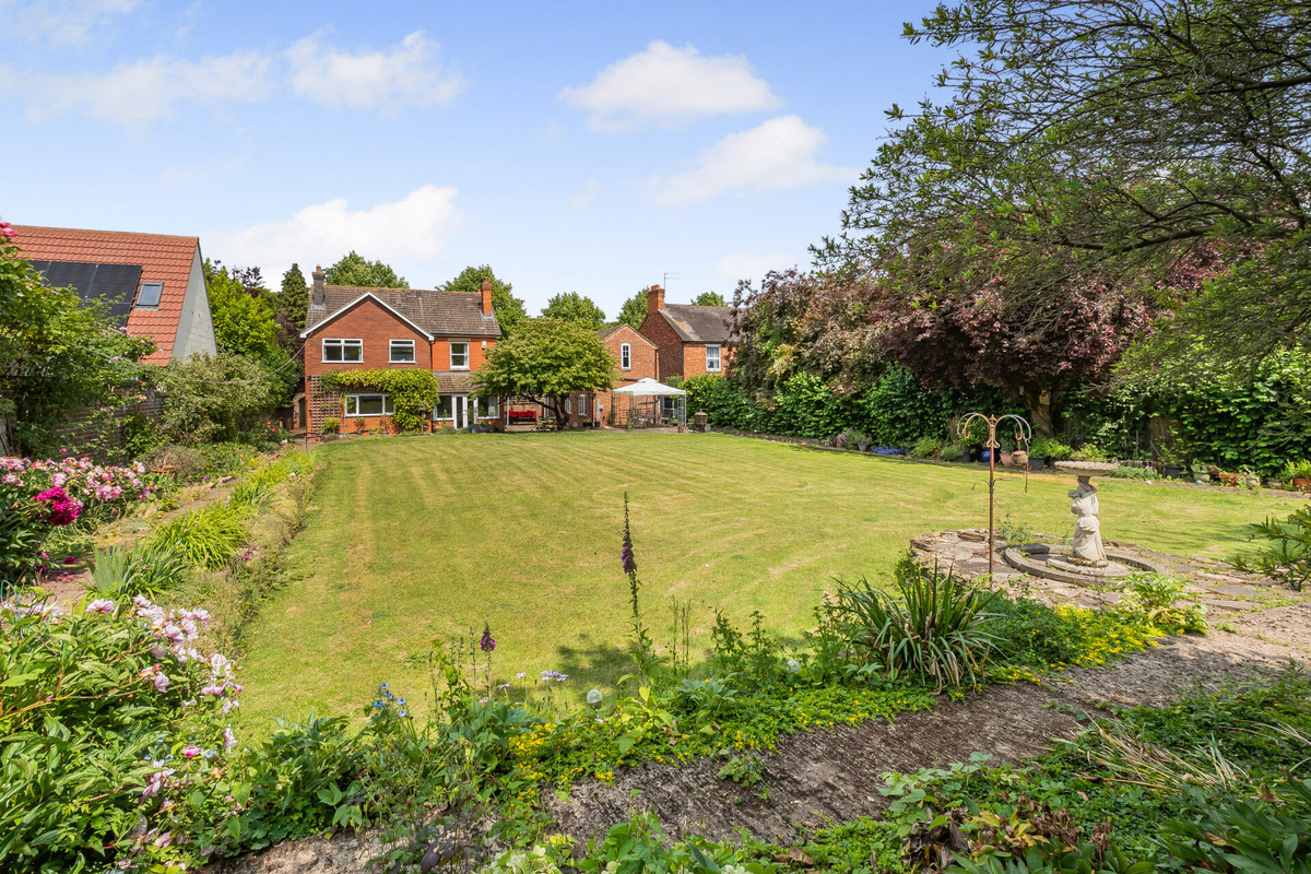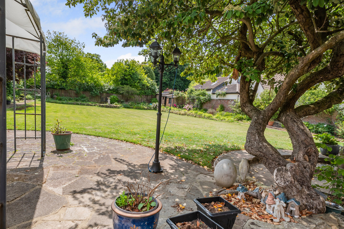 The rear garden is south-east facing and features a large paved terrace to the side and rear—ideal for outdoor dining and entertaining. The remainder of the garden is mainly laid to lawn, with mature trees, hedging, and a variety of shrubs offering excellent privacy. In total, the plot extends to approximately 0.36 acre.