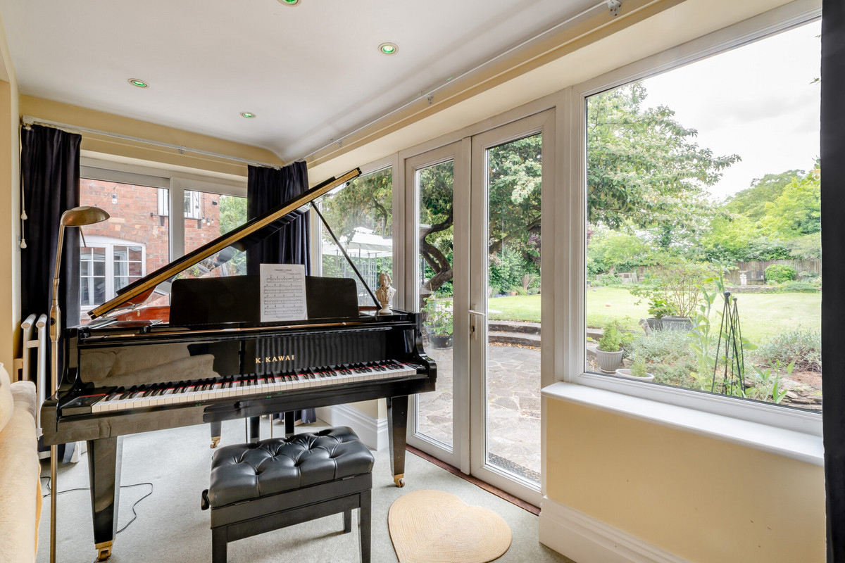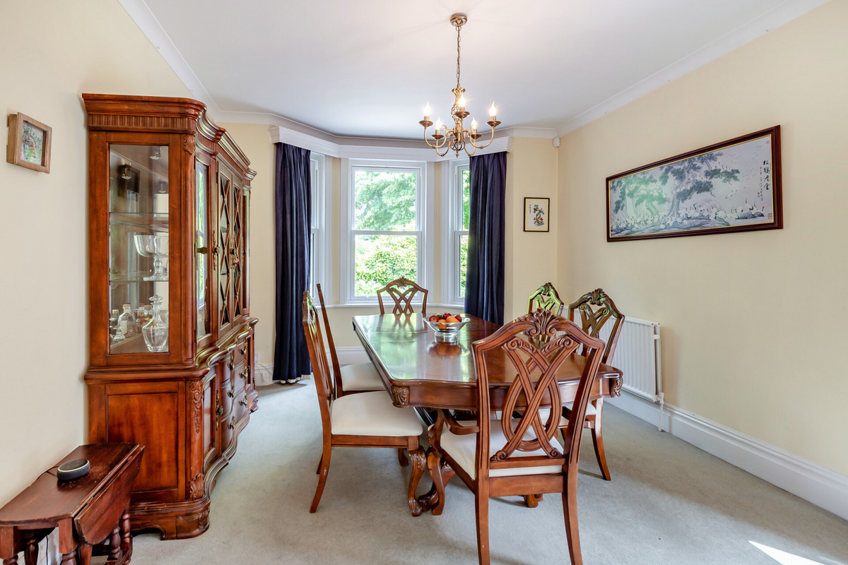 To the left of the hall is the dining room, again with a bay window to the front and a glazed door to the side leading out onto the sun terrace. Double doors open into the lovely, bright main reception room, which overlooks the rear garden. This room has been extended to the rear and includes French doors leading out into the garden. It is a wonderfully light and airy space, with a period-style fireplace and stained-glass windows to the side.