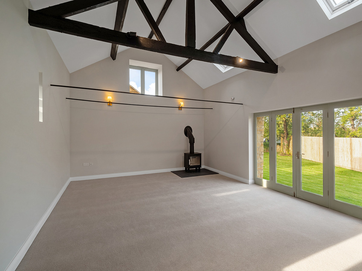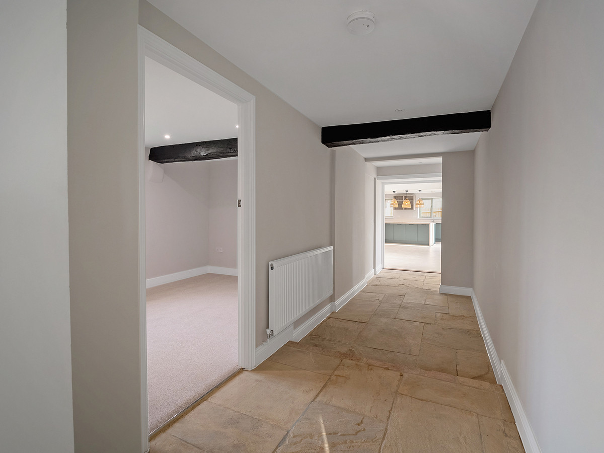 The house is approached through a landscaped front garden with lawn and bay trees leading to a panelled front door. On entering you are greeted by a welcoming hallway with a stone flagged floor. On the left is the main reception room which is a beautifully bright room with doors opening to the garden and terrace, there is a beamed vaulted ceiling and a wood burner.