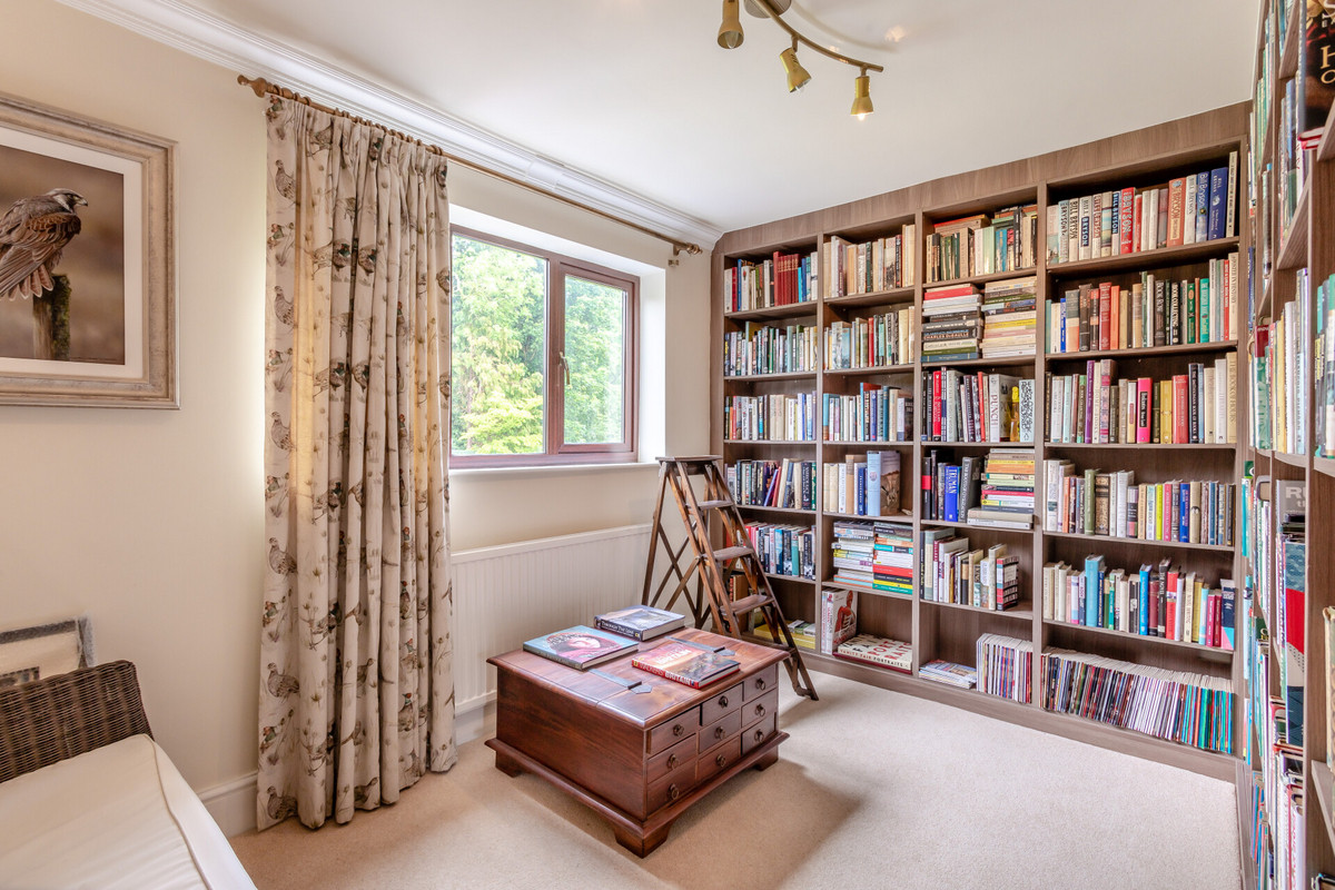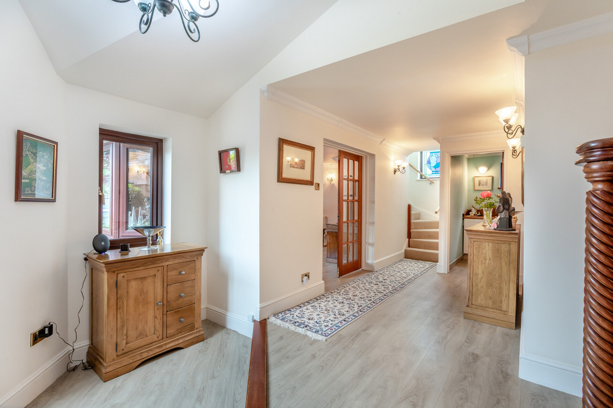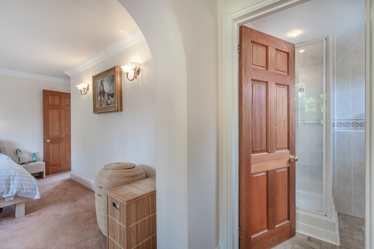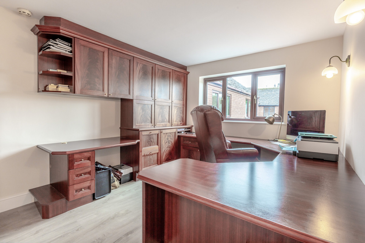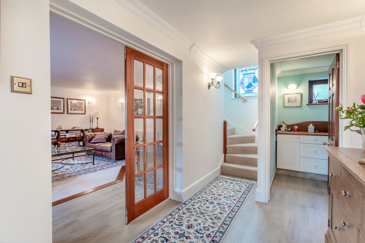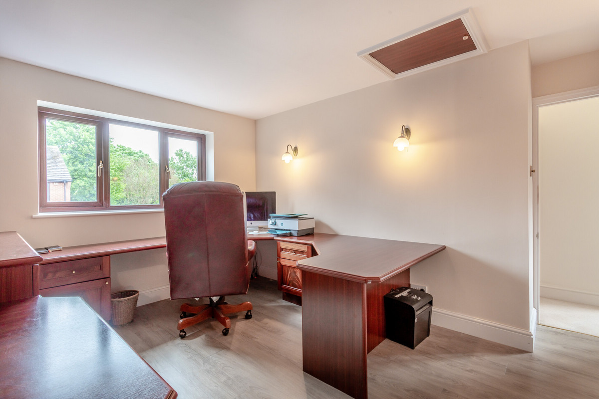 On the first floor leading from the main staircase there are three double bedrooms, a study and a luxurious family bathroom. The main bedroom suite overlooks the rear garden and is a great size with a separate dressing room and an en suite shower room. On the other first floor wing accessed by a separate staircase are a further two double bedrooms both with fitted wardrobes and en-suite shower rooms and a fully fitted home office.