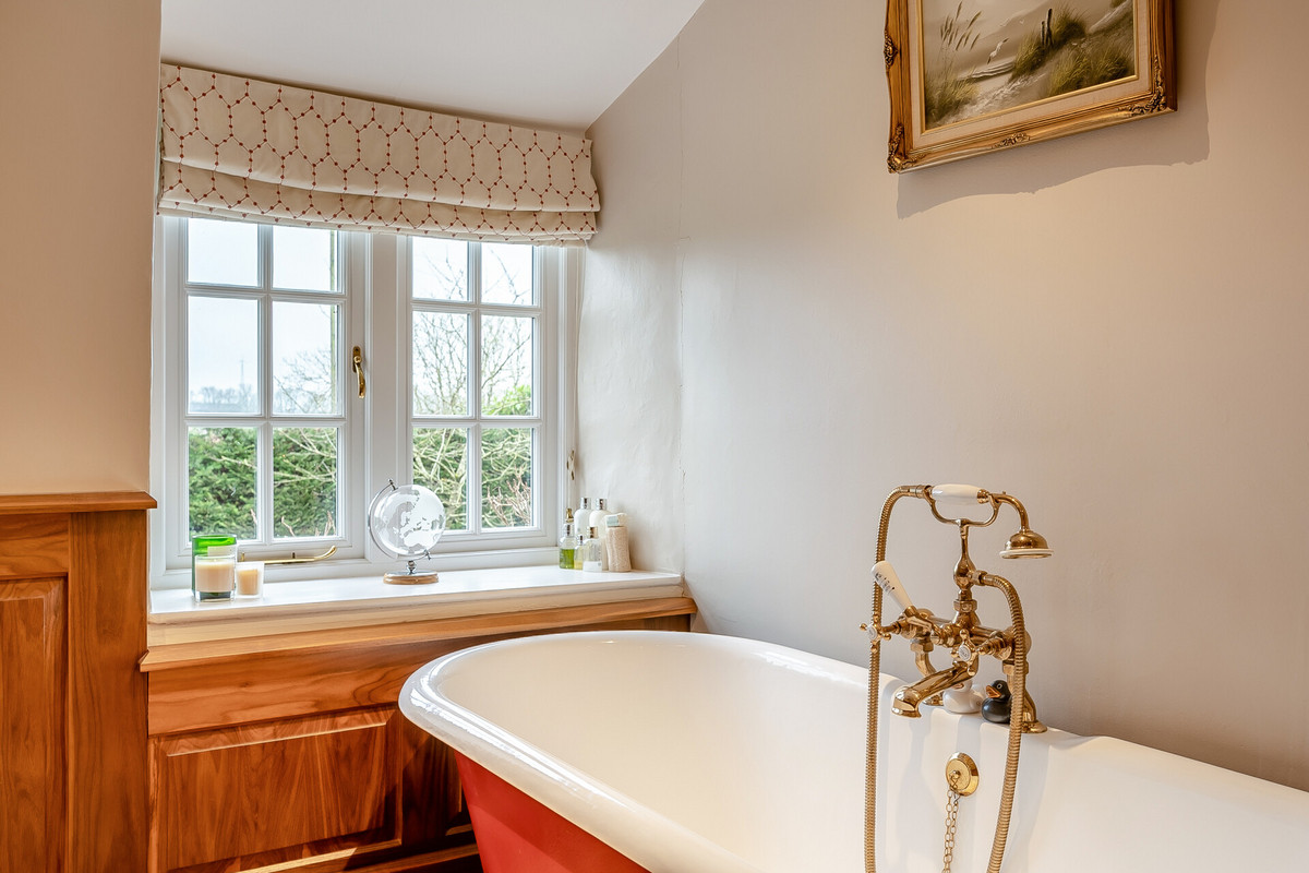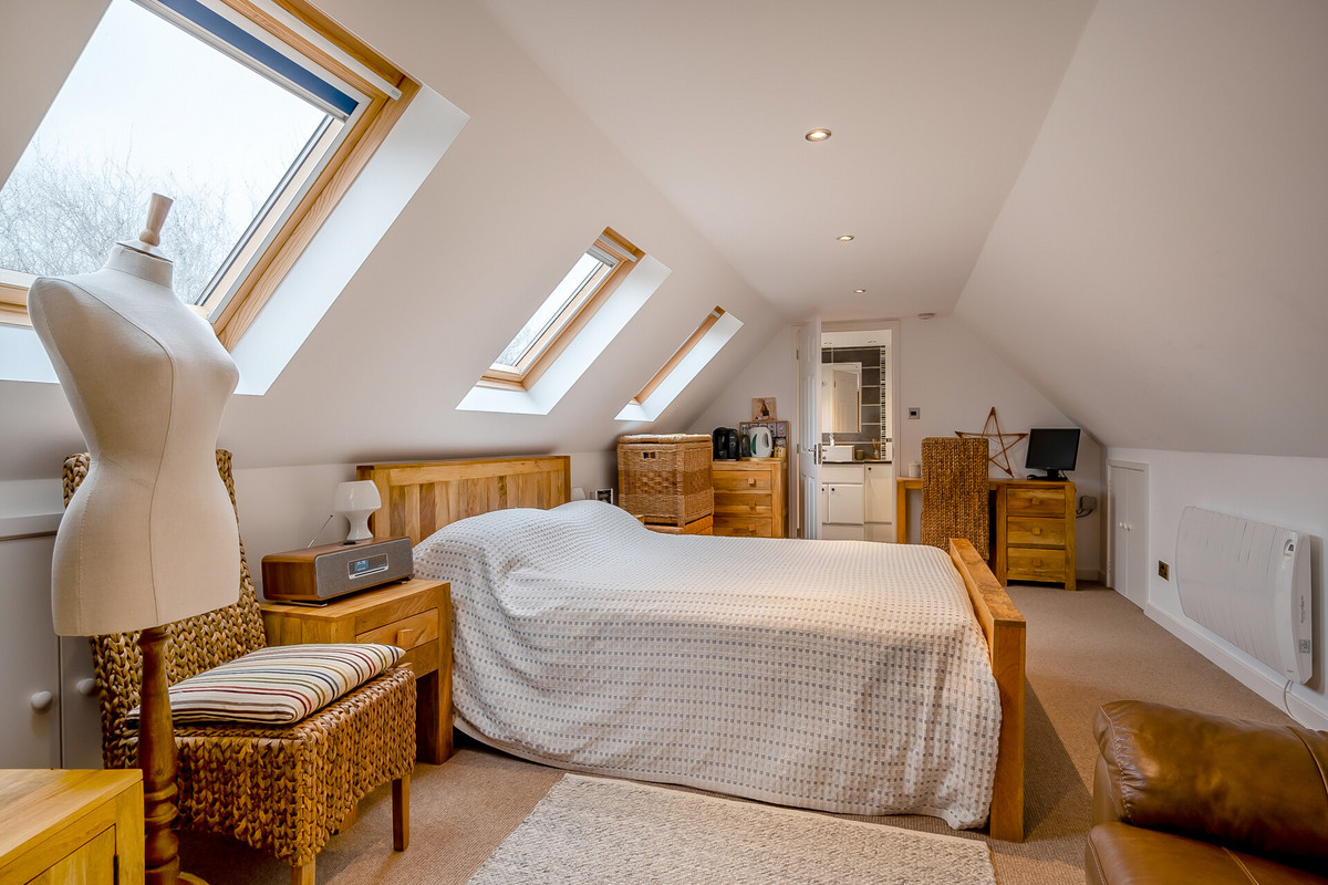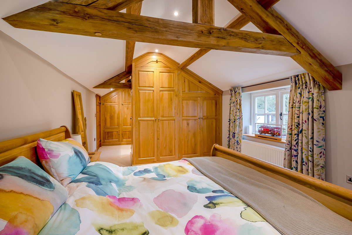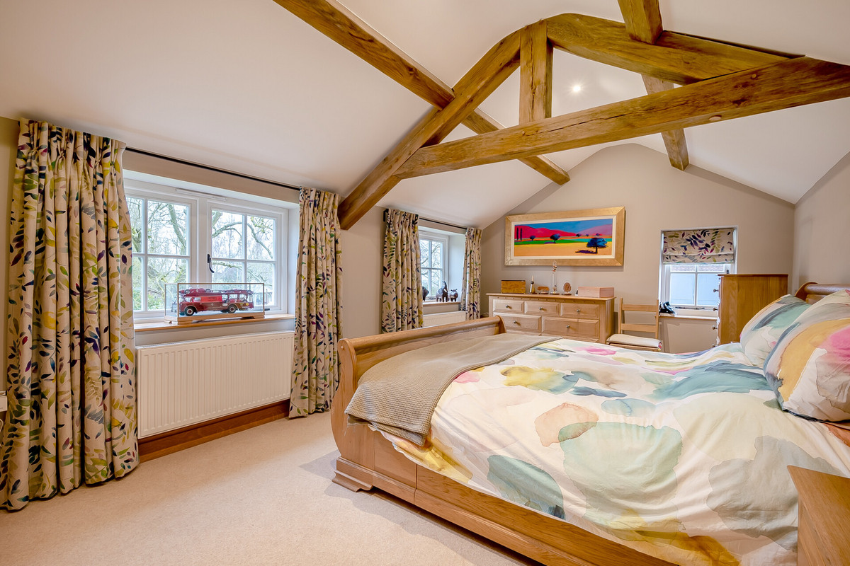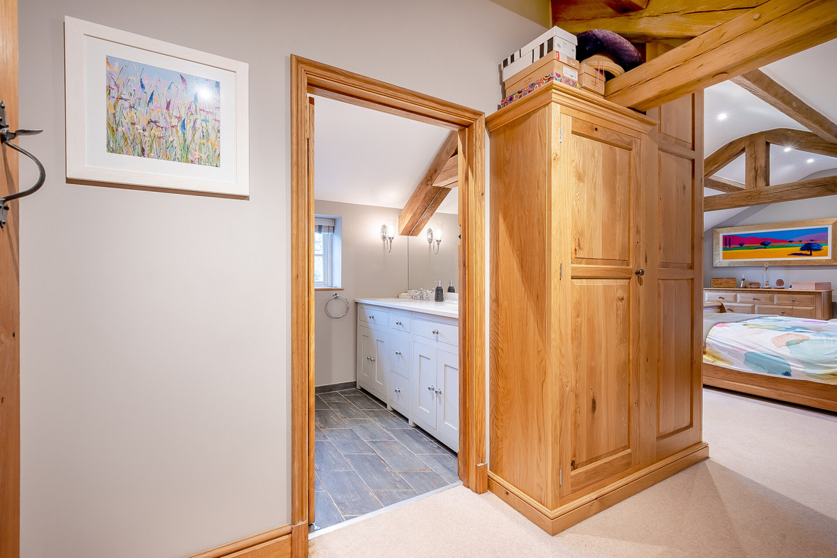 On the first floor there are four bedrooms. The main bedroom is an exceptional size overlooking the gardens, it has a vaulted ceiling with oak beams, a dressing area fitted with bespoke oak wardrobes and a luxurious en-suite shower room. There are a further three bedrooms, one is a large guest bedroom with en-suite shower, plus a further double and single bedroom that share a superb family bathroom with roll top freestanding bath.
