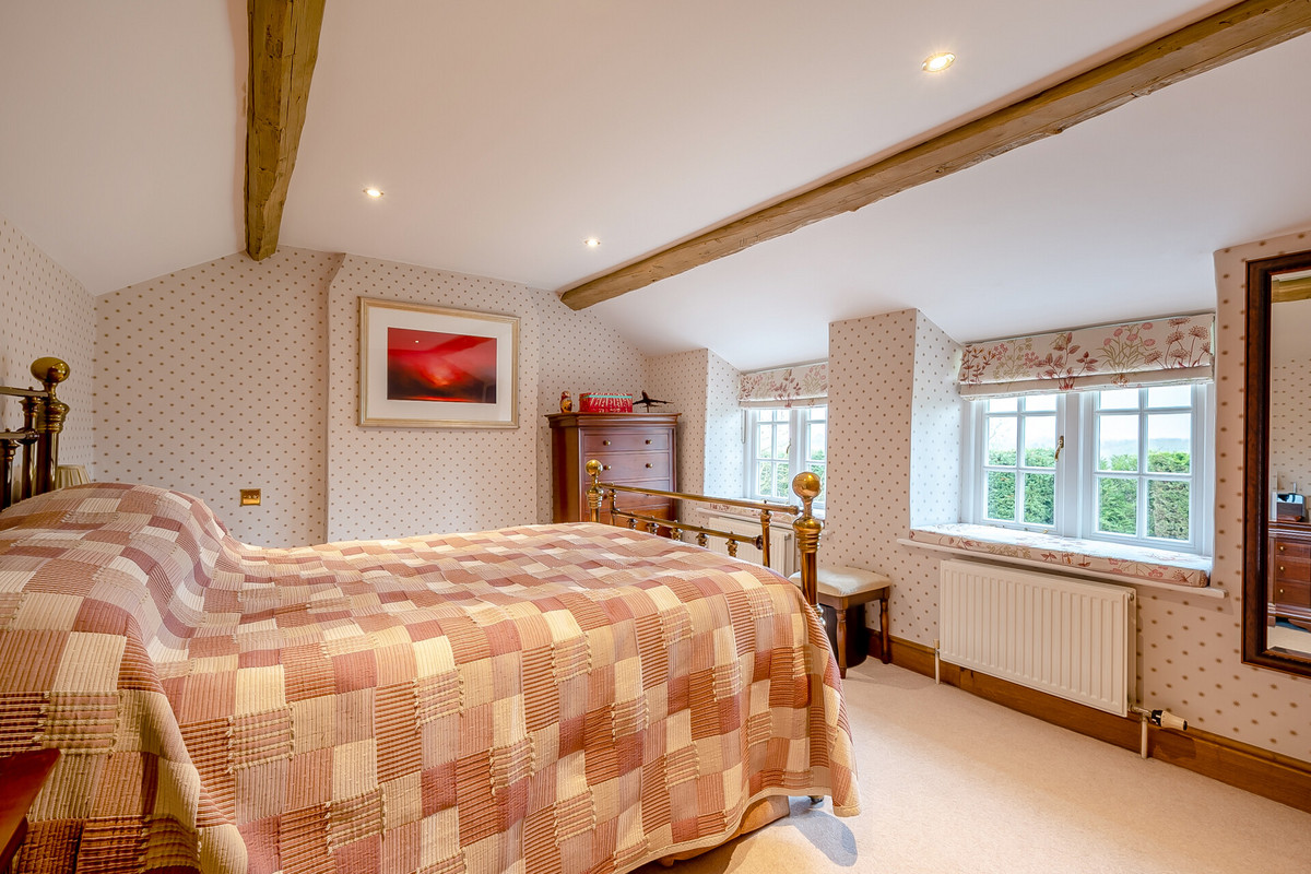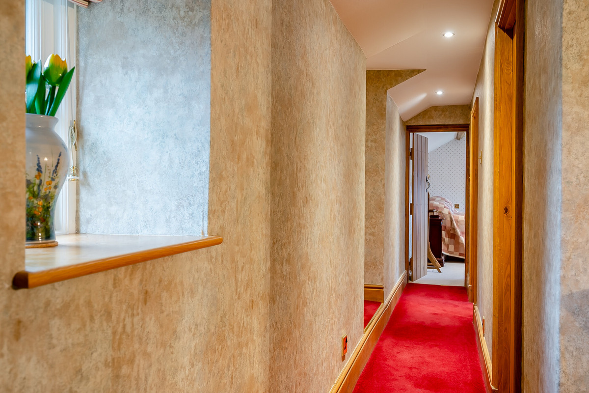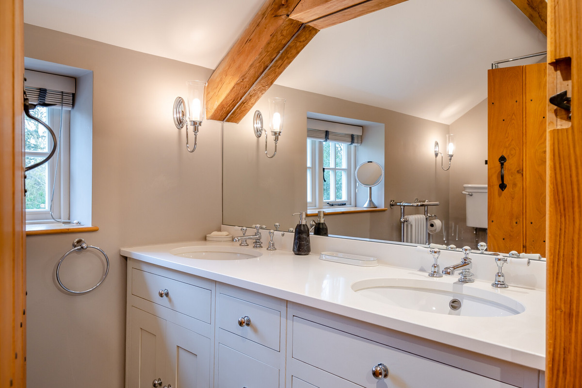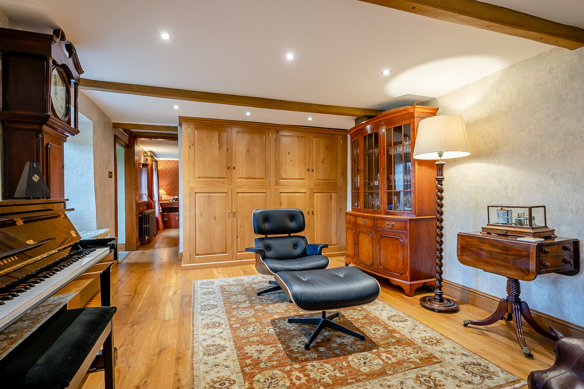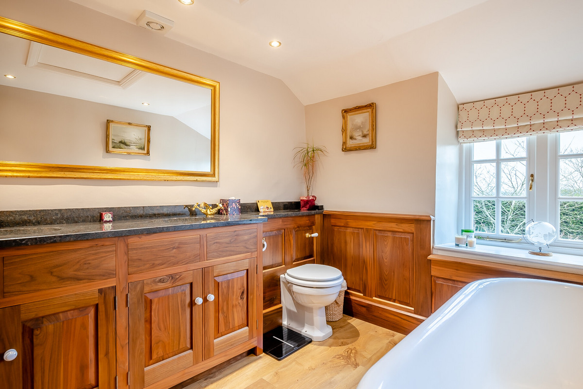 On the first floor there are four bedrooms. The main bedroom is an exceptional size overlooking the gardens, it has a vaulted ceiling with oak beams, a dressing area fitted with bespoke oak wardrobes and a luxurious en-suite shower room. There are a further three bedrooms, one is a large guest bedroom with en-suite shower, plus a further double and single bedroom that share a superb family bathroom with roll top freestanding bath.