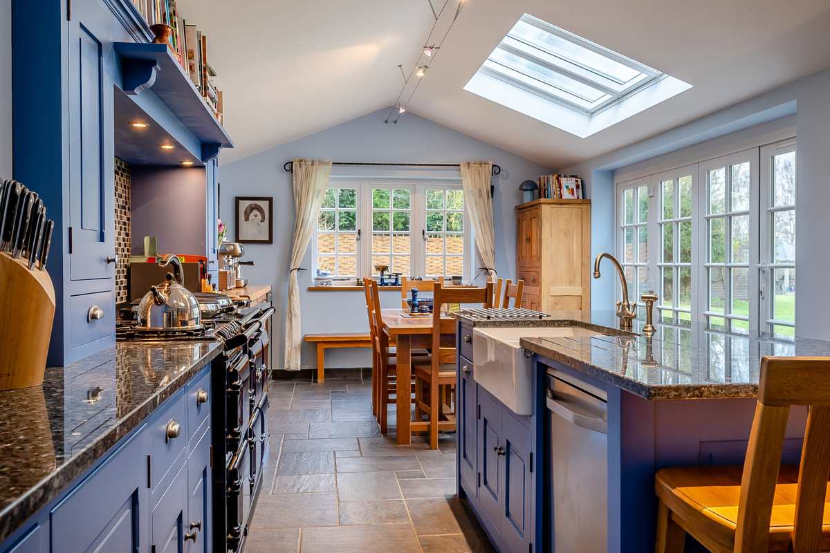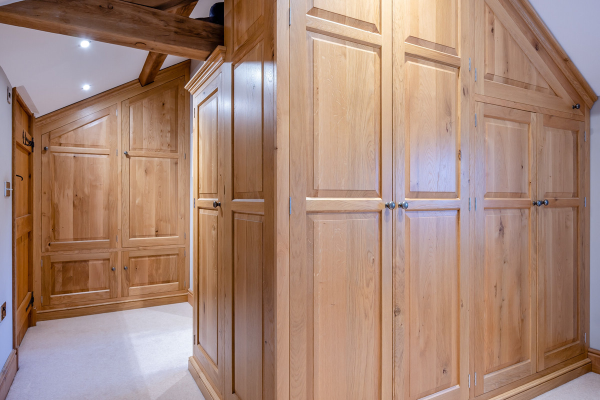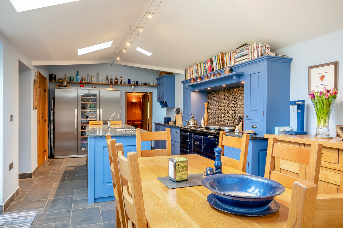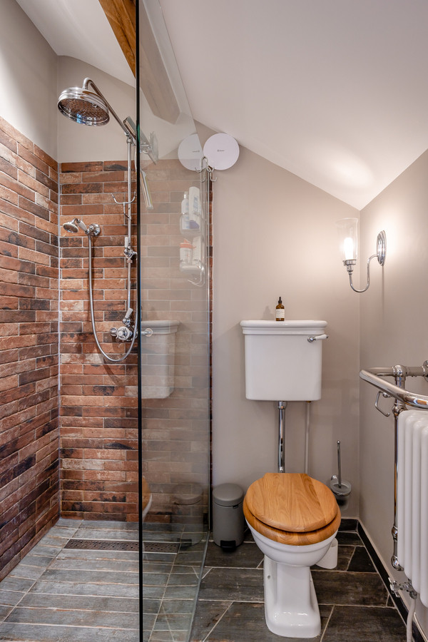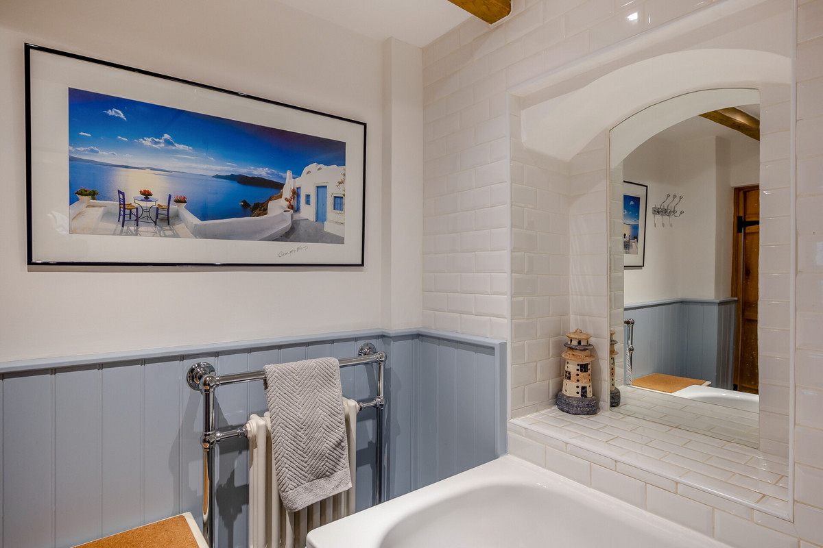 On the first floor there are four bedrooms. The main bedroom is an exceptional size overlooking the gardens, it has a vaulted ceiling with oak beams, a dressing area fitted with bespoke oak wardrobes and a luxurious en-suite shower room. There are a further three bedrooms, one is a large guest bedroom with en-suite shower, plus a further double and single bedroom that share a superb family bathroom with roll top freestanding bath.