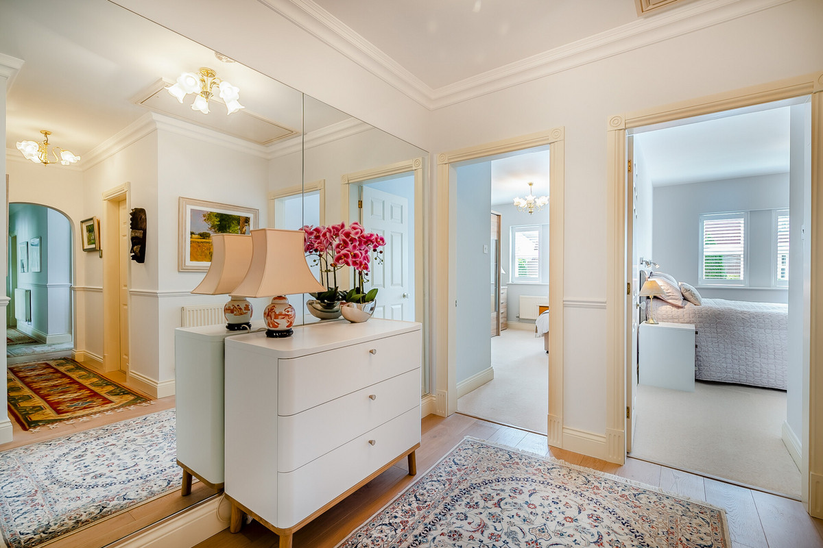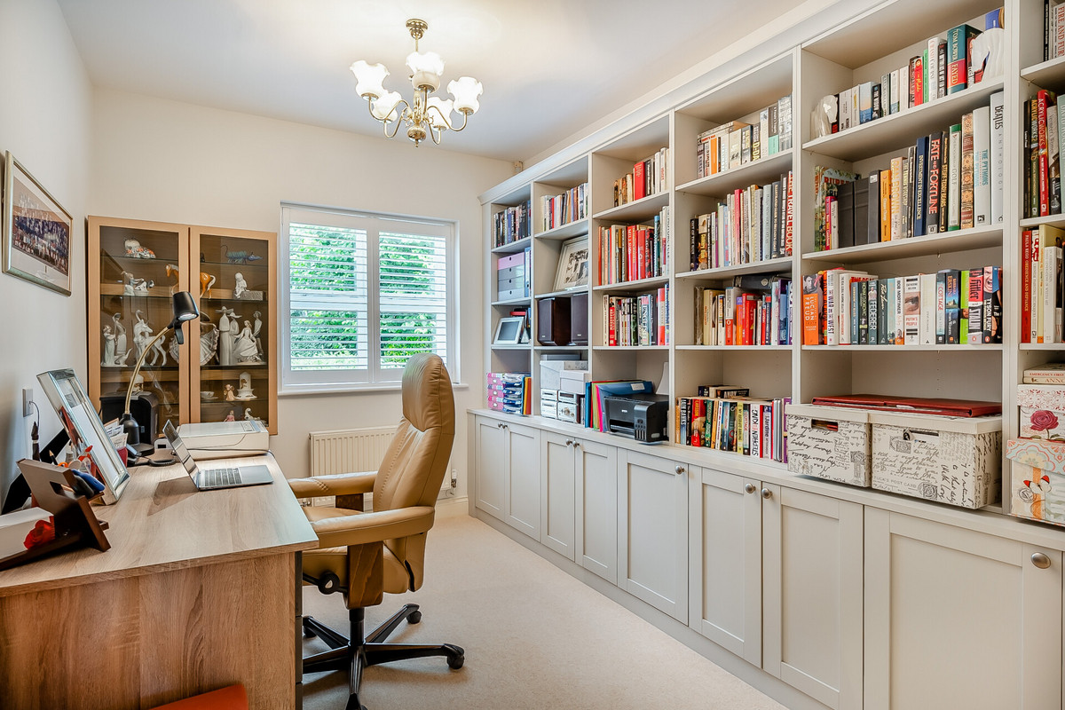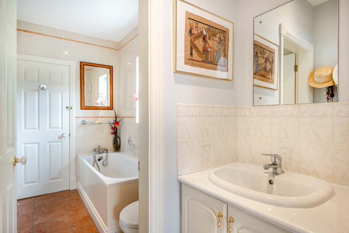 On the right of the hallway there are four double bedrooms, all are a good size with one being used and fitted as an office/library. There is a family bathroom and a jack and jill en suite serving two bedrooms. The main bedroom is a lovely bright room with fitted wardrobes and doors opening to the rear garden and sun terraced, it has an en suite shower room. There is a further fifth double bedroom/sitting room on the upper floor in the eaves, it's a lovely room with views over the golf course.