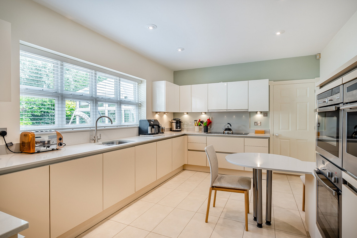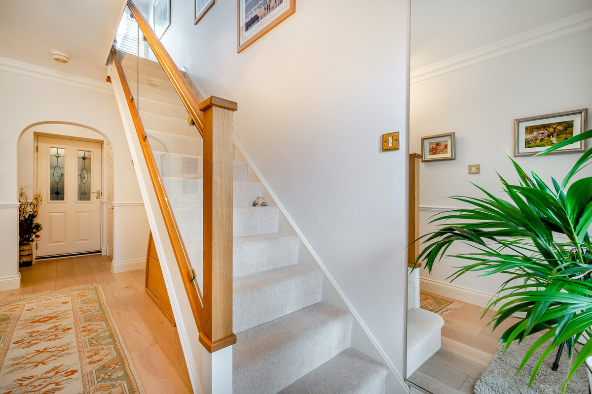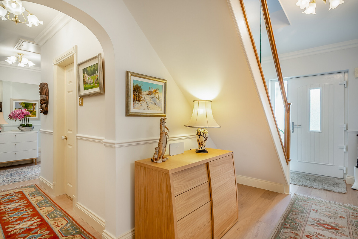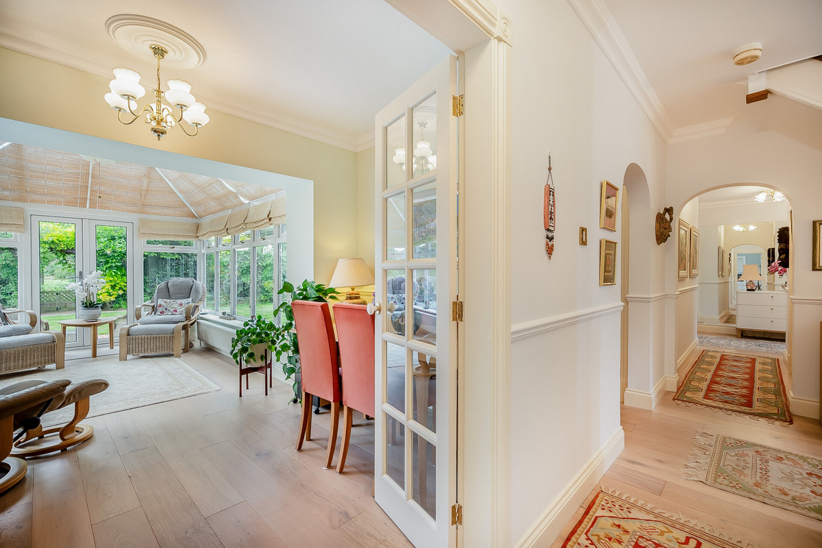 On entering you are greeted by a bright central hallway with an oak staircase to the upper floor. On the left, double doors open to a good size reception with a box bay window to the front and a fireplace. To the rear of the hallway is a further sitting/dining room which opens into a large conservatory with doors opening to the garden. The kitchen/breakfast room is a great size and is fitted with a bespoke range of Siematic units with integrated appliances, there is a separate utility room with access to the double garage.