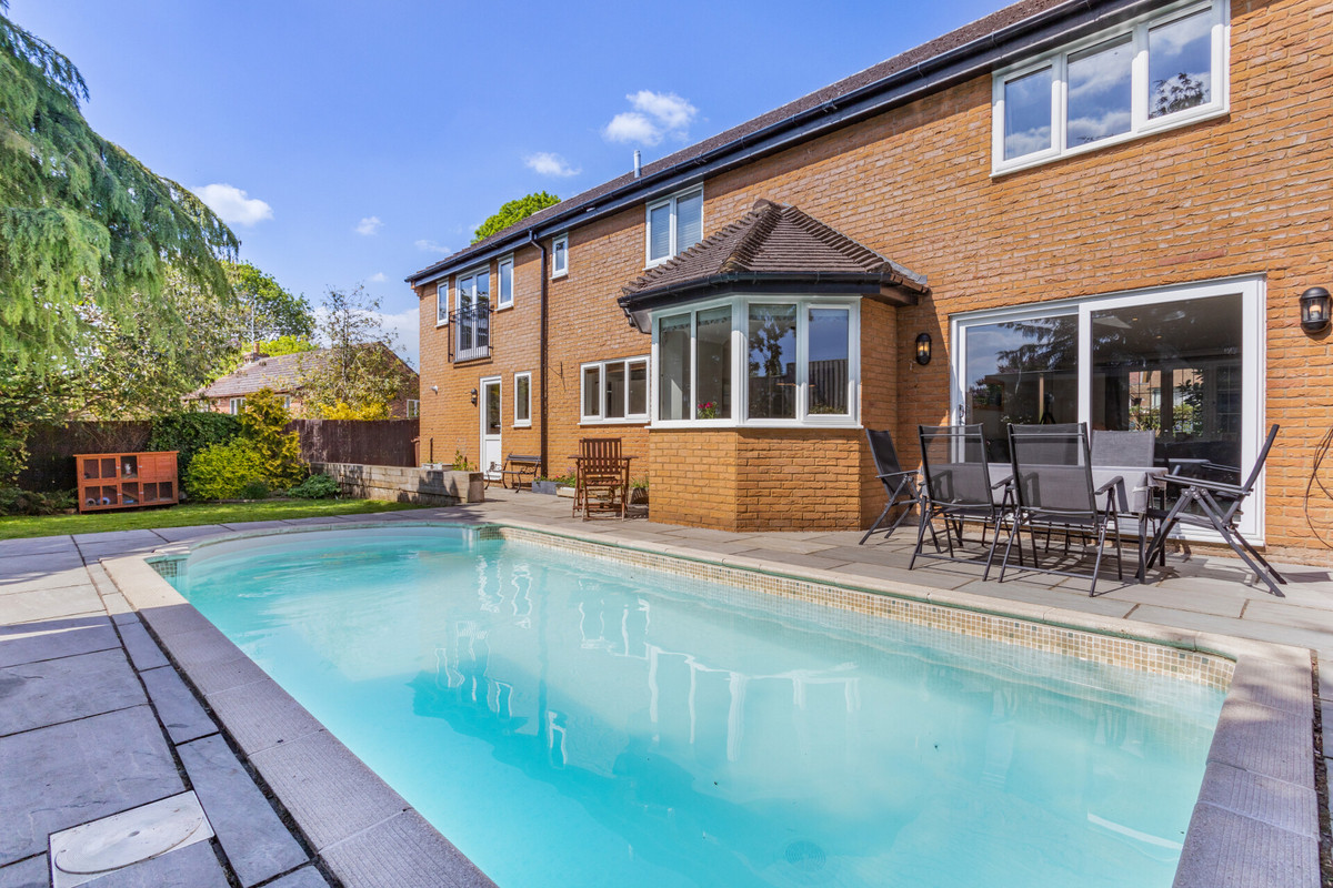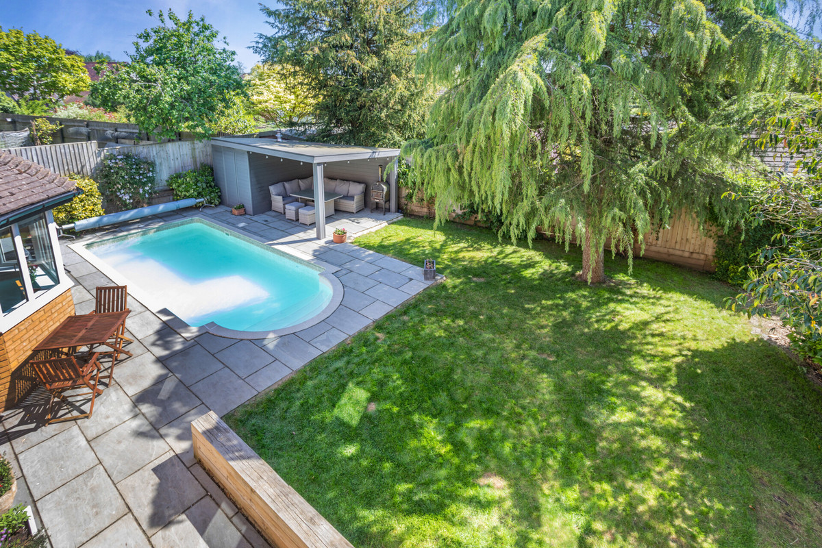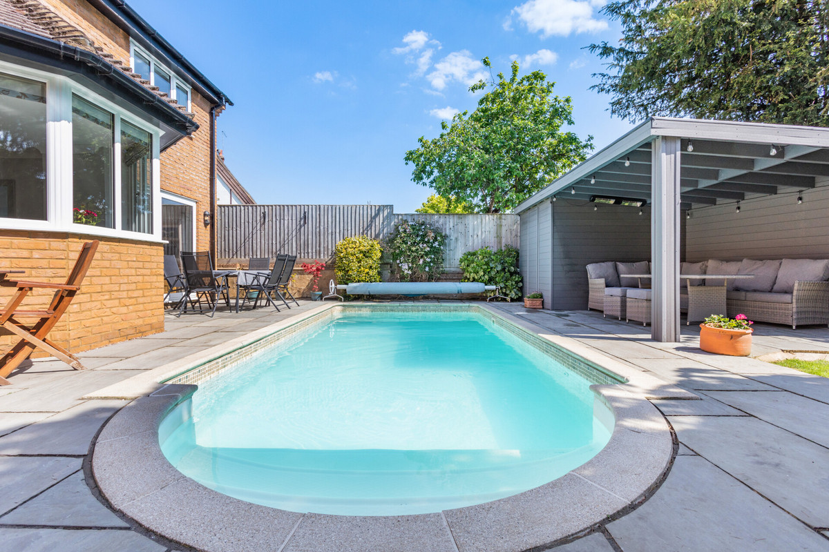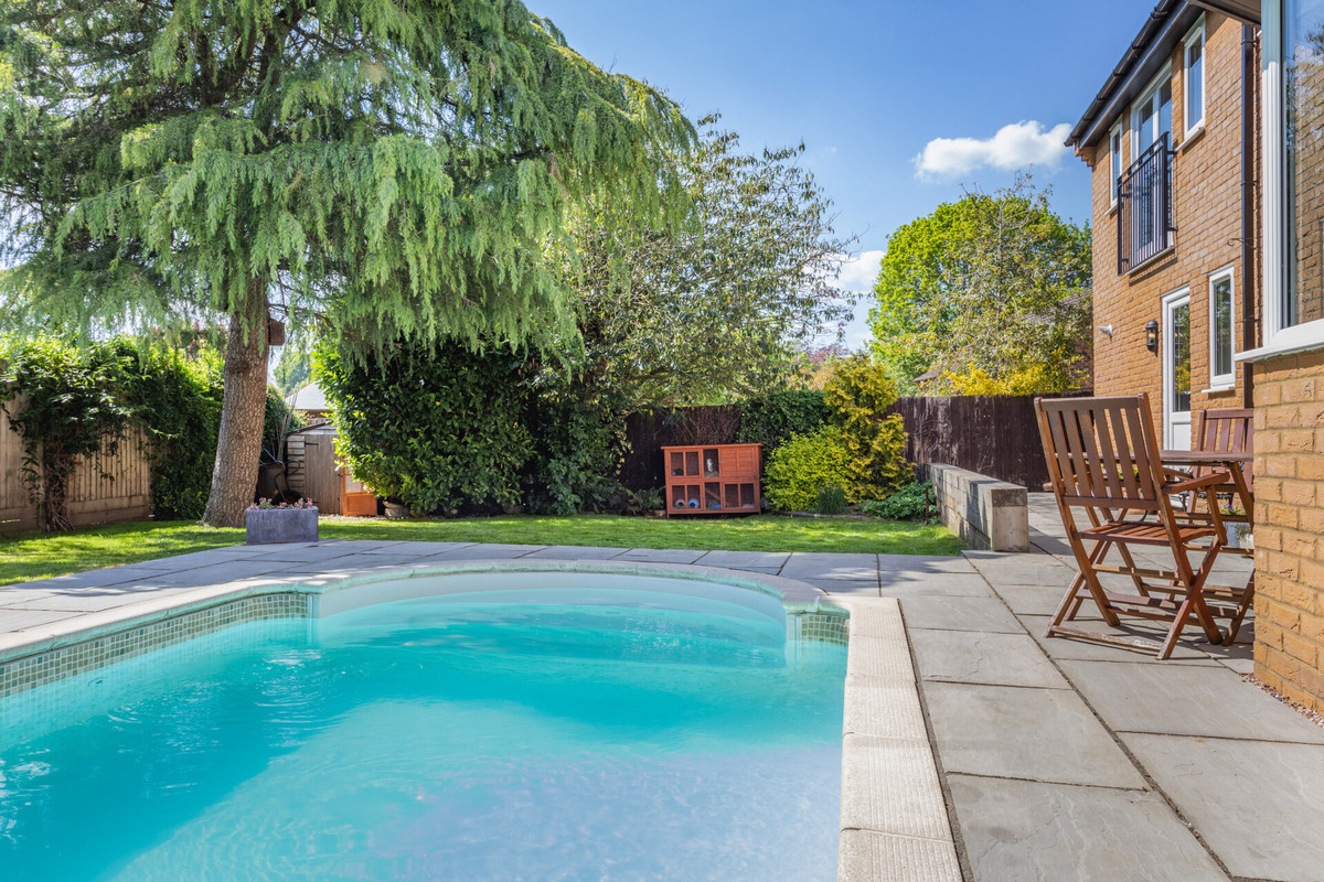 Outside, the home is set within a manicured plot at the end of a quiet lane. The front is a walled area with parking for two/three cars leading to an attached double garage with electric doors. To the rear, a private, south-west facing garden offers a sun-soaked lawn bordered by mature planting, as well as a decked pergola – perfect for al fresco dining or unwinding in the evening sun. The main feature of this lovely garden g#has to be the superb heated swimming pool with sun terrace.