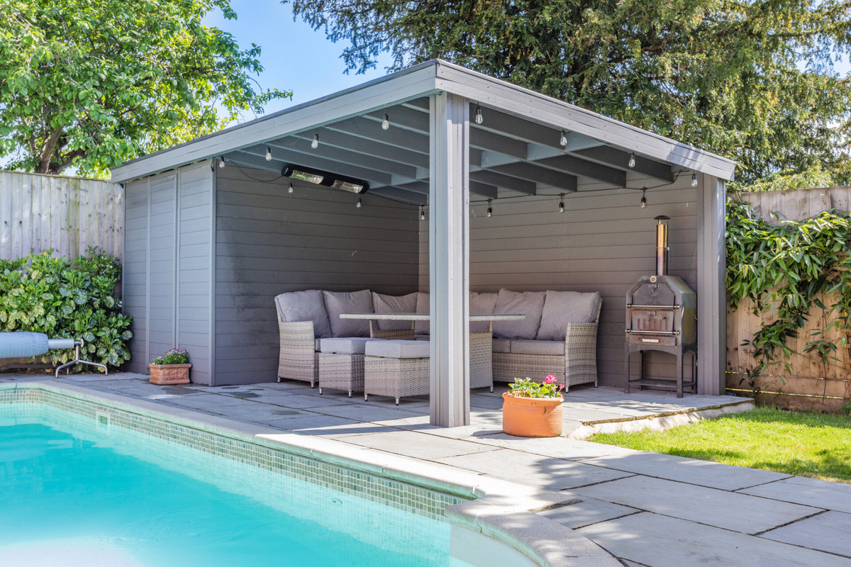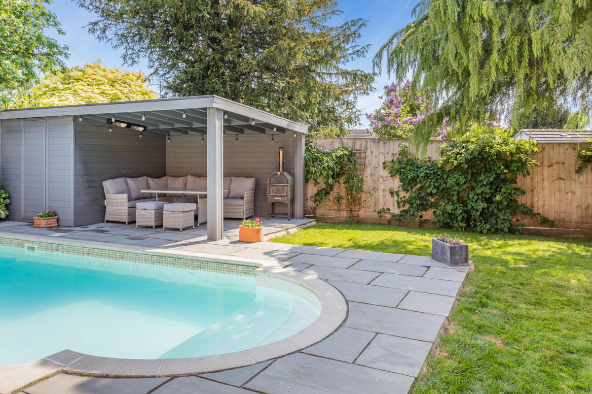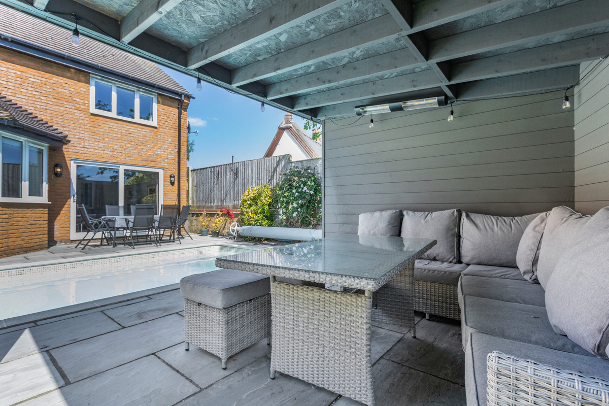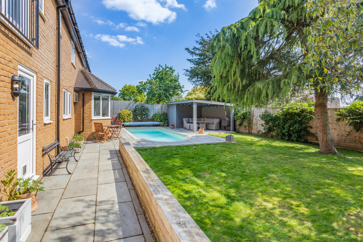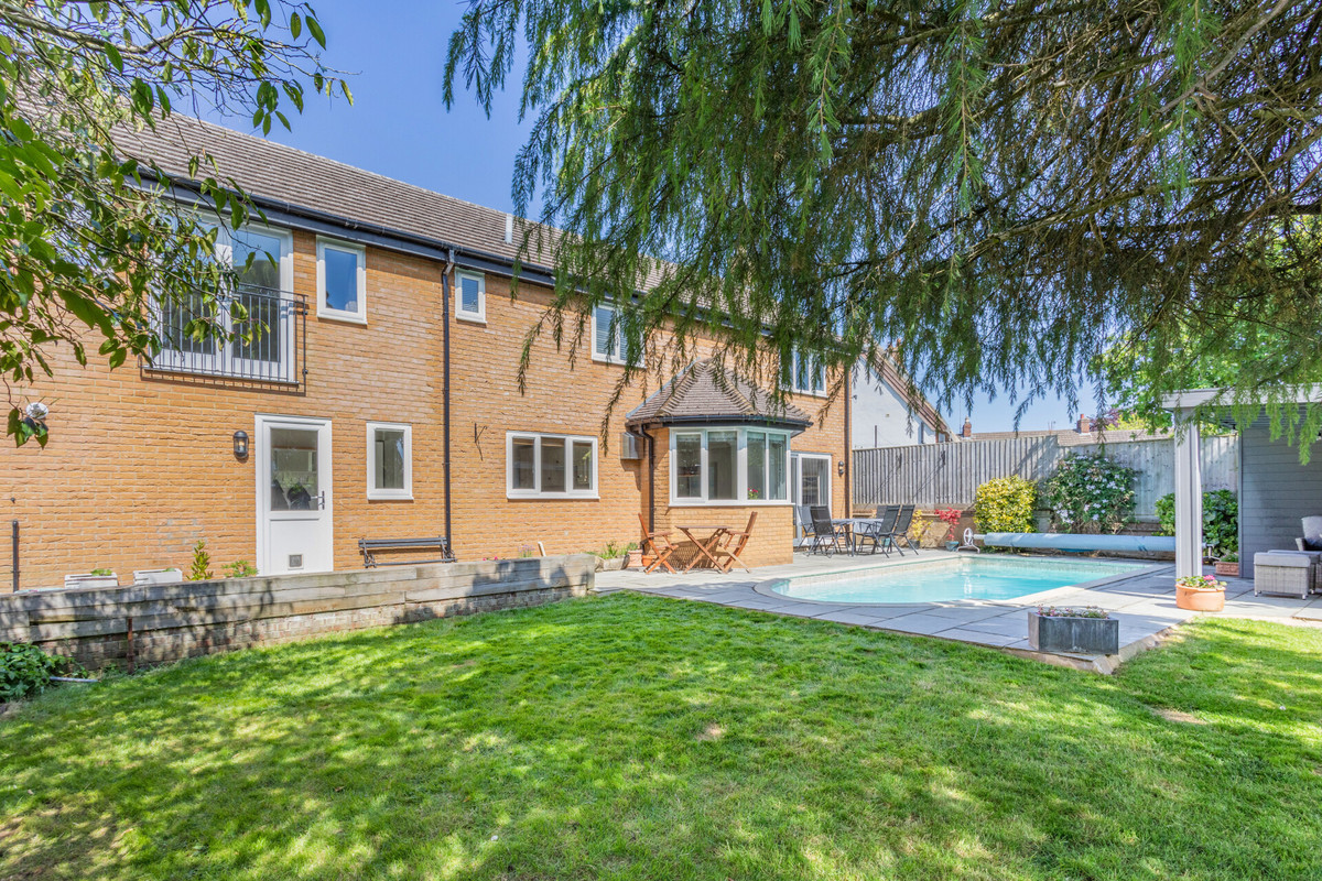 Outside, the home is set within a manicured plot at the end of a quiet lane. The front is a walled area with parking for two/three cars leading to an attached double garage with electric doors. To the rear, a private, south-west facing garden offers a sun-soaked lawn bordered by mature planting, as well as a decked pergola – perfect for al fresco dining or unwinding in the evening sun. The main feature of this lovely garden g#has to be the superb heated swimming pool with sun terrace.