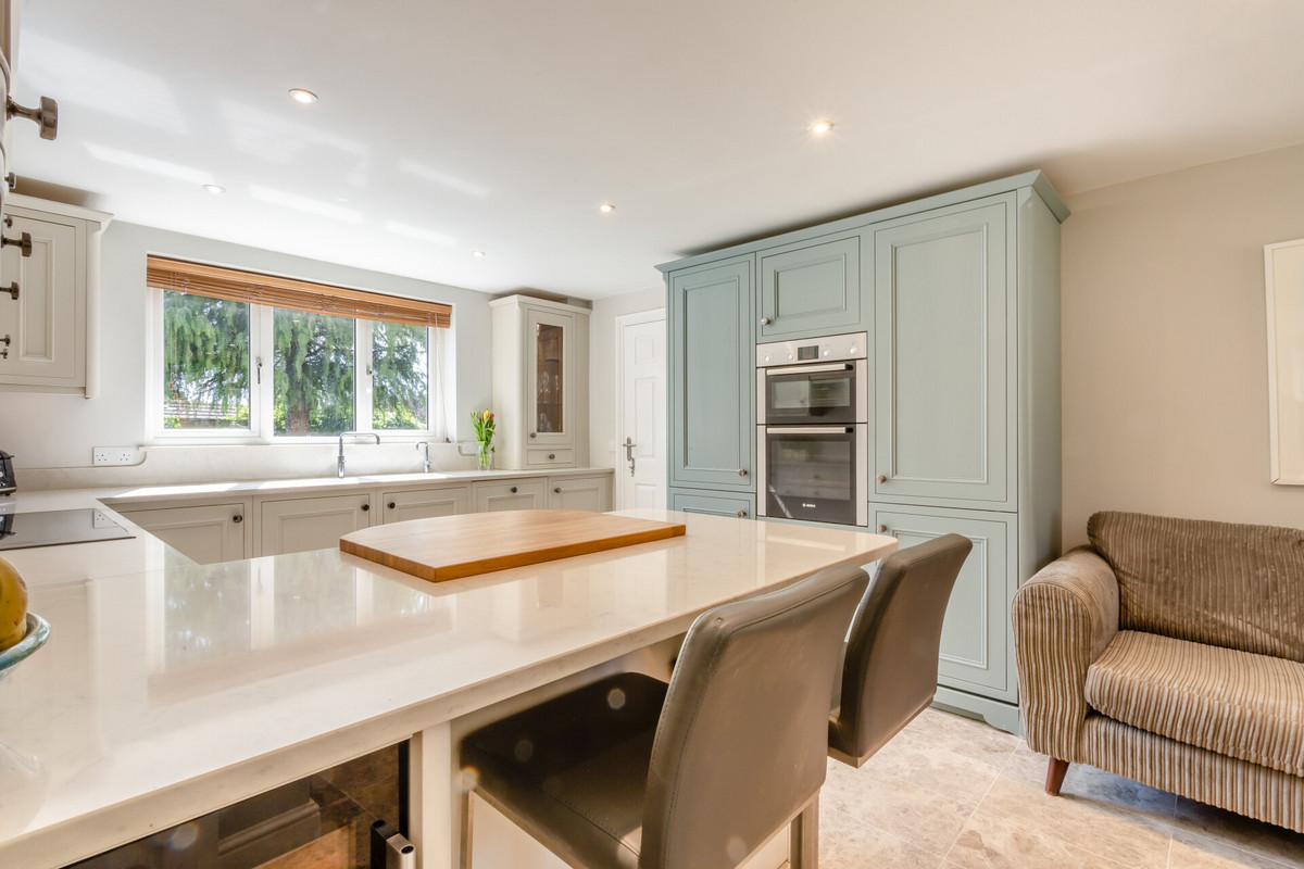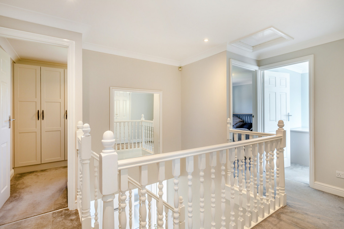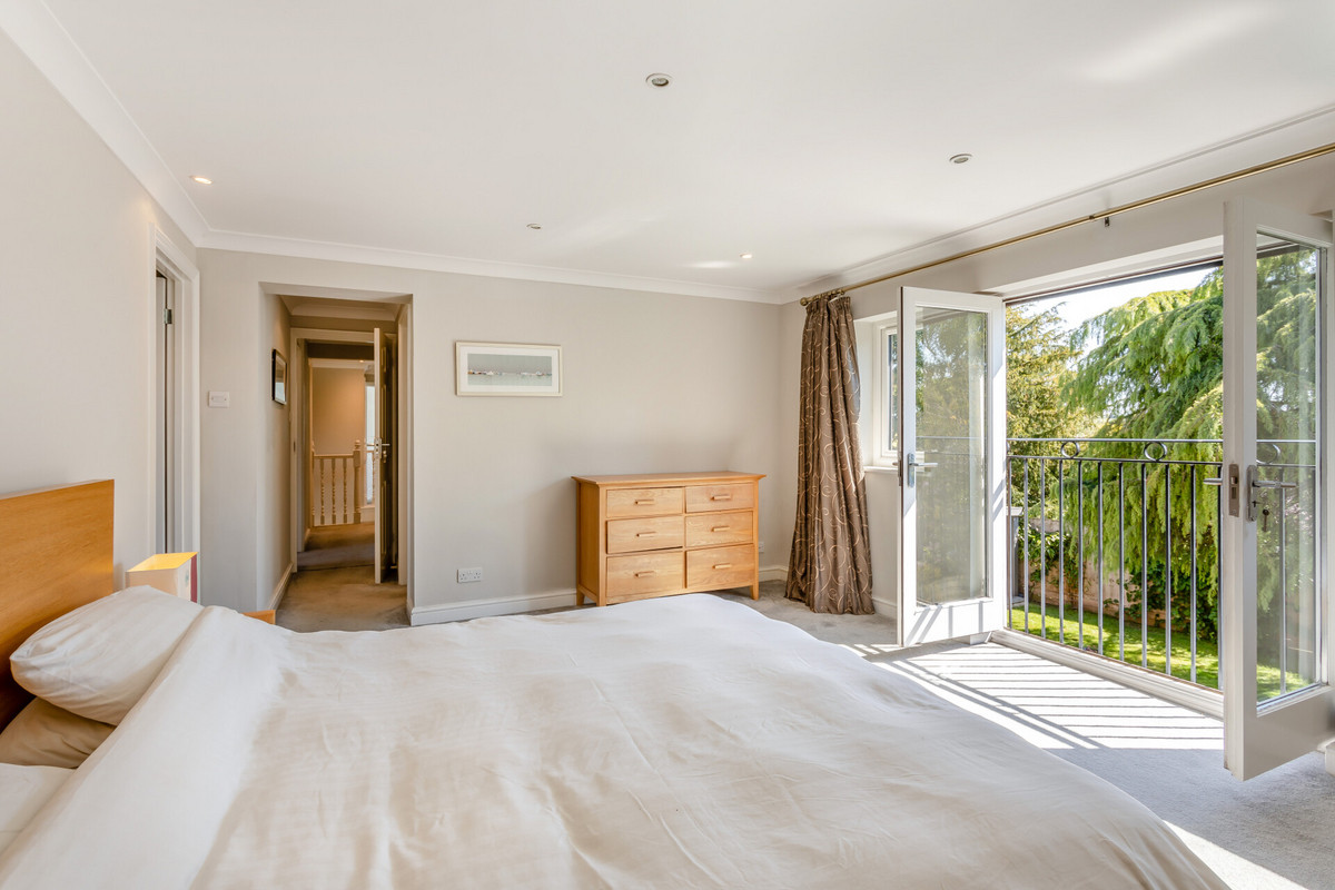 Upstairs, the galleried landing area leads to four generously proportioned double bedrooms plus a fifth bedroom/home office. The primary suite is a standout, offering a large double bedroom with glazed doors and a Juliet balcony overlooking the garden and pool, there is a dedicated dressing room, and a luxurious en-suite shower room. There are a further three double bedrooms and a smaller fifth bedroom with fitted cupboards and currently used as a home office. A stylish family bathroom with shower cubicle serves the remaining bedrooms.