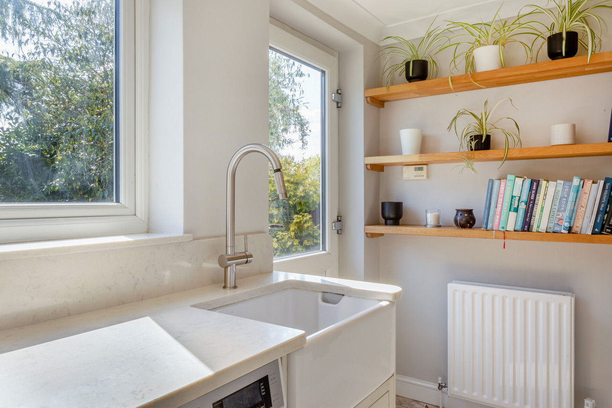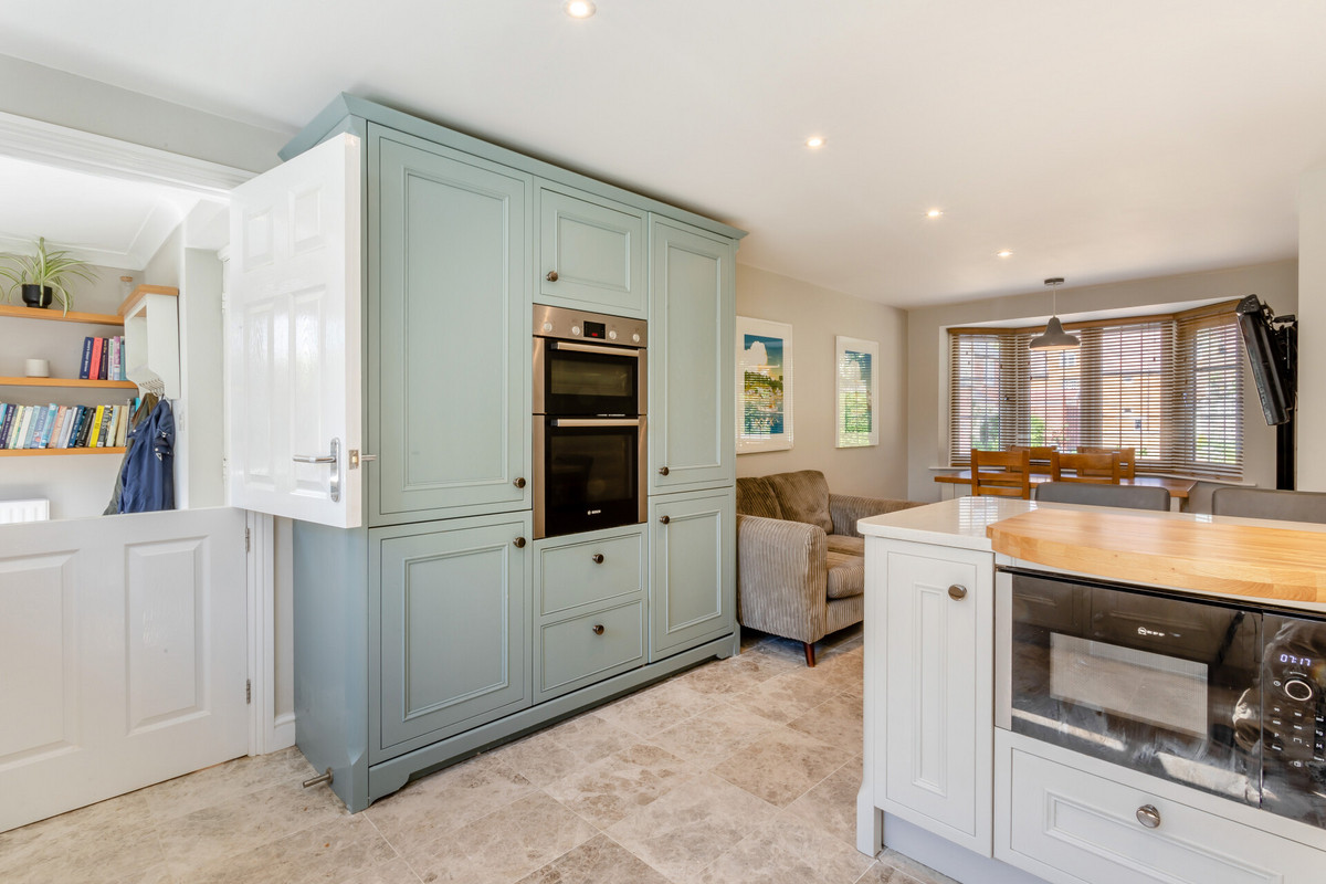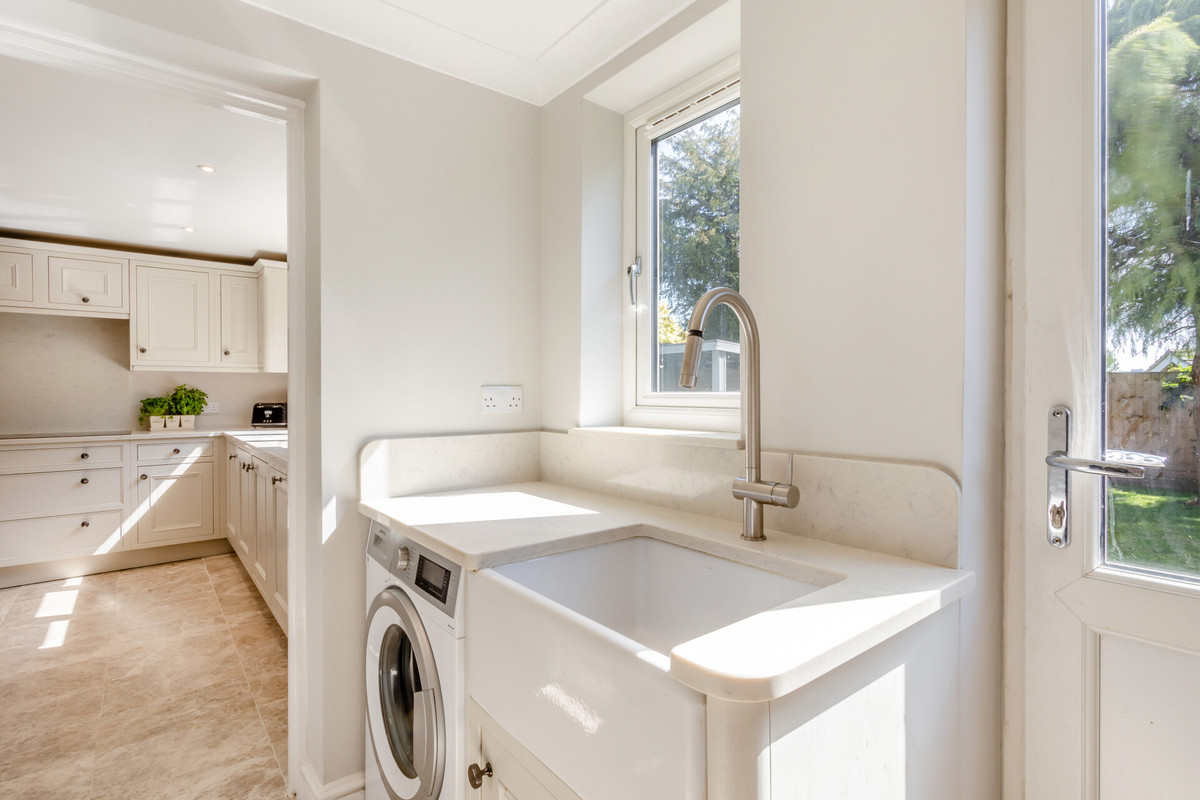 At the heart of the home lies a superb open-plan kitchen/dining which is perfect for family life and entertaining. The kitchen is fully fitted with a premium range of traditional Shaker style sleek units in contrasting shades of grey and blue with quartz work surfaces, integrated chopping block and integrated appliances including a fridge, freezer, dishwasher, induction hob, double oven and microwave . To the front of the kitchen is a generous dining area with a bay window overlooking the front. A separate utility/laundry room with butlers sink and plenty of cupboard space and access to the rear garden and also the integral double garage.
