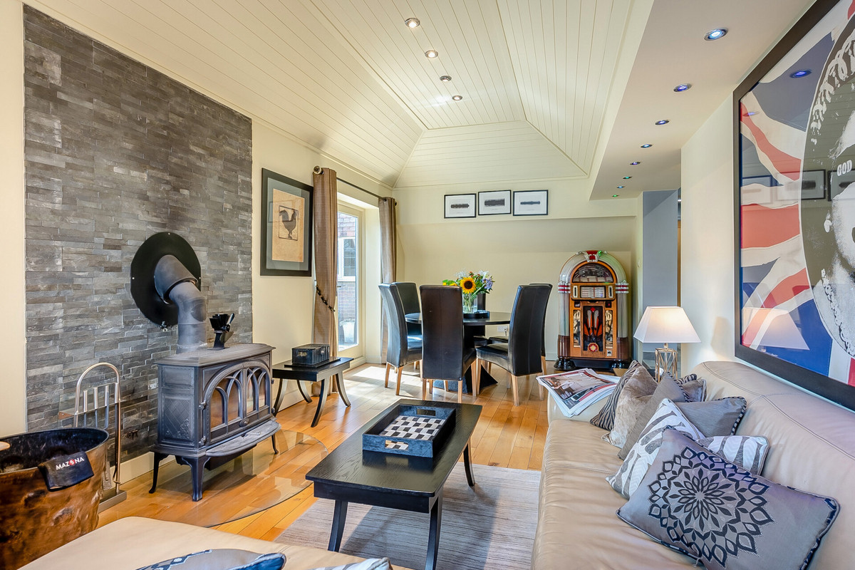 On the left of the main hallway the feel of the house becomes more contemporary with a vast open plan, split level, family kitchen/dining and family room. The sitting area is a good size with window to the front overlooking the front garden, it has a contemporary style living flame electric fire inset into the wall and feature inset mood lighting. This opens into a bright and spacious kitchen/breakfast room which is fitted with an extensive range of sleek white wall and base units with integrated appliances, there is a breakfast area with French doors opening to the walled courtyard. There is a separate utility room. From the main sitting area steps lead down to a further family room which is lovely bright room with a vaulted ceiling and glazed doors leading to the rear garden.