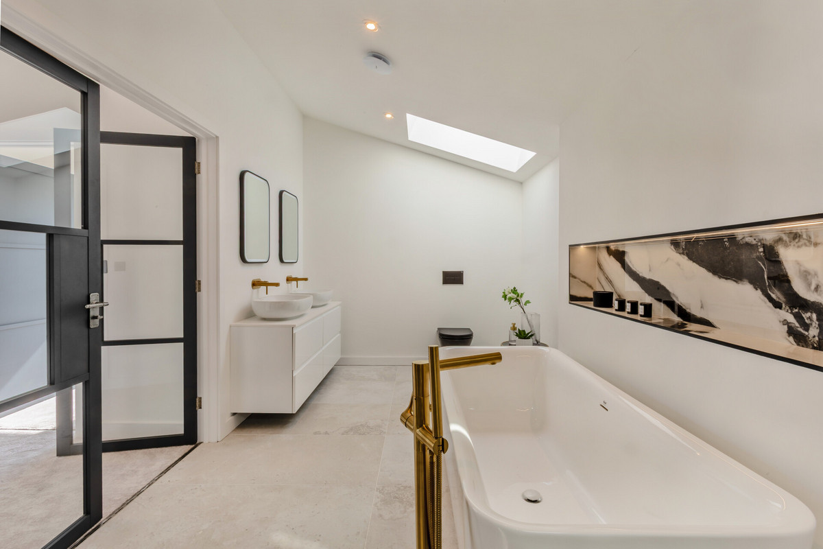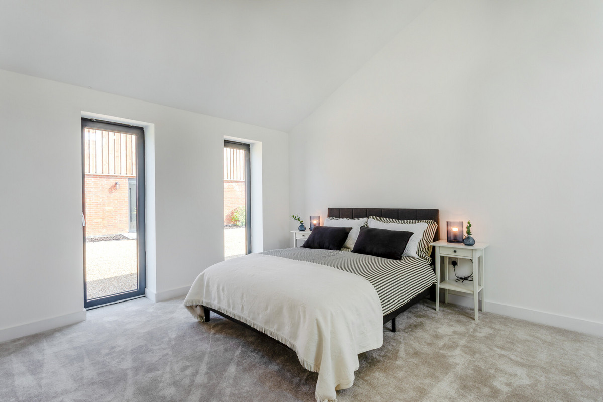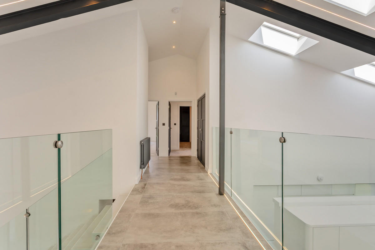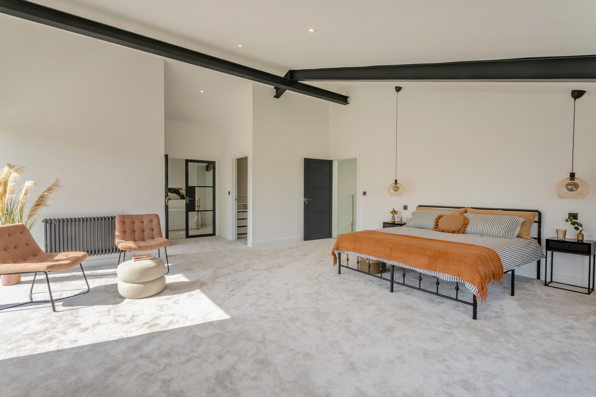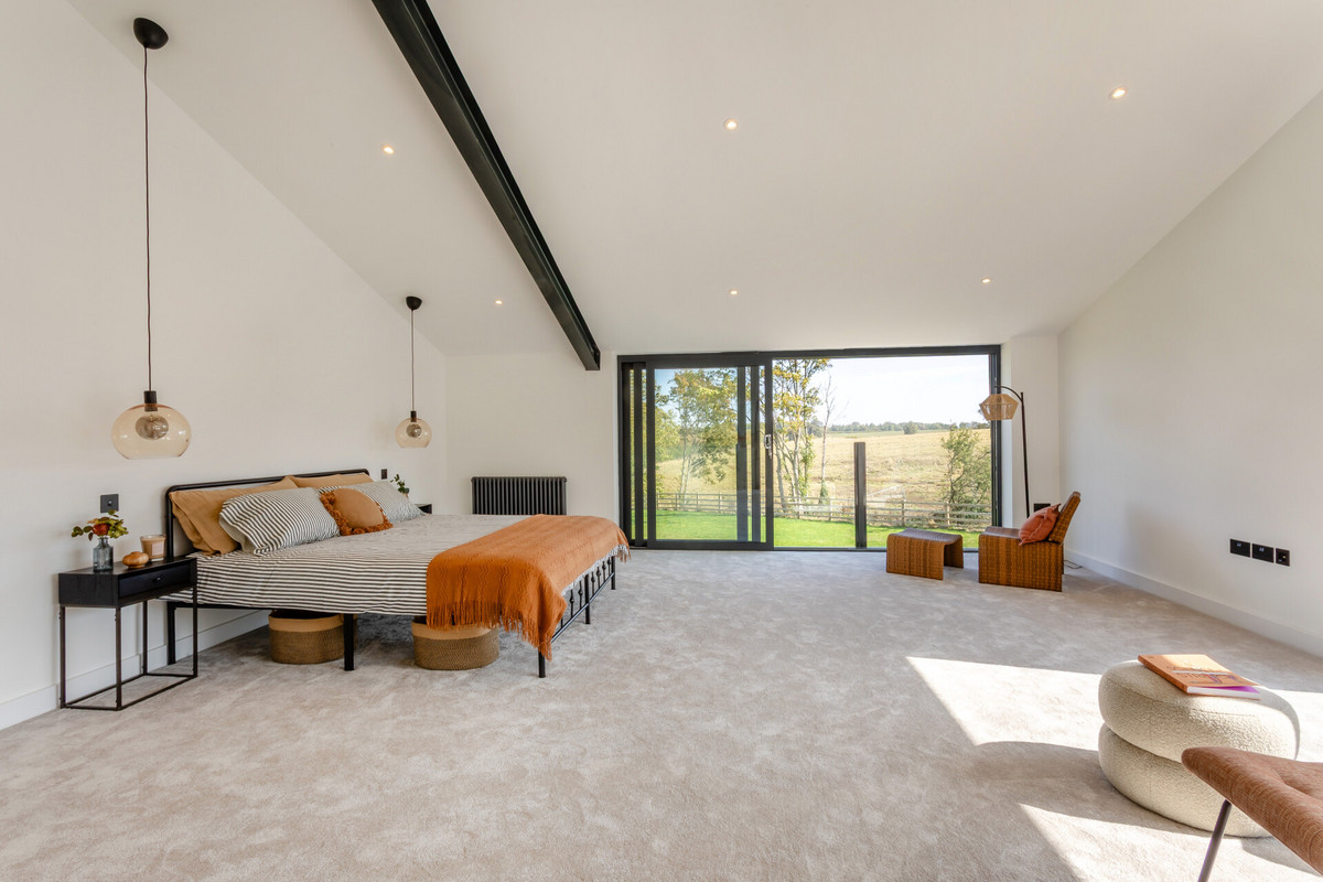 On the upper floor the central vaulted landing area with glass gallery leads through to the bedrooms. The main bedroom suite is quite breathtaking and a beautifully bright room with a large picture window to the side with views towards the church and sliding glazed doors to the rear with a Juliet balcony and far reaching countryside views. The room is vaulted with exposed steel beams and has two separate dressing rooms. Glazed Crittal style doors open into the luxurious en suite bathroom which has a free standing tub bath and a phenomenal double shower. There are a further two large double bedrooms both with superb views, vaulted ceilings with exposed steel trusses, en suite shower rooms and walk in wardrobes.