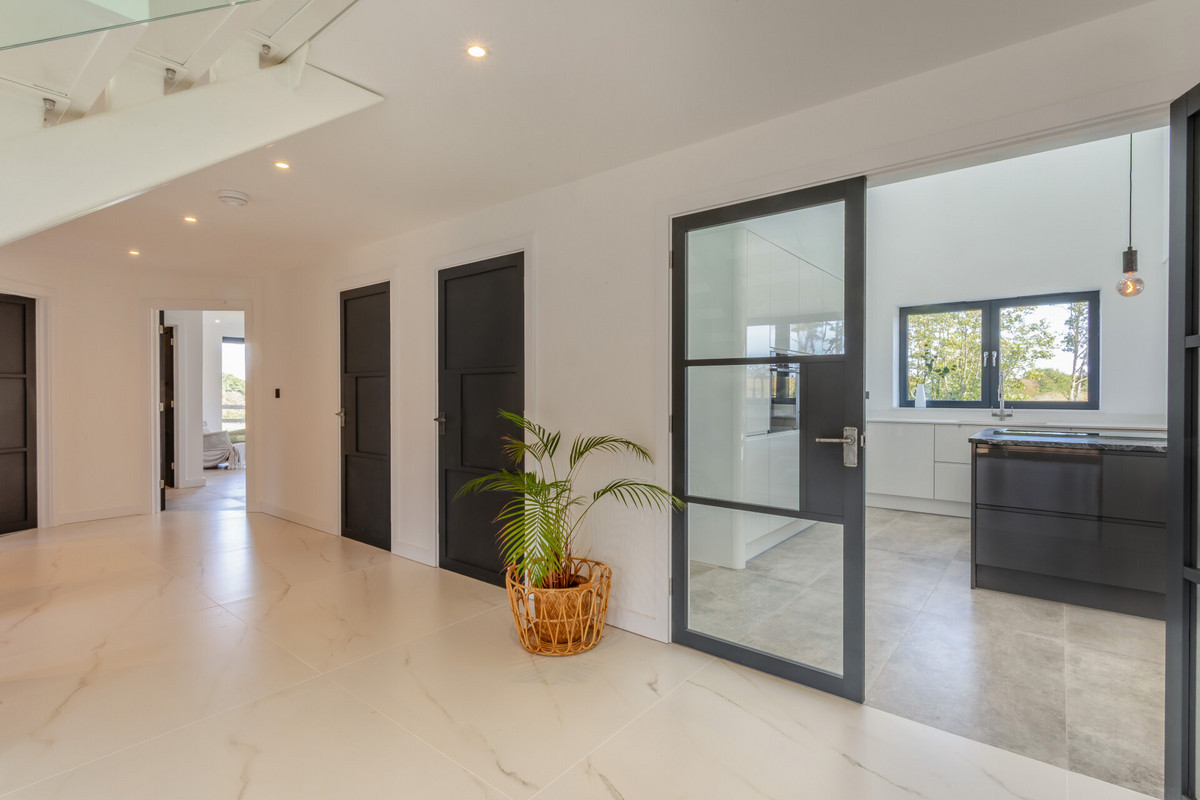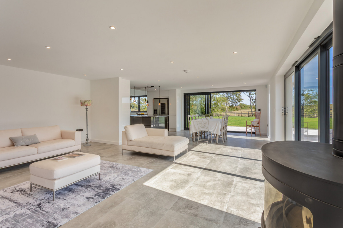 On entering you are greeted by a phenomenal reception hall with a vaulted ceiling with exposed steel trusses and Velux windows that literally flood the hall with natural light, sleek marbled ceramic tiled floor, a striking floating steel, marbled ceramic tiled and glass staircase that leads up to a galleried landing. On the right is the superb open plan main reception room and dining room which opens into the sleek kitchen. The reception room is an exceptional size and ideal for family entertaining on a grand scale, it has an amazing feeling of light and space with floor to ceiling windows to the front and two sets of sliding doors to the side and rear that open to the gardens, there is a wood burning stove and a ceramic tiled.