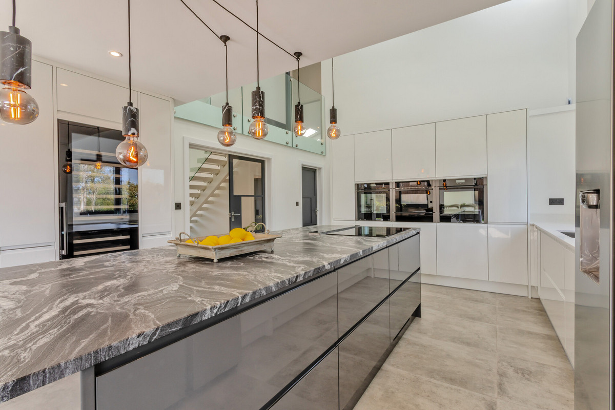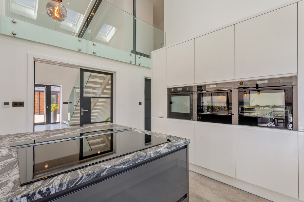 The kitchen is another stunning room with a part vaulted ceiling that opens up to the galleried landing area above, it is fitted with an extensive range of ultra sleek high gloss floor and wall units with polished quartz work surfaces and a granite topped central island unit with overhead spider lights, appliances include an induction hob and extractor, two eye level Neff ovens, microwave, large wine cooler, dishwasher and American style stainless steel fridge/freezer. There is a part open wall leading to the utility room with access to the garden.