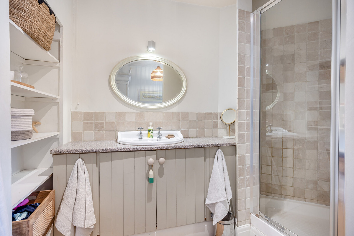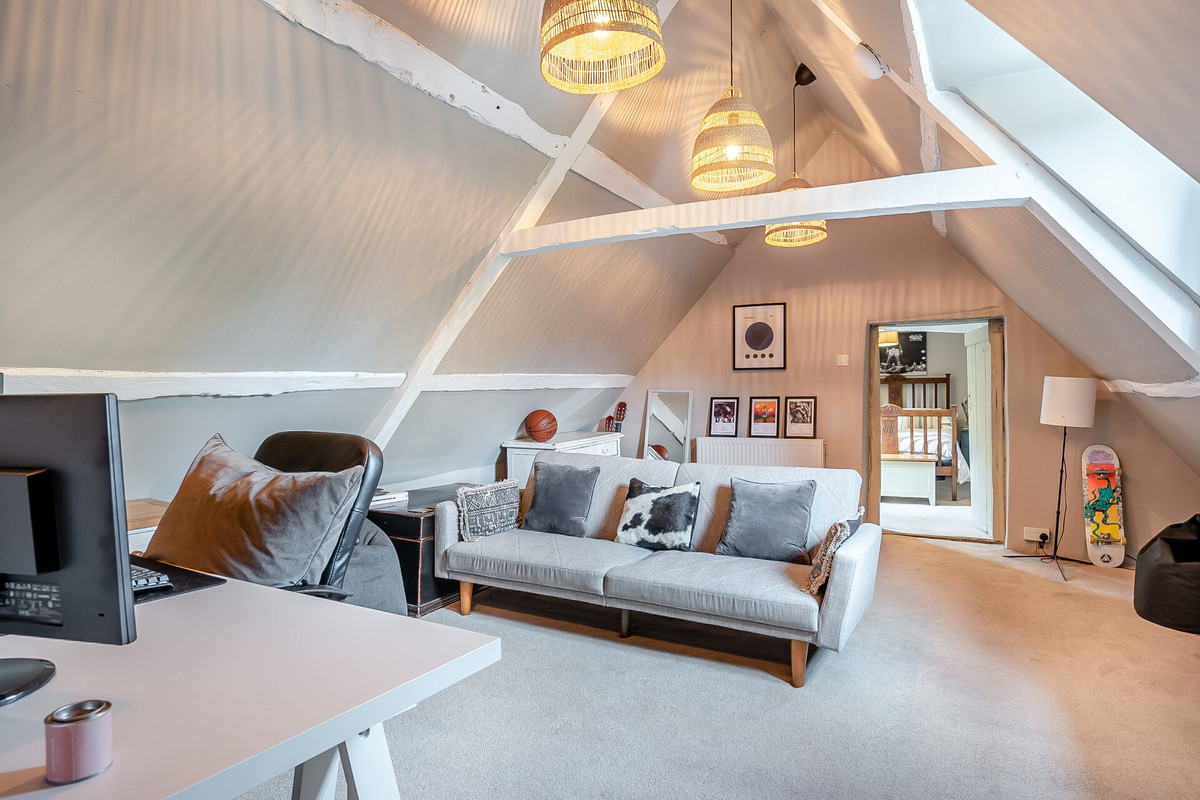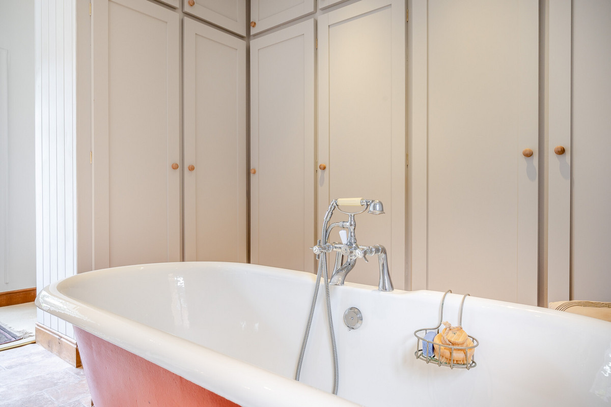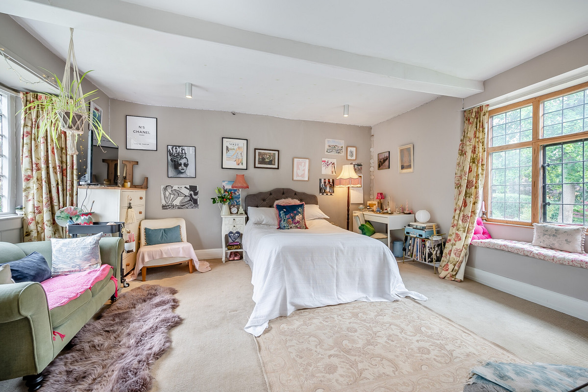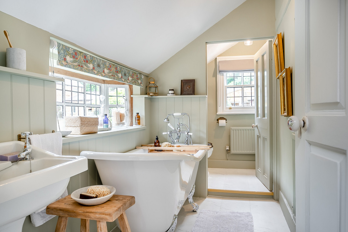 On the first floor there is a central landing area with access to four bedrooms, three are good size doubles with leaded glass windows overlooking the front garden, one has an en suite shower room. The fourth bedroom is a small double with window to the side. There is a rear hallway with a wall of fitted cupboards with original oak panelled doors which gives access to the family bathroom and main bedroom suite. The family bathroom has a traditional feel with a roll top bath and a dinky bay window with leaded glass overlooking the rear garden. The main bedroom suite is in the older rear wing and has a superb character bedroom with a vaulted and beamed ceiling and a separate bathroom/dressing room with a free standing bath tub, twin basins and a separate shower. There is an extensive range of bespoke fitted wardrobes.