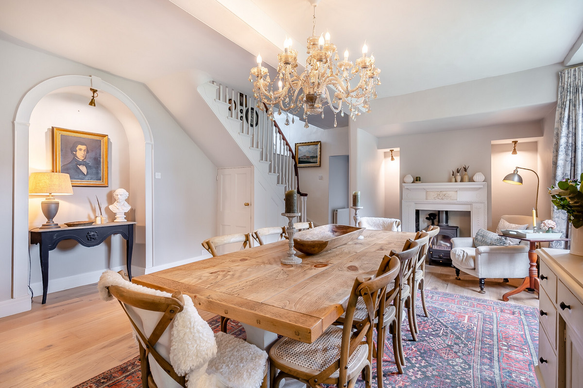 To the front of the house the garden is walled with ornate iron railings and an original ornate iron work gate,a paved path leads to the original panelled and glazed front door, on entering you are greeted by a spacious and welcoming dining hall. This superb room has a wonderful feel with an oak floor, leaded glass window to the front, an original fireplace with wood burner, the original staircase and access to the cellar. The main reception room is just flooded with natural light and has a leaded glass window to the front with shutters overlooking the front garden, the room has a quite phenomenal period fireplace and wood burner. At the far end of the dining hall is a large boot/utility room with bespoke fitted cupboards, sink unit and the gas fired boiler. To the rear of the house is a small lobby area with a guest cloakroom. The farmhouse kitchen/breakfast room is quite superb with an oak floor, exposed beams and a large period inglenook fireplace with with an iron fire basket, cast iron fireback and meat hooks. The kitchen is fitted with an extensive range of Shaker style units with a central island, there is a large 4 oven Aga plus a separate induction hob, there is ample room for a full size family breakfast table and a sitting area.
