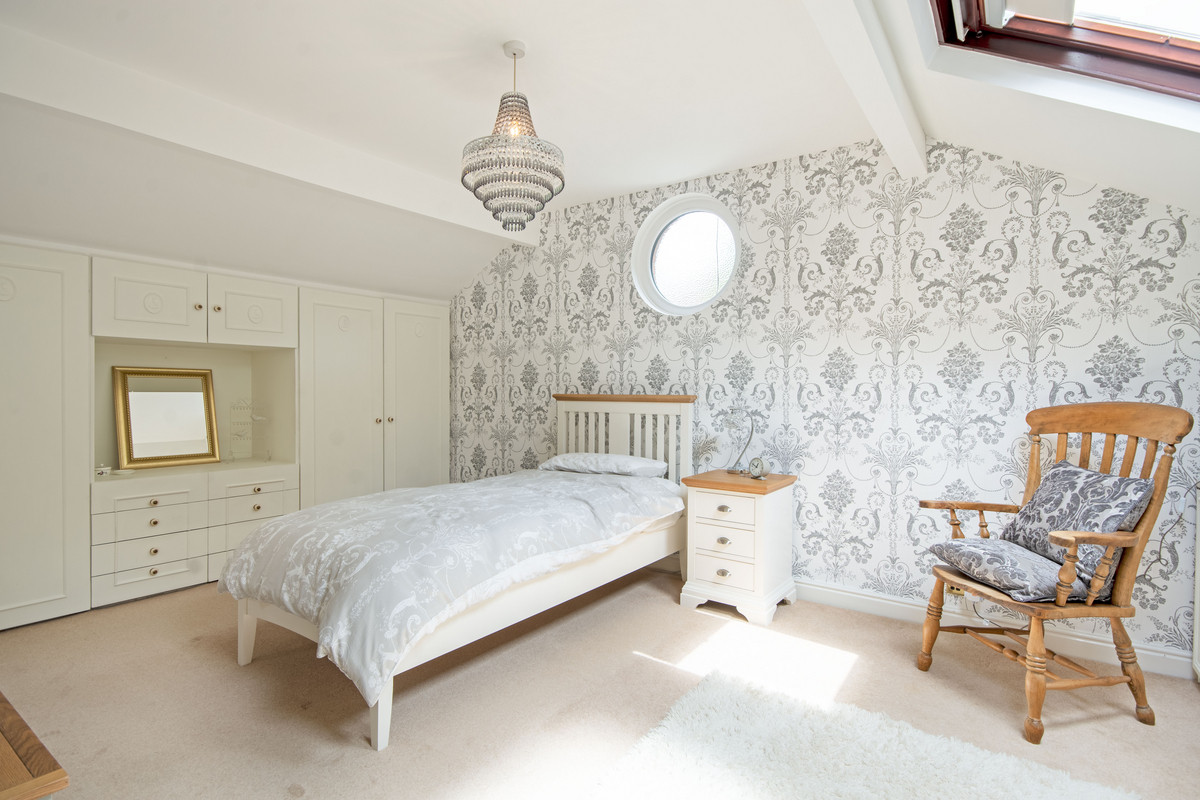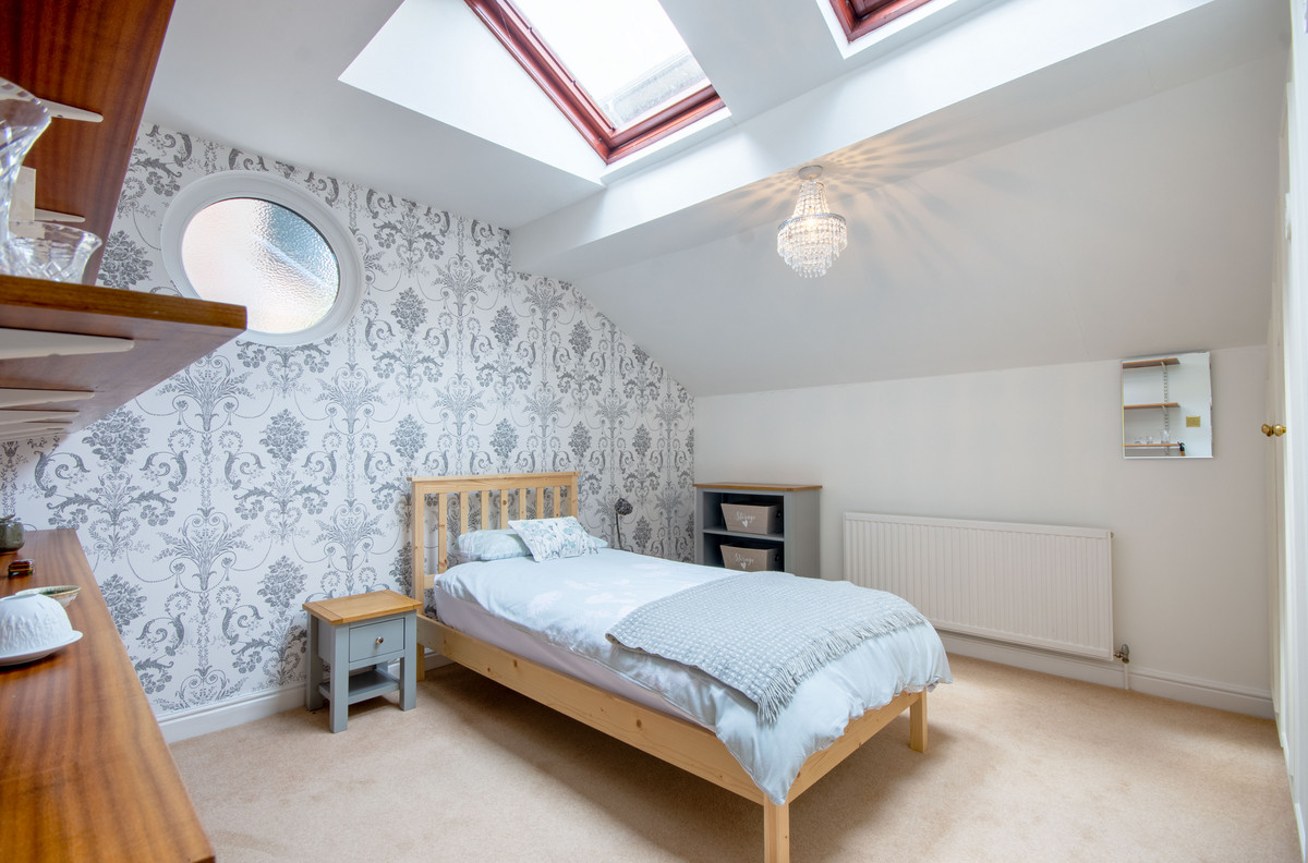 Bedroom Two also features two Velux roof windows, benefits from built-in wardrobes and features a circular frosted double-glazed window to the side.