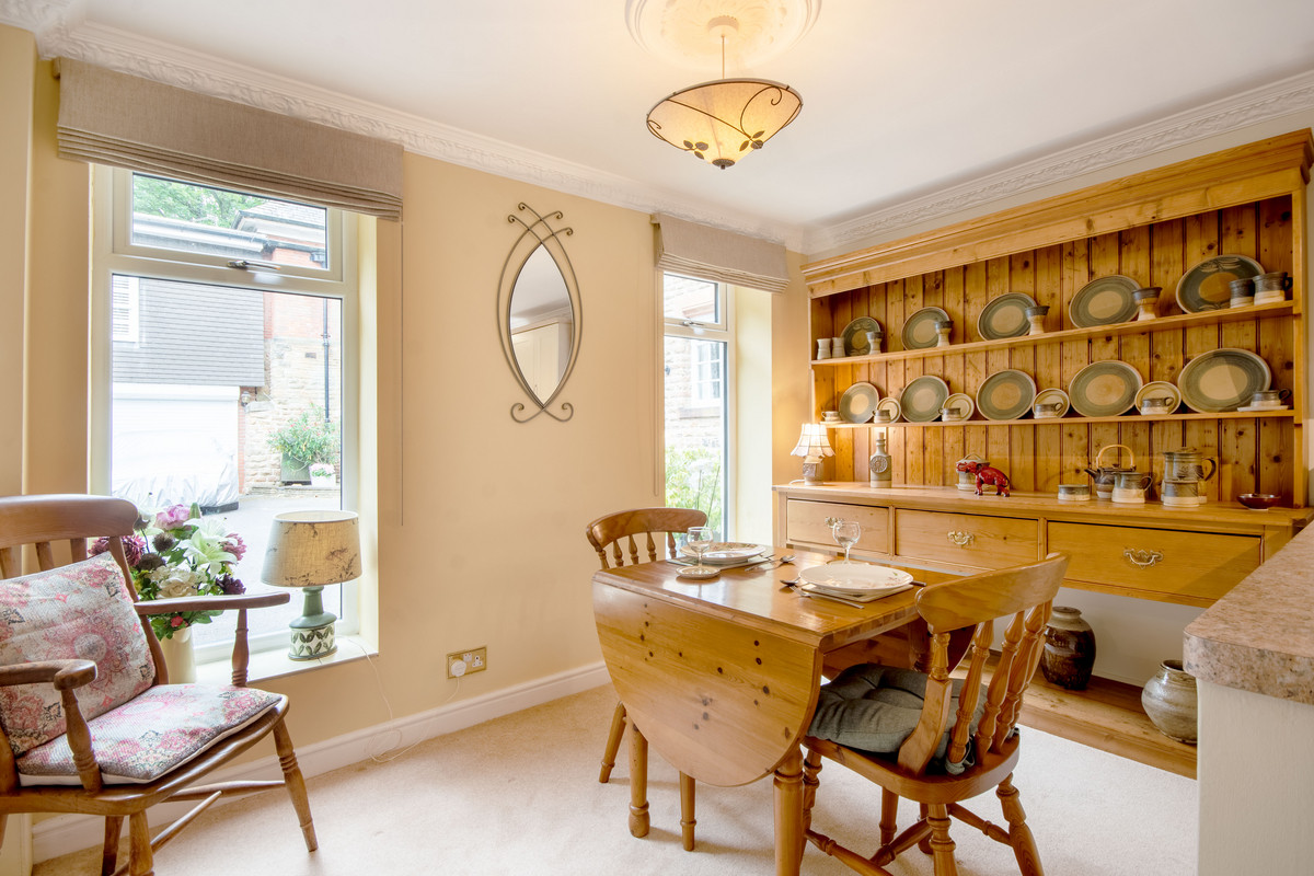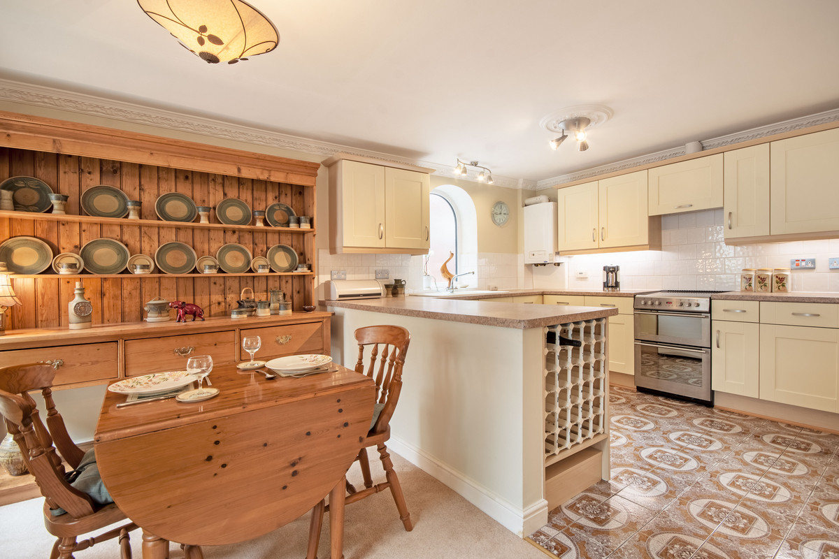 The open-plan dining kitchen is well-equipped and tastefully appointed with a range of cream coloured wall and base units, complementary work surfaces, and an inset sink unit. There are provisions for a freestanding fridge and slot-in cooker with an extractor hood above. Two front-facing double-glazed windows allow for natural light into the kitchen dining area, creating a bright, welcoming space for entertaining.