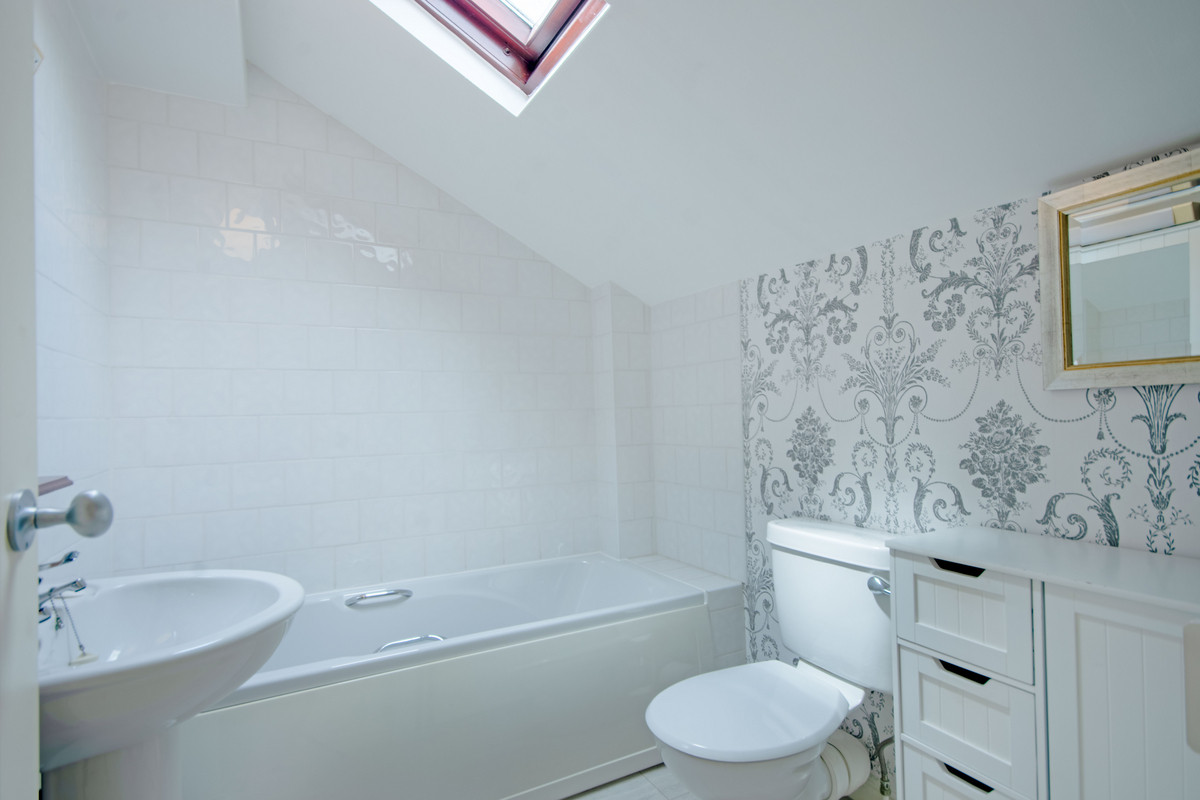 A well-appointed shower room services the second bedroom and guests alike, with a modern shower enclosure, pedestal hand basin, low-level WC, a radiator, and a frosted double-glazed Velux window that allows light while maintaining privacy.