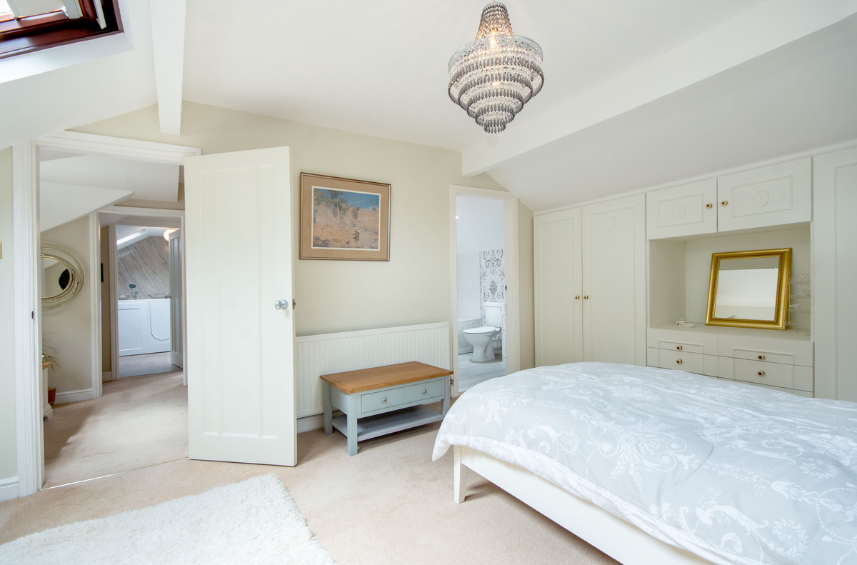 Bedroom One is a spacious double bedroom with fitted wardrobes, flooded with light through two double-glazed Velux roof windows and a circular frosted double-glazed window to the side adds a unique design element.