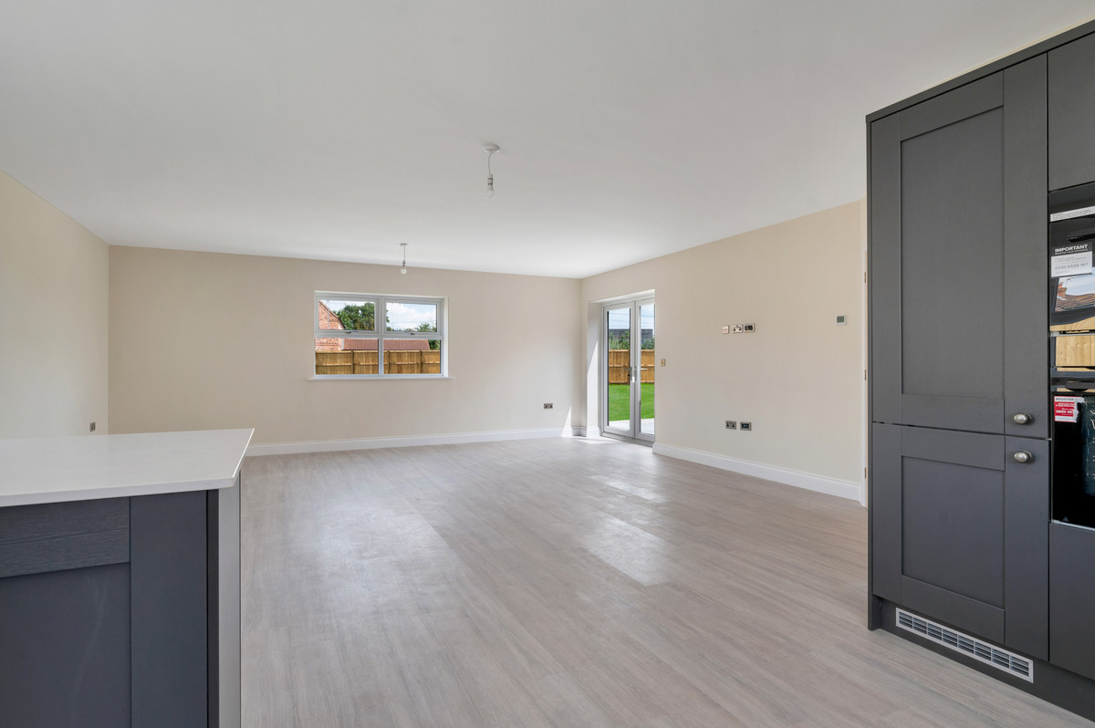 Plot 4 - The Franklin, is a distinctive bungalow within this development, unusually occupying a 0.7 acre plot and exemplifies the modern yet rustic theme that defines the entire development. Central to this unique home is a truly spacious open-plan living kitchen, with seating area opening seamlessly to the large garden through a patio door, enhancing the indoor-outdoor living experience.