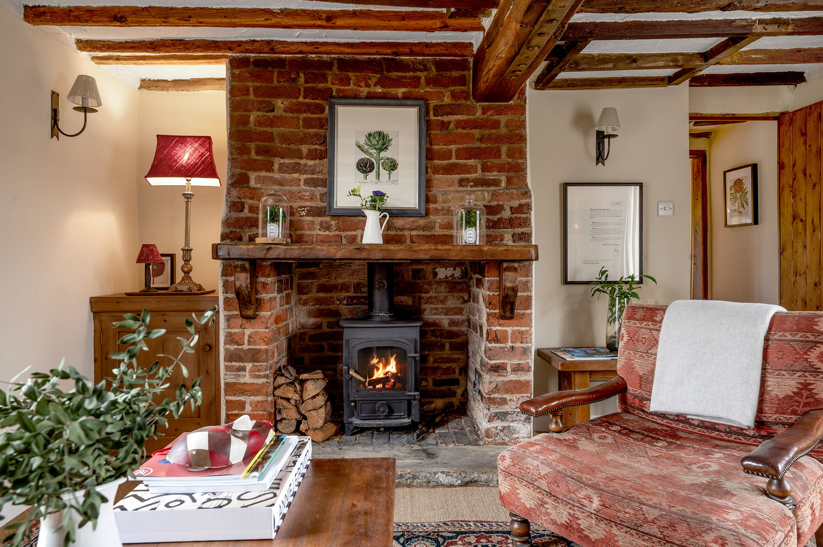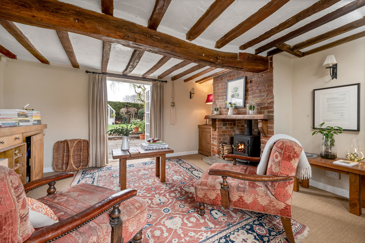 Beyond the kitchen an inner hallway with drinks cupboards gives access to two charming reception rooms; a sitting room with original brick fireplace housing a log burning stove and French doors to the garden, and beyond is a snug with further original brick fireplace.