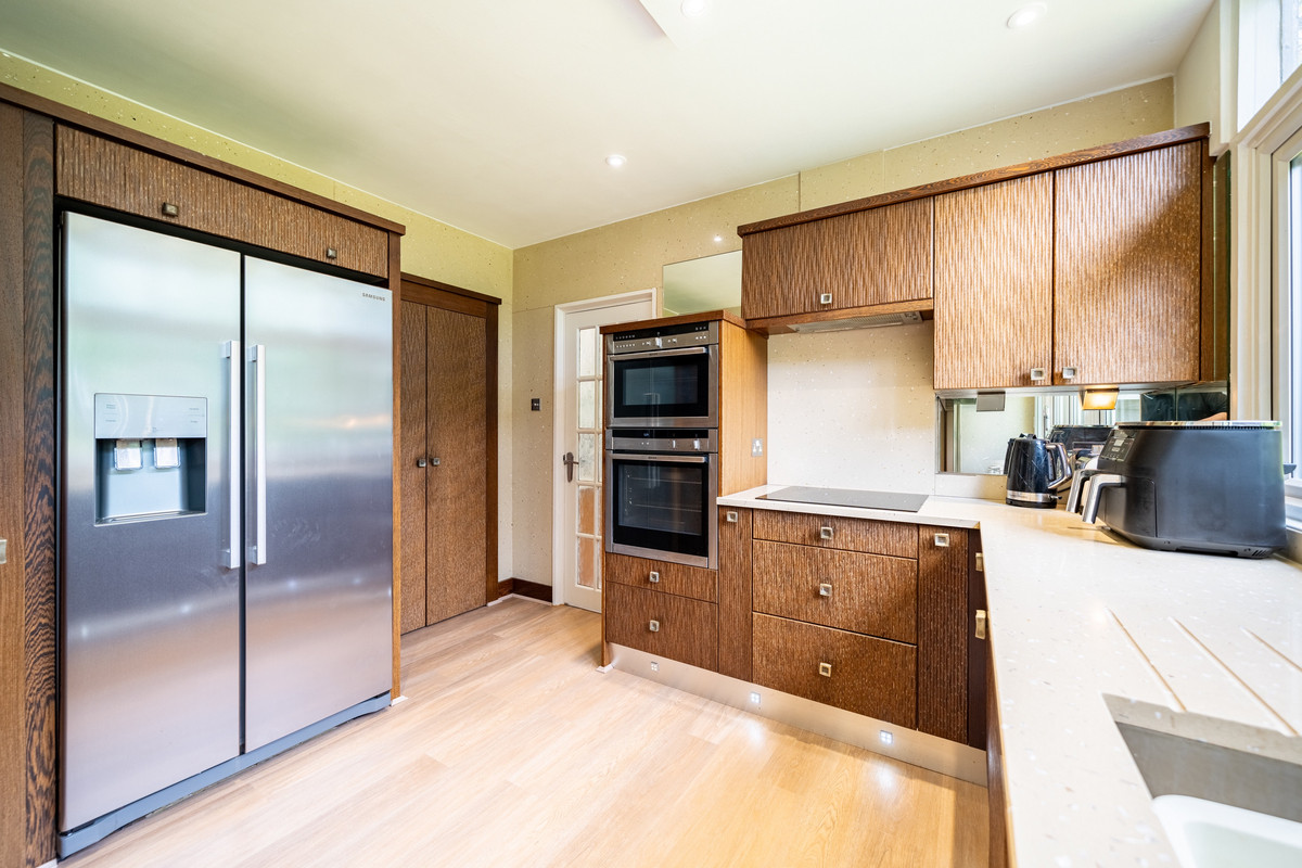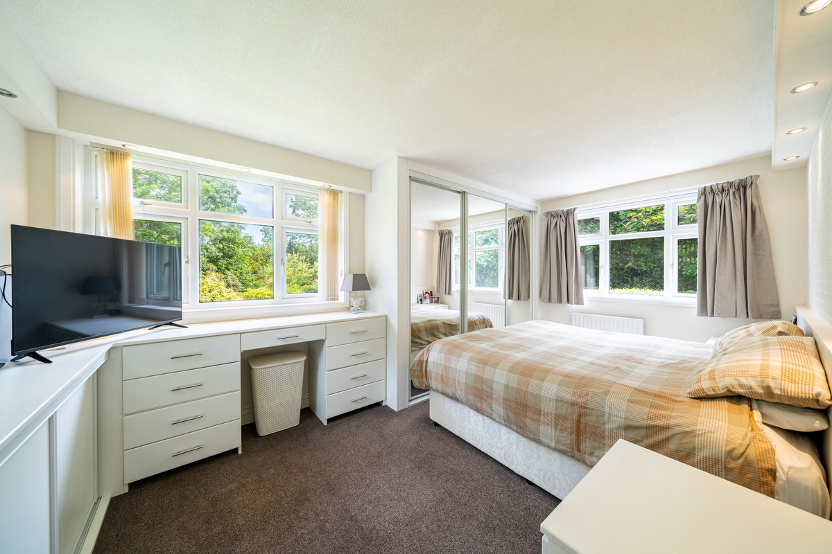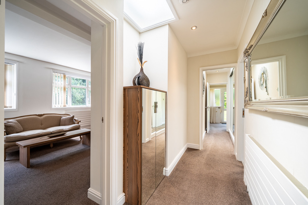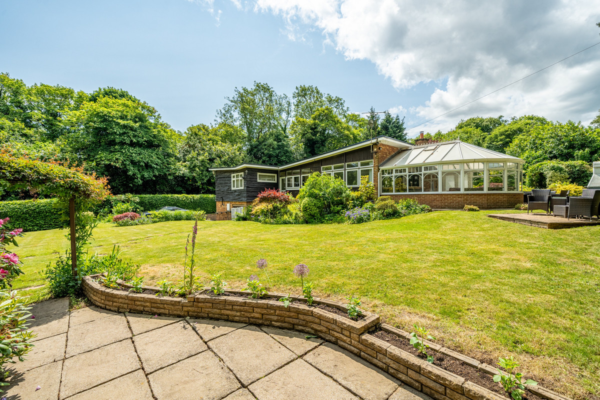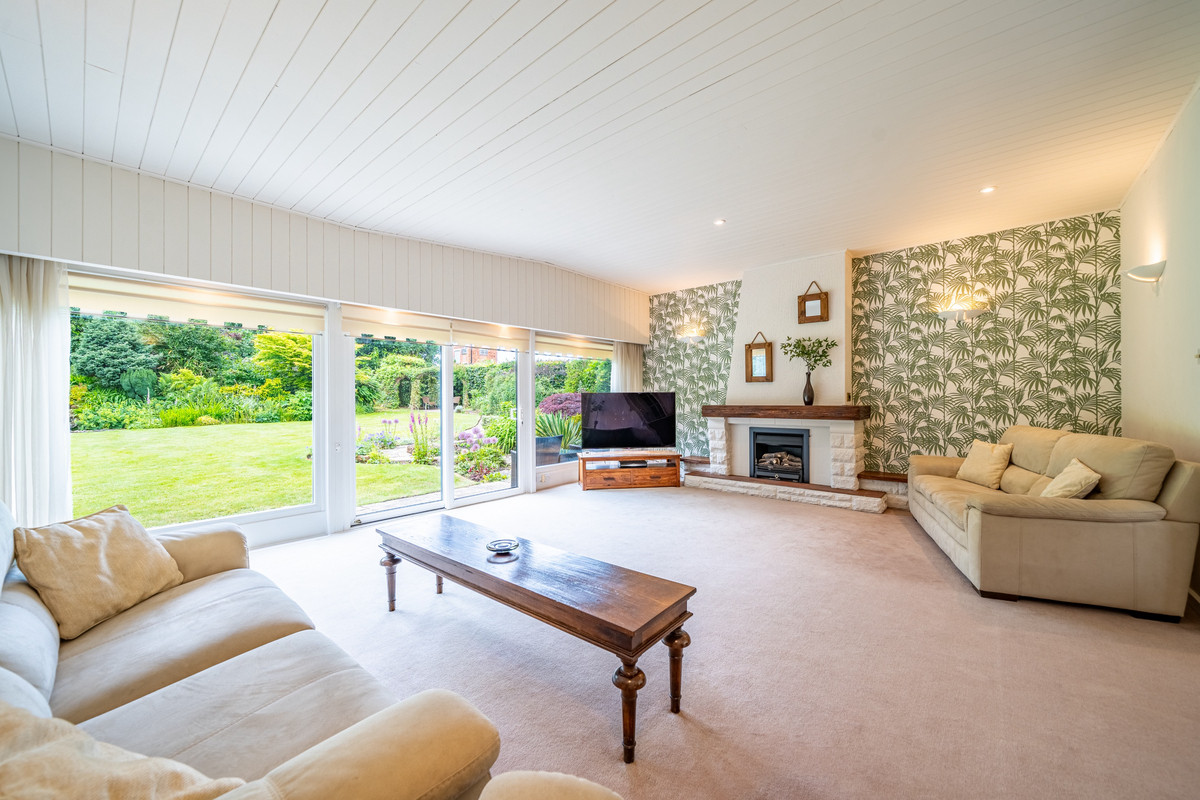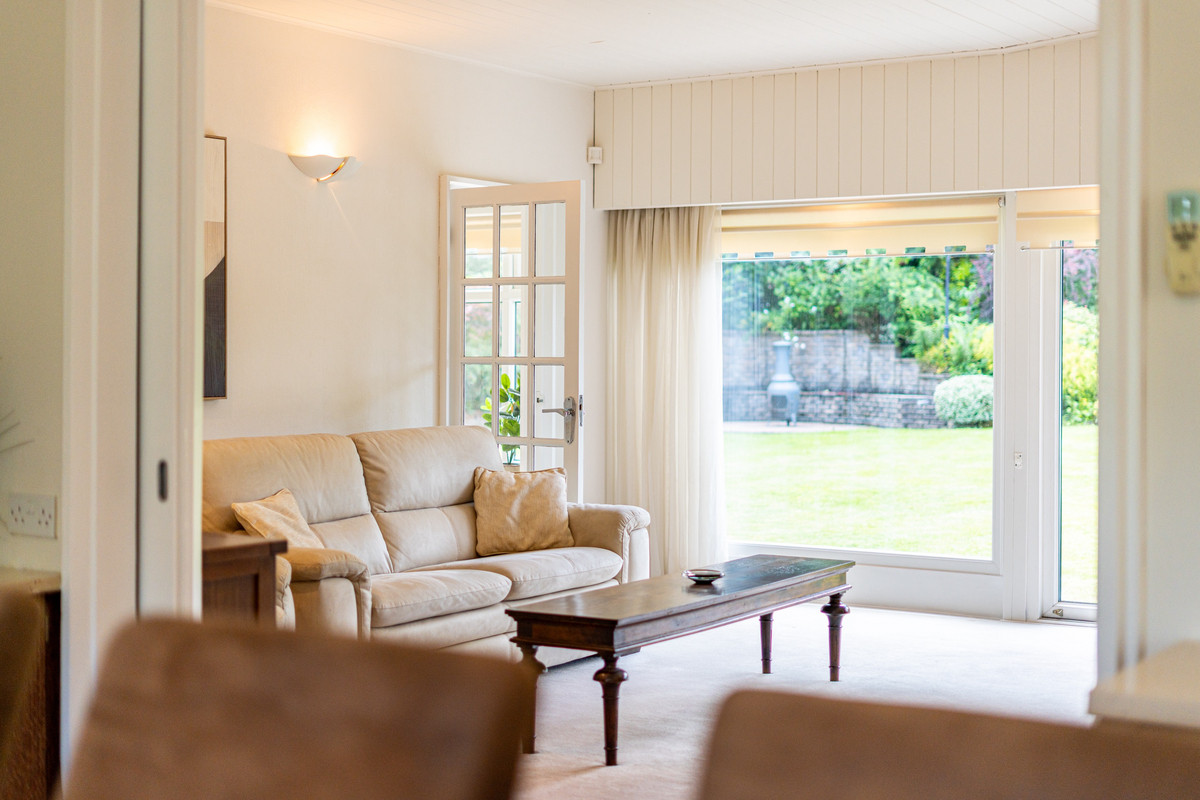 Designed to accommodate for pleasant social spaces and entertaining whilst maximising the exceptional garden views, the property enjoys approximately 1947sq.ft of generously proportioned and practically arranged accommodation, with rooms flowing effortlessly throughout the home. Much of the principal accommodation is accessed off the spacious entrance hall which, in brief, comprises of a sitting room with feature fire and sliding doors leading out onto a terrace, formal dining room, garden room/ conservatory with fitted seating and purpose-built bar area, a Davenports bespoke kitchen with Wenge Wood cabinetry and Silestone quartz countertops, three double bedrooms, family bathroom and a separate WC. In addition, the property benefits from a lower-ground double garage with an internal lift that goes directly into the kitchen – a fantastic addition for those requiring mobility assistance.