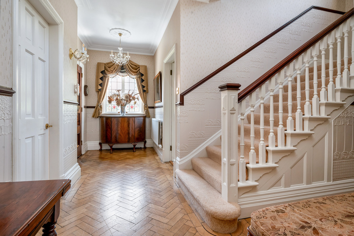 You enter the property through an impressive original entrance door, to a fine entrance hallway with parquet wooden flooring which provides an immediate indication to the calibre of this home. From here, you gain access to three formal reception rooms, providing a generous drawing room, sitting room, and formal dining room – all showcasing original features.