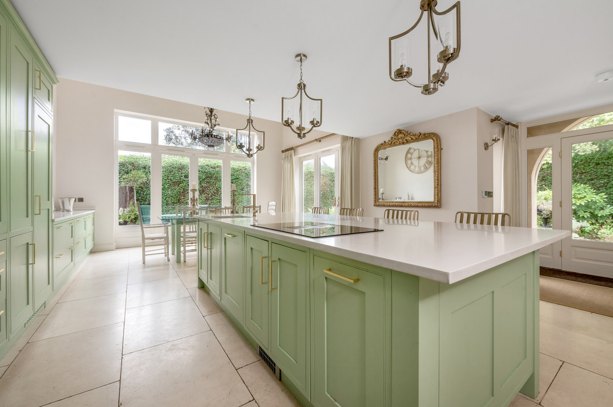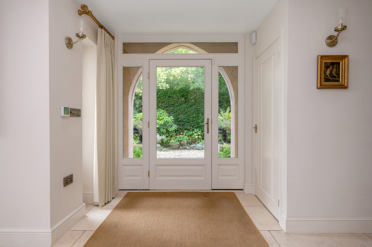 An entrance hall with useful cloaks storage opens into a large living kitchen, with bespoke hand unit cabinetry arranged via a large central island. The kitchen features a full range of integrated appliances. Adjacent to the kitchen is a useful utility room / guest cloakroom.