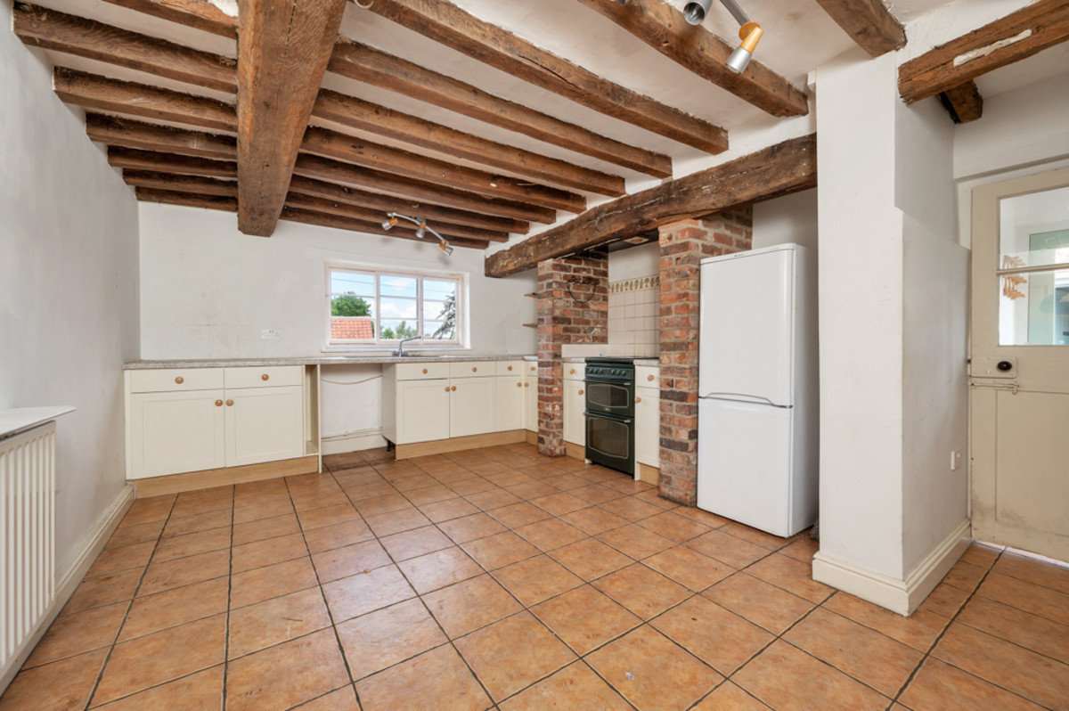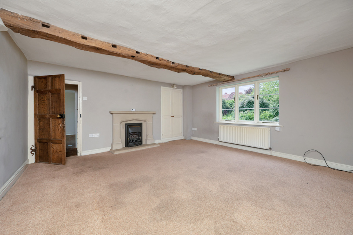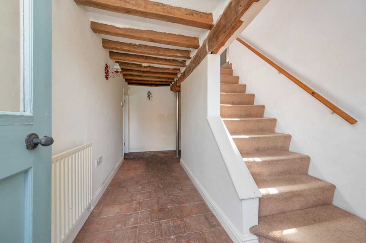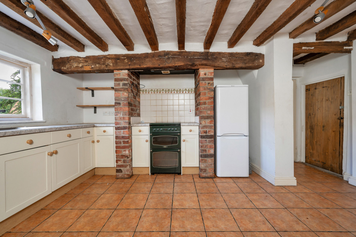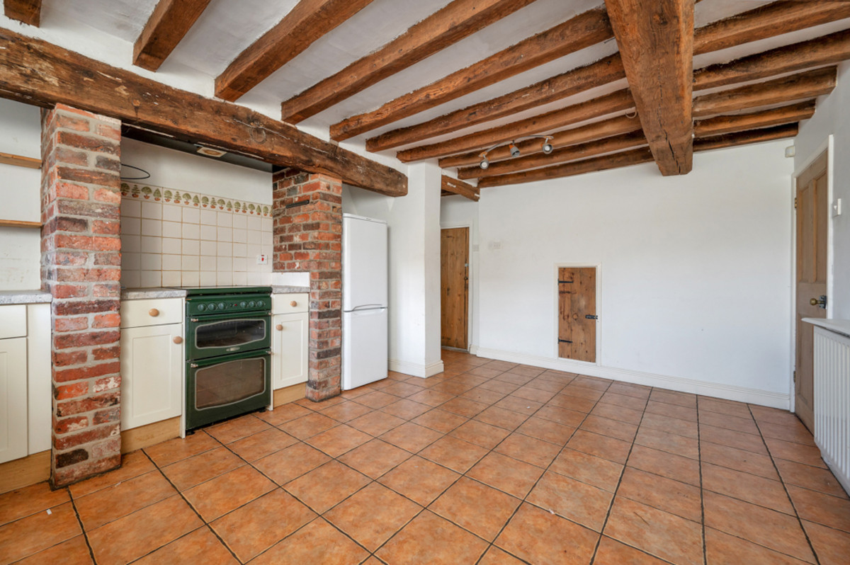 The property harmoniously blends timeless character with spacious, well-proportioned accommodation. As you enter through the hallway, adorned by terracotta tiled floor with exposed ceiling beams and a staircase ascends to the first floor. The hallway seamlessly connects to two generously sized reception rooms, both offering enchanting views of the garden, and a charming breakfast kitchen. The rear facing reception room has a stone tile floor covering, a feature fireplace and door providing access to the garden. The second reception room enjoys a stone fireplace, exposed ceiling beam and a dual aspect overlooking the garden and driveway/barn. The fitted breakfast kitchen exudes rustic charm with exposed ceiling beams and has the unusual feature of a partially separated disused room currently accessed by a hatch door. This offers an excellent opportunity to create an expansive living kitchen with a dual aspect and potential for access to the garden. Leading off the kitchen is access to a vaulted cellar.