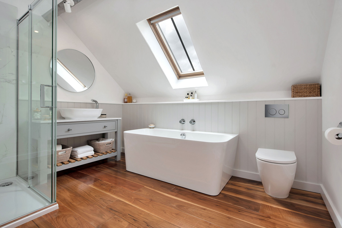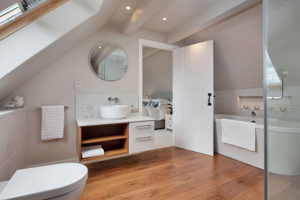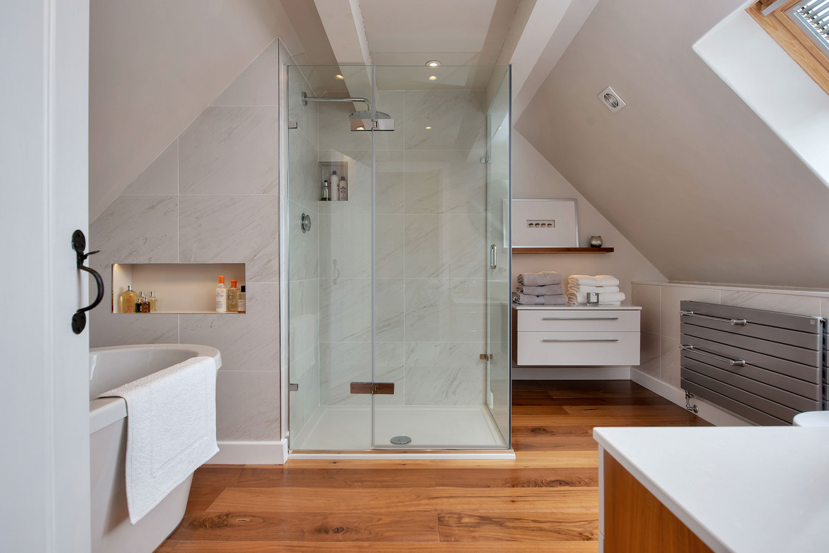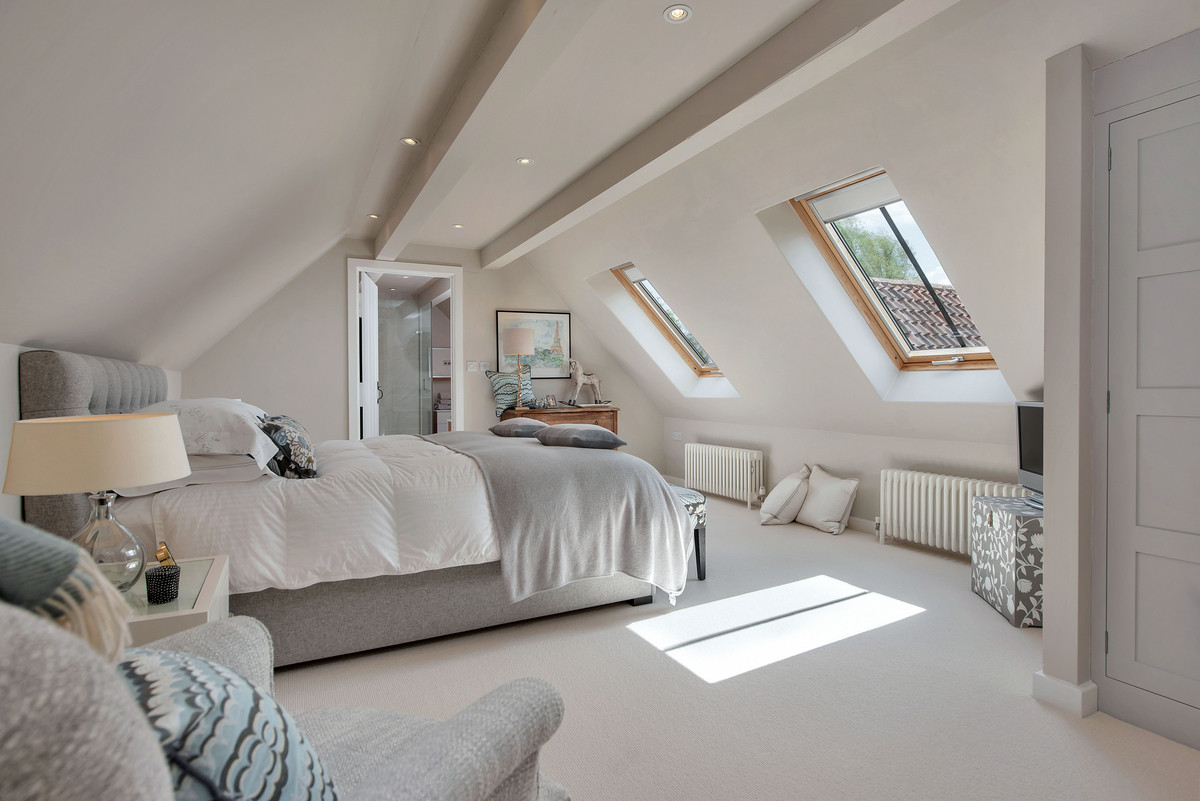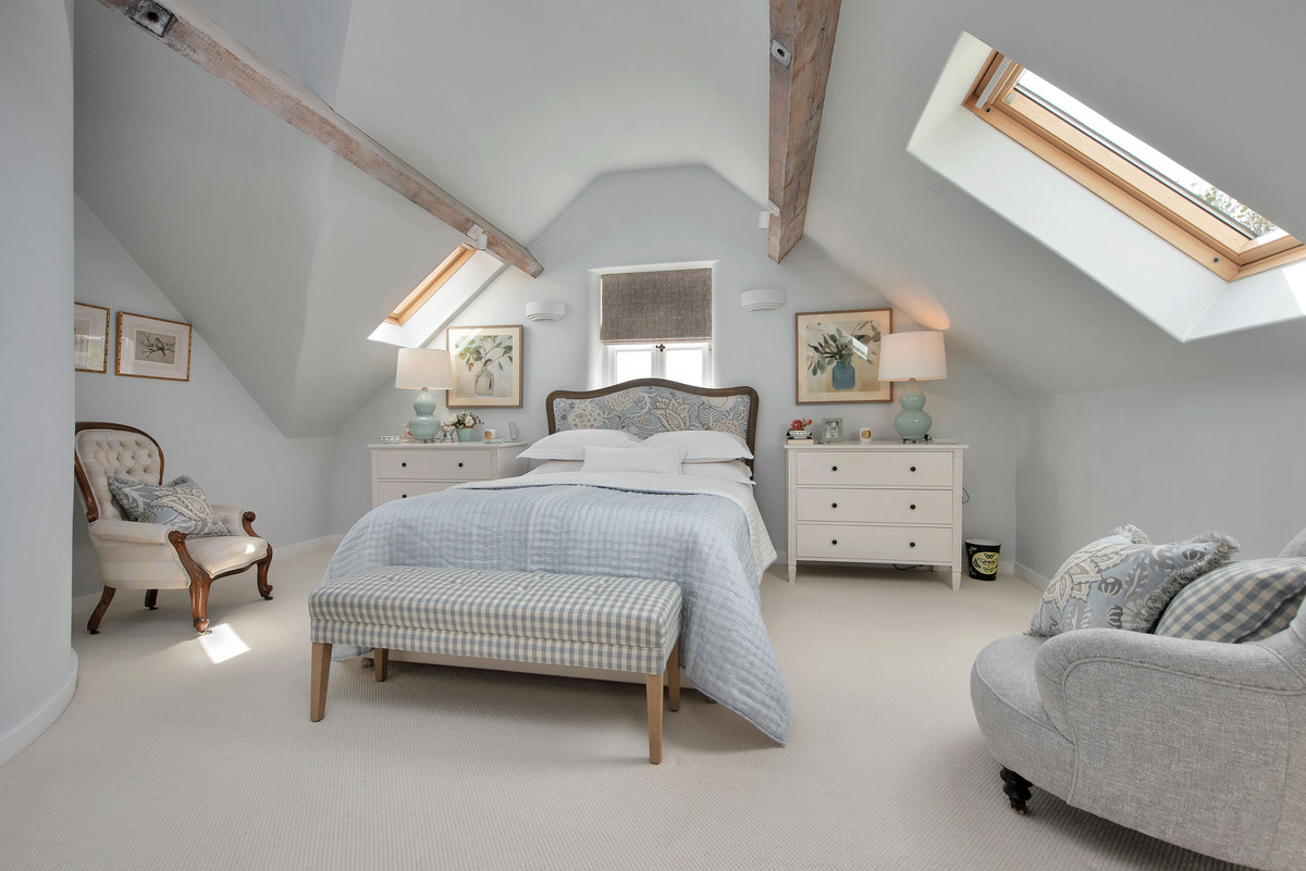 A traditional staircase rises to the first floor which offers a luxurious main bedroom suite with built-in wardrobe and high quality en suite bathroom. There are two further vaulted double bedrooms, one of which benefits from a walk-in wardrobe. Both of these bedrooms share the use of a lovely family bathroom.
