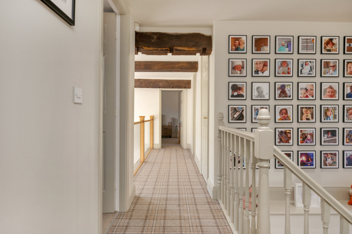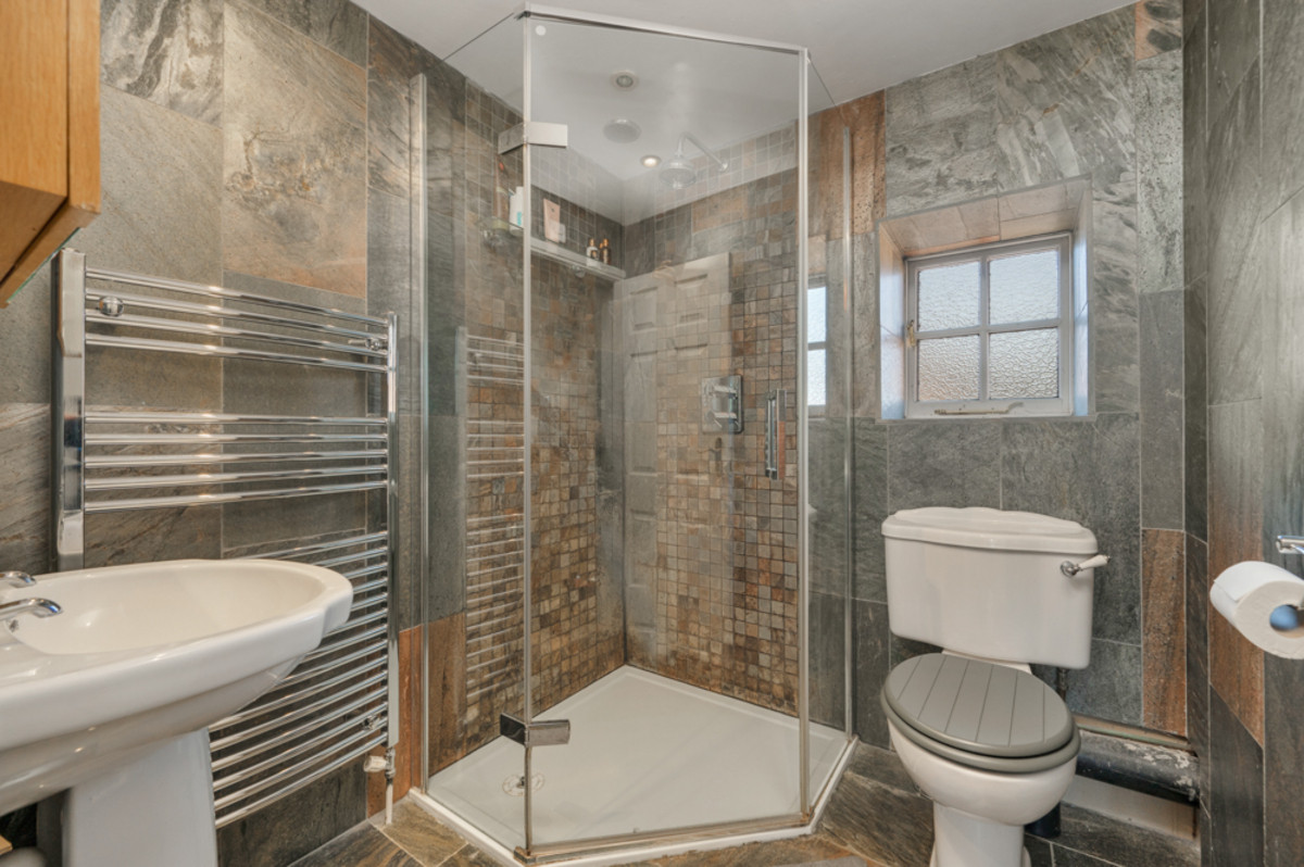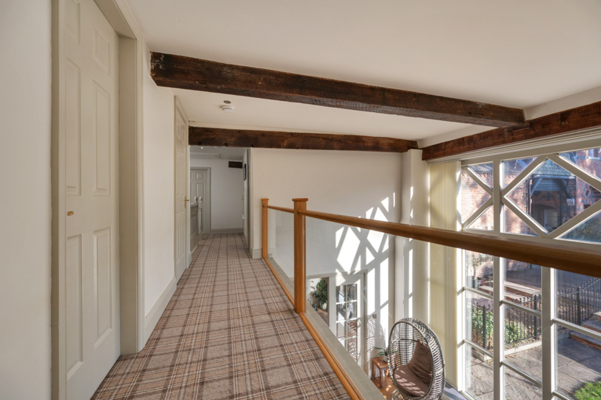 Ascending from the reception hallway, a staircase guides you to the first floor, revealing a distinctive galleried landing. This unique feature connects the principal bedroom and family bathroom to the three additional bedrooms. The principal bedroom boasts an en-suite shower room accompanied by a walk-in wardrobe. The family bathroom is well-appointed with a bath, overhead shower, w/c, wash hand basin, and a towel rail.