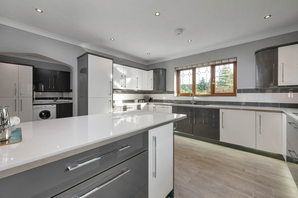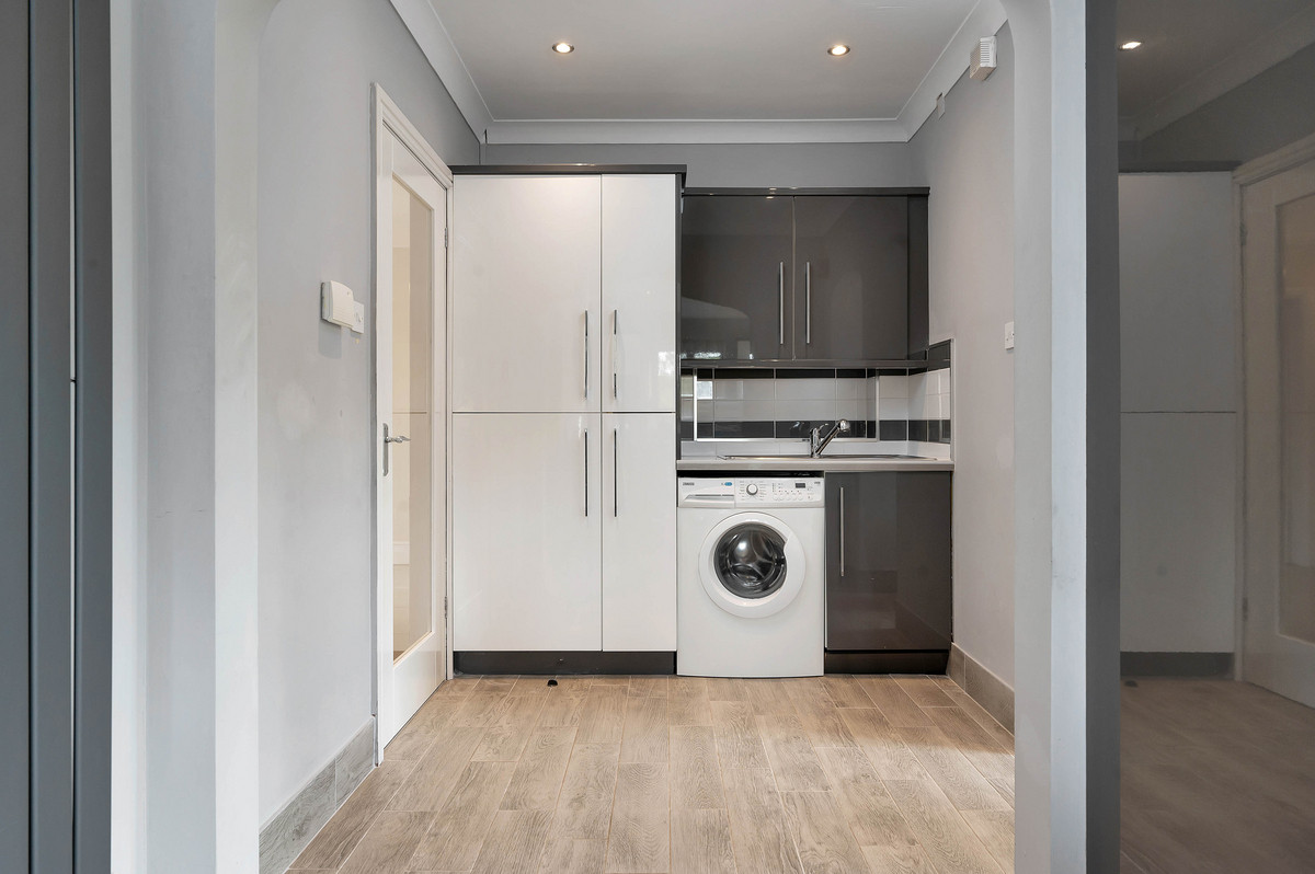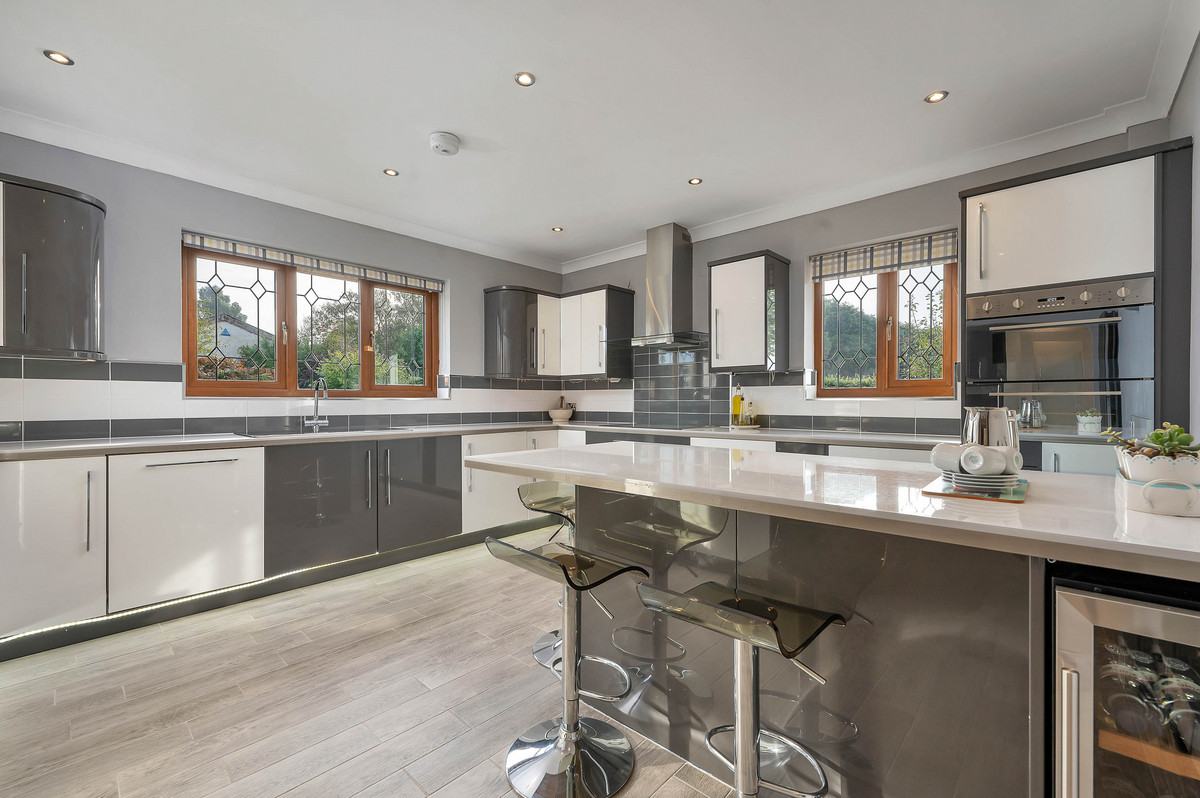 Undoubtedly, the contemporary dining kitchen serves as the heart of the home, featuring a superb array of integrated appliances and a spacious island. It's an ideal space for relaxed breakfasts or casual dining. This kitchen also conveniently connects to an adjacent utility area, complete with a guest cloakroom and a rear door leading to the garden.