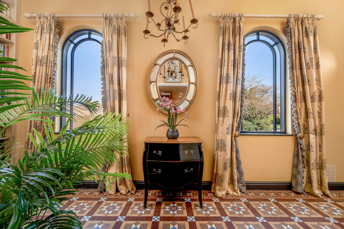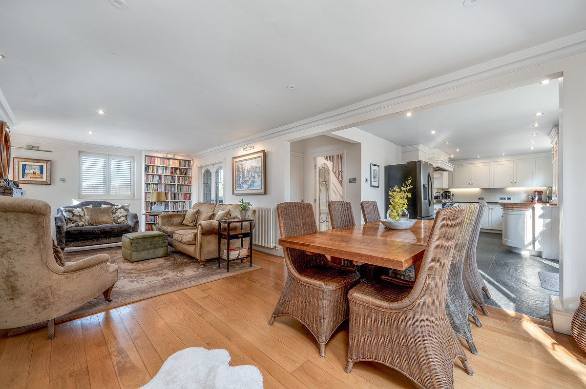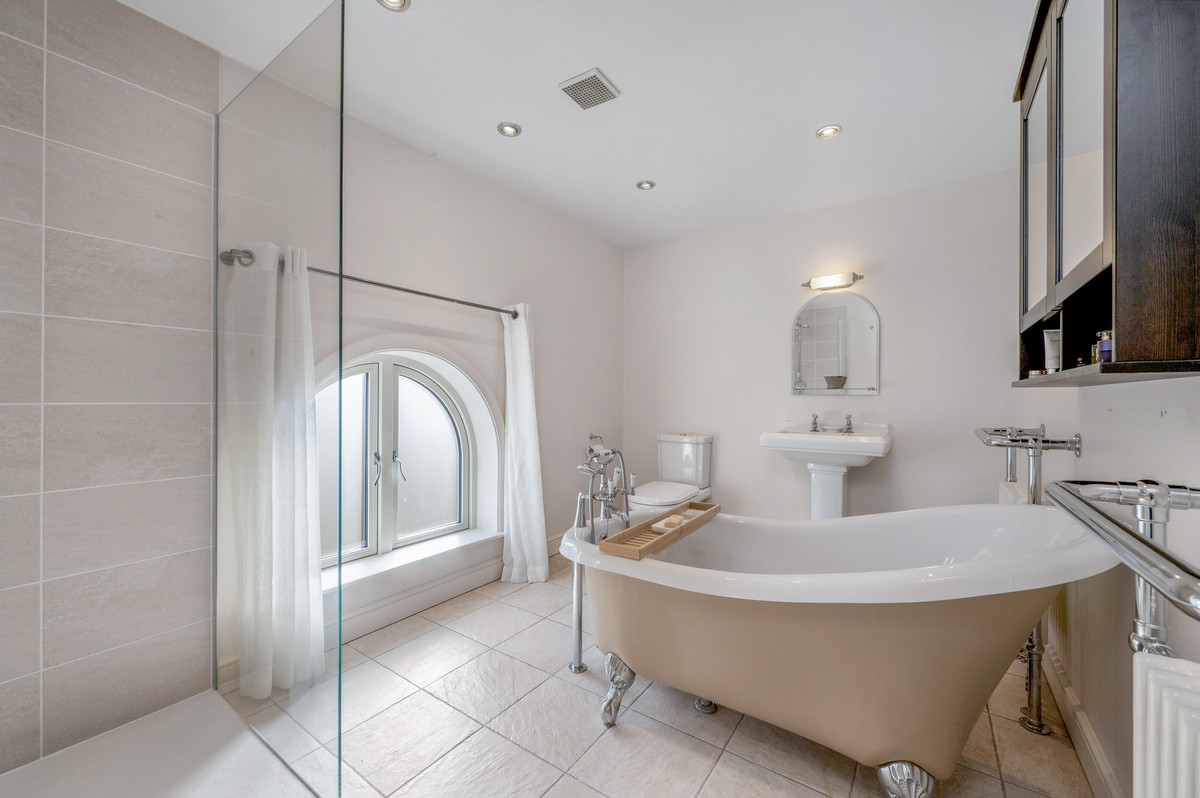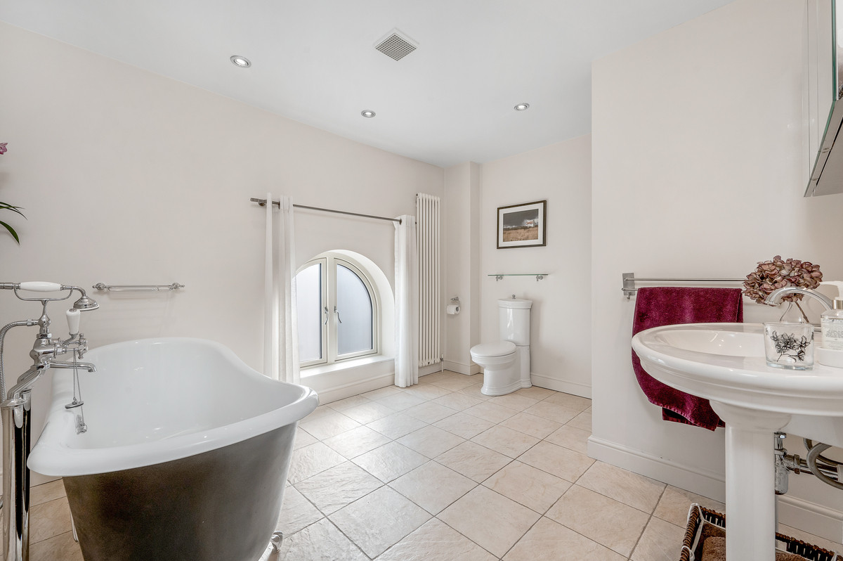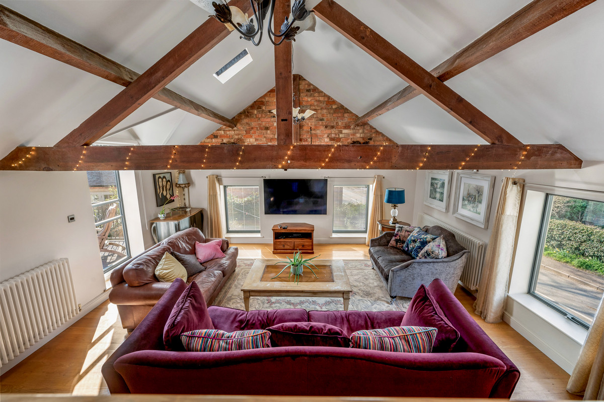 From the living space a few steps lead up to a further stunning reception room with vaulted ceiling and exposed roof trusses. Particular features of this impressive room are the large feature windows to three aspects providing delightful views, as well as access onto a south facing balcony with views over the courtyard.