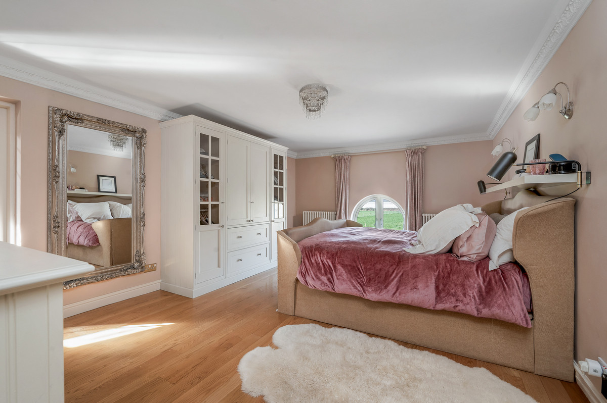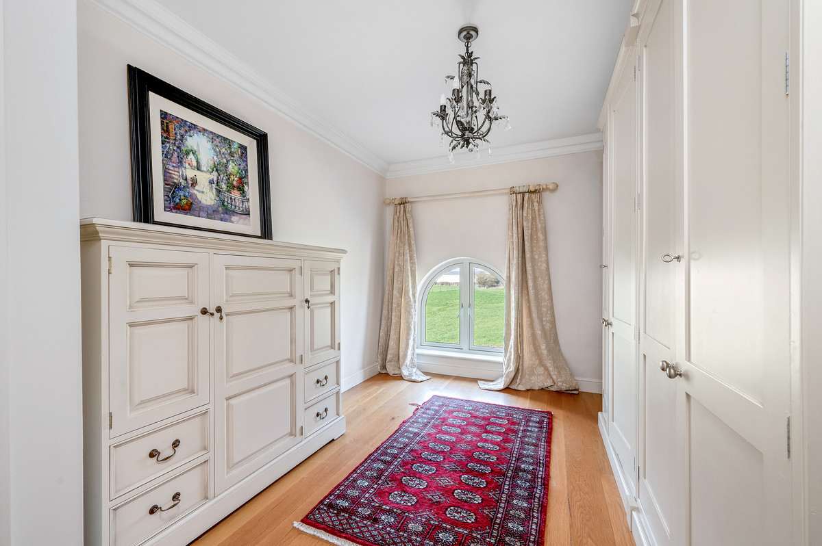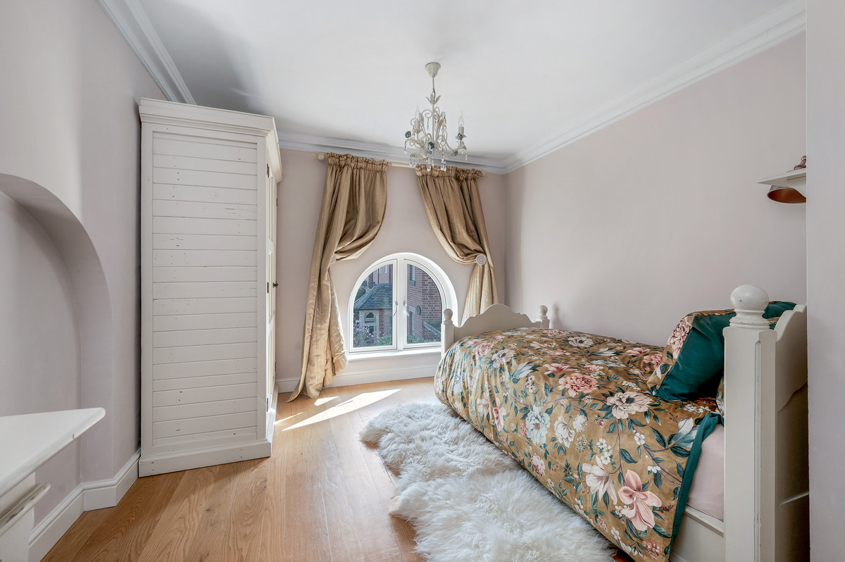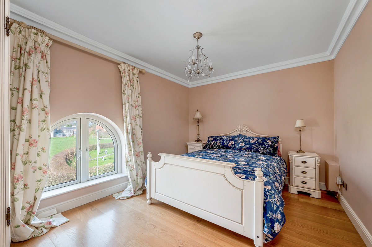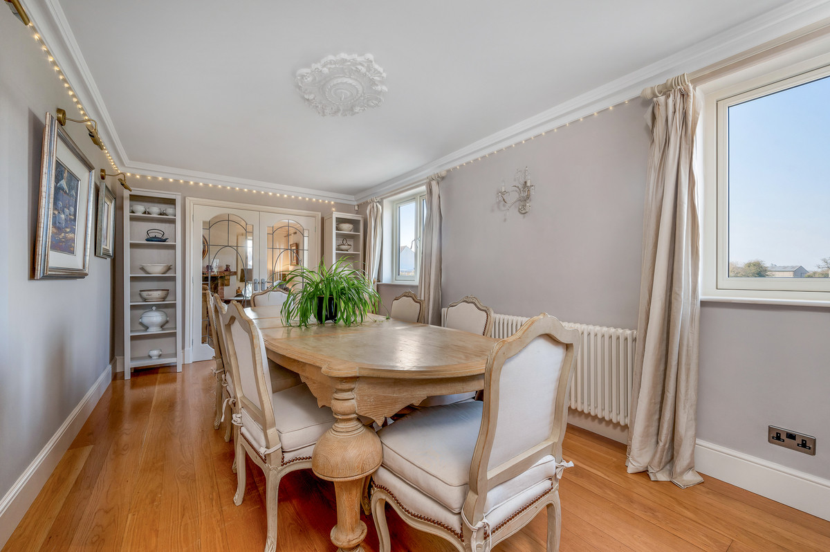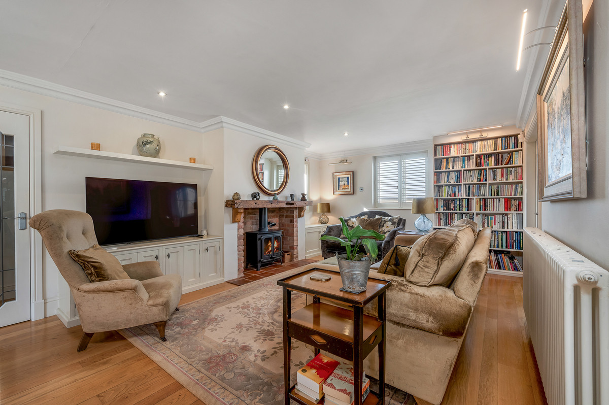 From the living space a few steps lead up to a further stunning reception room with vaulted ceiling and exposed roof trusses. Particular features of this impressive room are the large feature windows to three aspects providing delightful views, as well as access onto a south facing balcony with views over the courtyard.