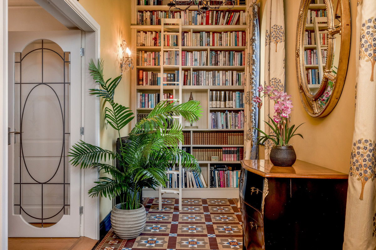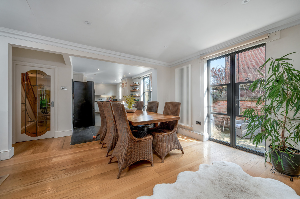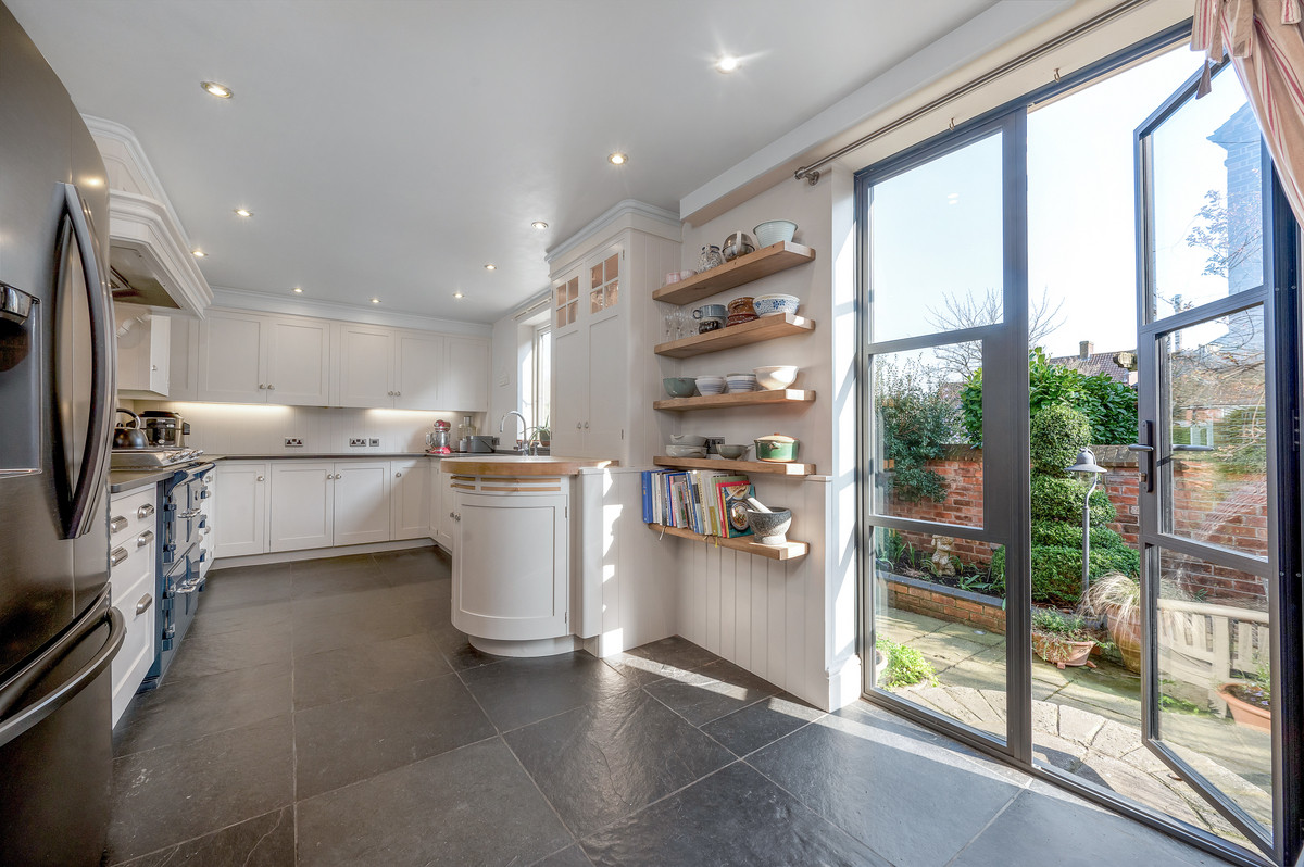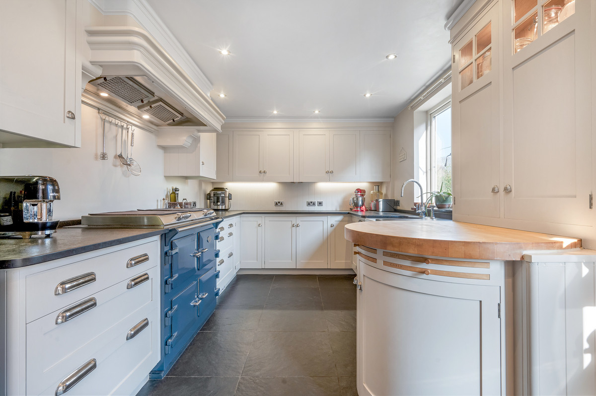 To the ground floor, the original full height Chapel double door with fanlight over opens to a stunning entrance vestibule, which now provides a library area with bespoke fitted bookshelves. A central reception hall provides access to a formal dining room, as well as a stunning open plan living area, with well defined sitting, dining and kitchen areas. The sitting and dining area features high quality wooden flooring, built in bespoke cabinetry with further bookshelves, as well as a brick fireplace housing a log burning stove. The living space then opens into a superb bespoke kitchen, with hand painted units beneath a mixture of tumbled granite and wooden worktops. This lovely large living space offers bright and spacious accommodation with two sets of French doors providing access to outside, the perfect set up for modern day living.