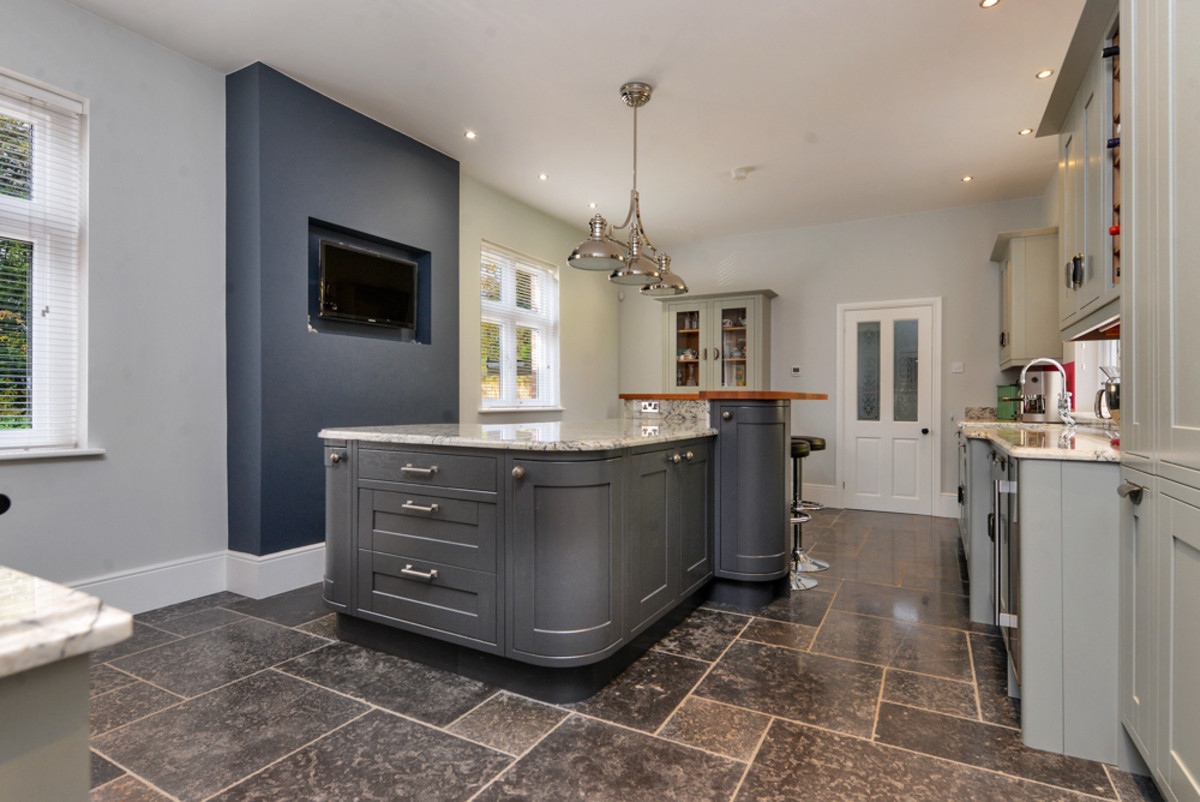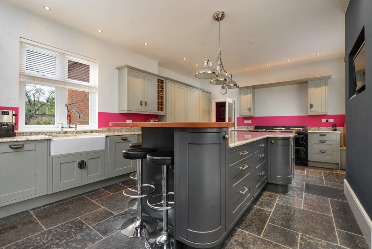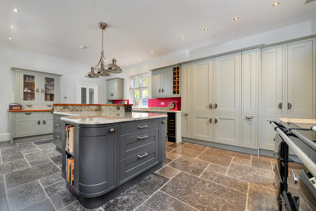 Access to the kitchen is gained via the boot room or alternatively via the main hallway. The former also leads to the utility area fitted with granite worktops and tiled flooring. The wonderful recently refitted breakfast kitchen has an abundance of hand painted kitchen units and island, complemented by the ‘tobacco leaf design’ granite worktops and natural stone tiled flooring. Built in appliances and gas four oven Aga with an intelligent management system make for a very practical work and living space. All benefitting from under-floor heating.