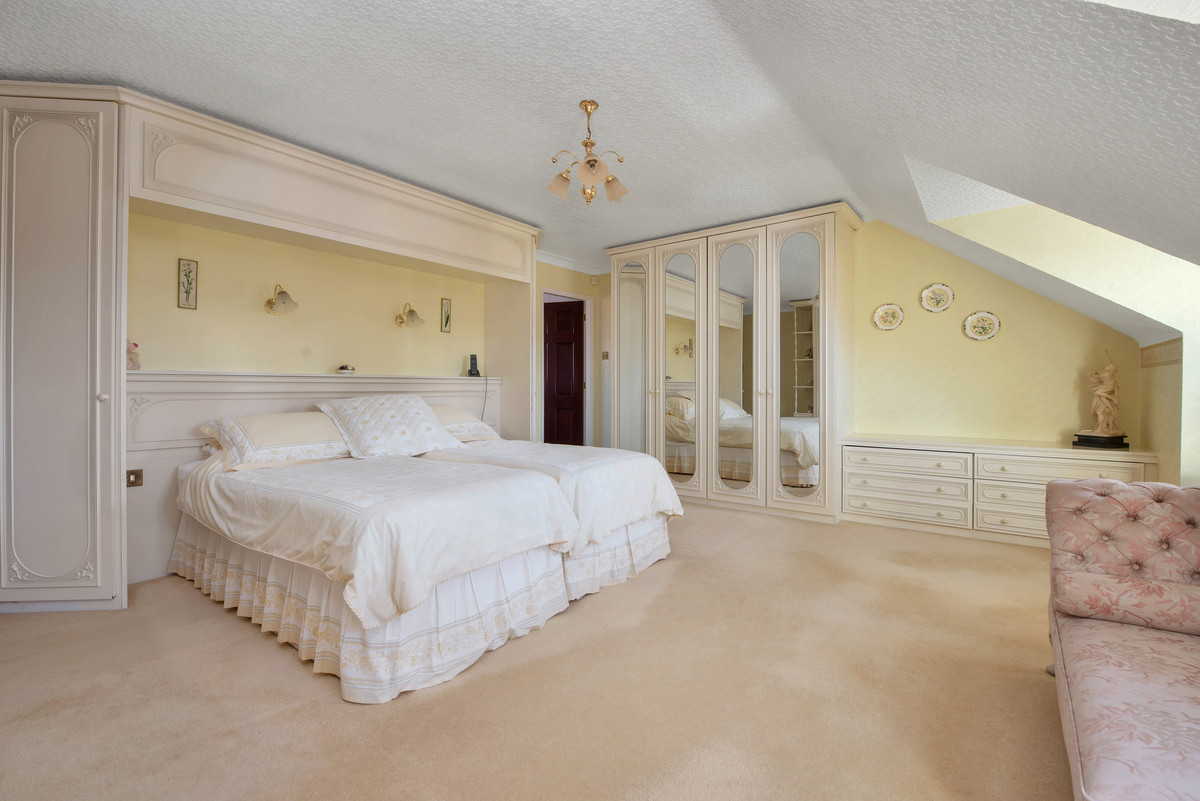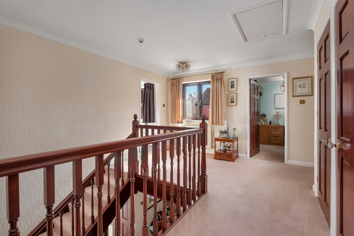 A traditional staircase rises to the first floor where an impressive landing provides access to all bedroom accommodation. The principal bedroom is extremely luxurious with comprehensive built in storage and an en suite bathroom. There is a guest bedroom with en suite as well as two further double bedrooms sharing the use of a family bathroom. The first floor also provides useful built in storage as well as a home office.