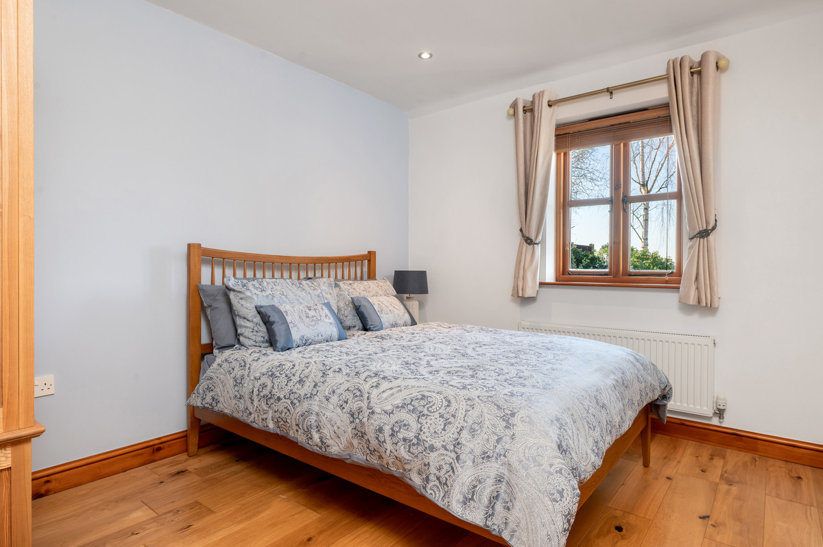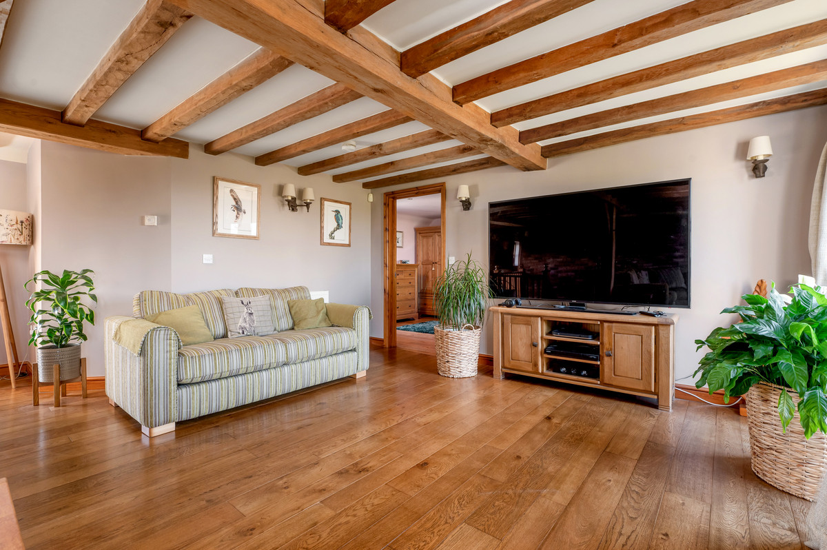 To the first floor is a substantial, dual aspect living room with beamed ceilings and an exposed brick fireplace with gas fire. There are full height windows as well as French doors to the rear balcony. The master bedroom also has access to the balcony via French doors, as well as an en suite with shower, hand wash basin, heated towel rail and W.C. There