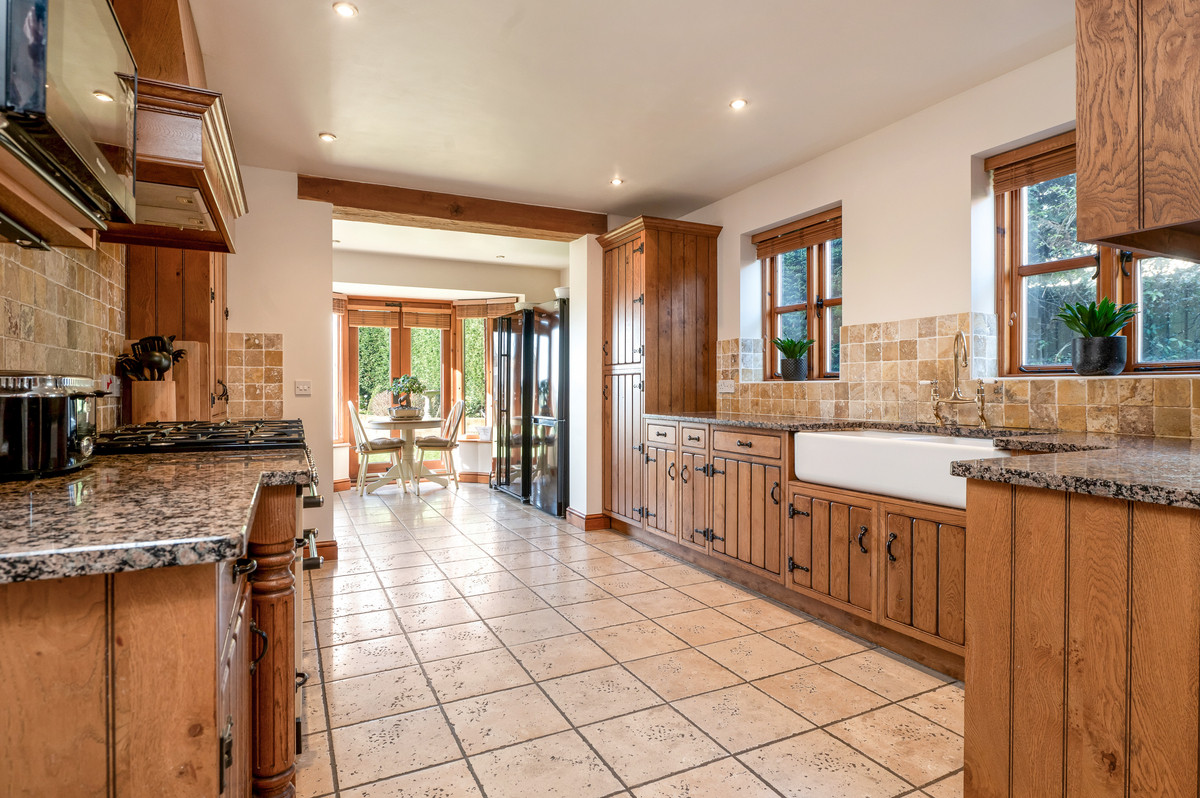 The property enters into the bright and spacious entrance hall with solid oak floor, exposed brick elevation and storage cupboard. The kitchen has a range of Prentice solid oak wall and base units with granite work surfaces and double butler sink. Integrated appliances and gas range cooker. There is a breakfast area with bay window and French doors opening on to the rear decking. The separate utility room has wall and base units with butler sink, space for washer and dryer and stable door to the side elevation.