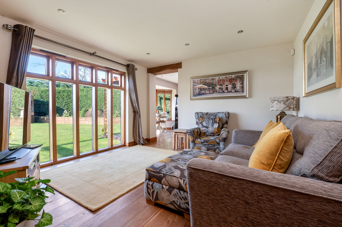 Externally to the front of the property is a substantial, gated driveway and double garage with electric points and lighting as well as eaves storage. To the rear is a good sized garden, mostly laid to lawn with mature flowerbeds and decking adjoining the property. The garden has a superb open aspect overlooking paddocks with far reaching