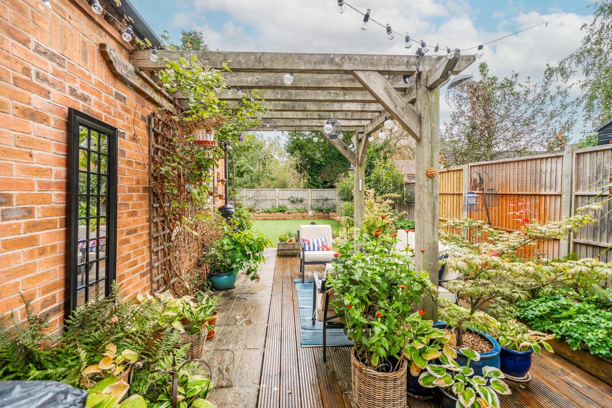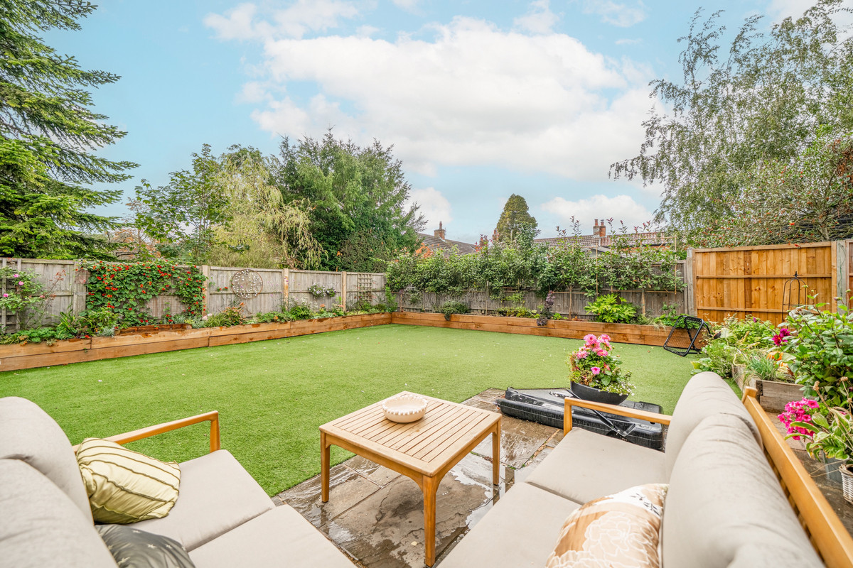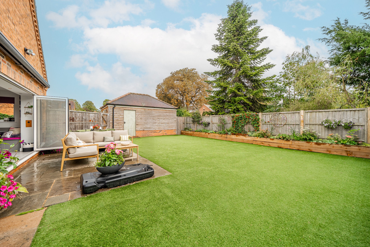 Outside, the home sits on a mature and private plot, nestled in a corner position with gardens extending to three sides. The southerly-facing garden has been designed with ease of maintenance in mind, featuring an artificial lawn and paved terrace that flows directly from the kitchen's bifold doors. To the rear, a more formal garden awaits, with a central lawn, paved seating areas, and richly planted borders showcasing established trees and shrubs.