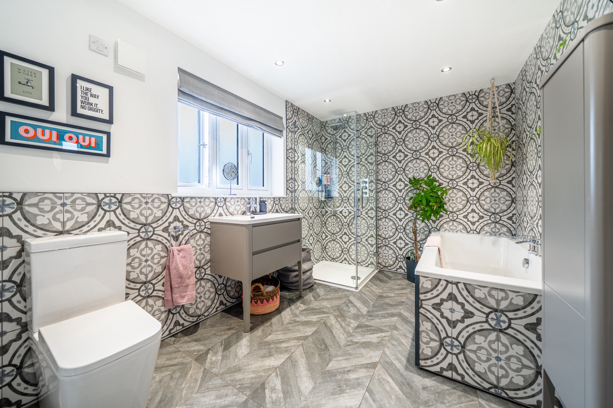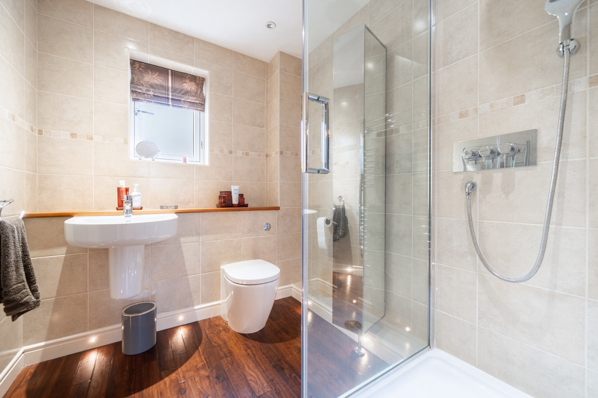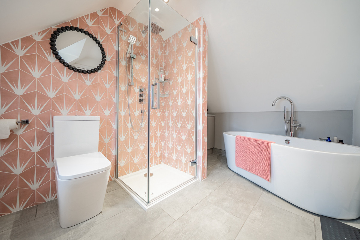 Extending to nearly 2,300 sq. ft, the accommodation is generous and versatile. The ground floor comprises three principal reception rooms, a spacious living kitchen, a utility room, cloakroom, and a welcoming central hallway with a traditional staircase rising to a galleried landing above. This upper landing, enhanced by overhead skylights, bathes the space in natural light and leads to four well-proportioned double bedrooms. Two bedrooms enjoy en-suite facilities, while bespoke fitted wardrobes serve the three main rooms. A well-appointed family bathroom completes the upstairs accommodation.
