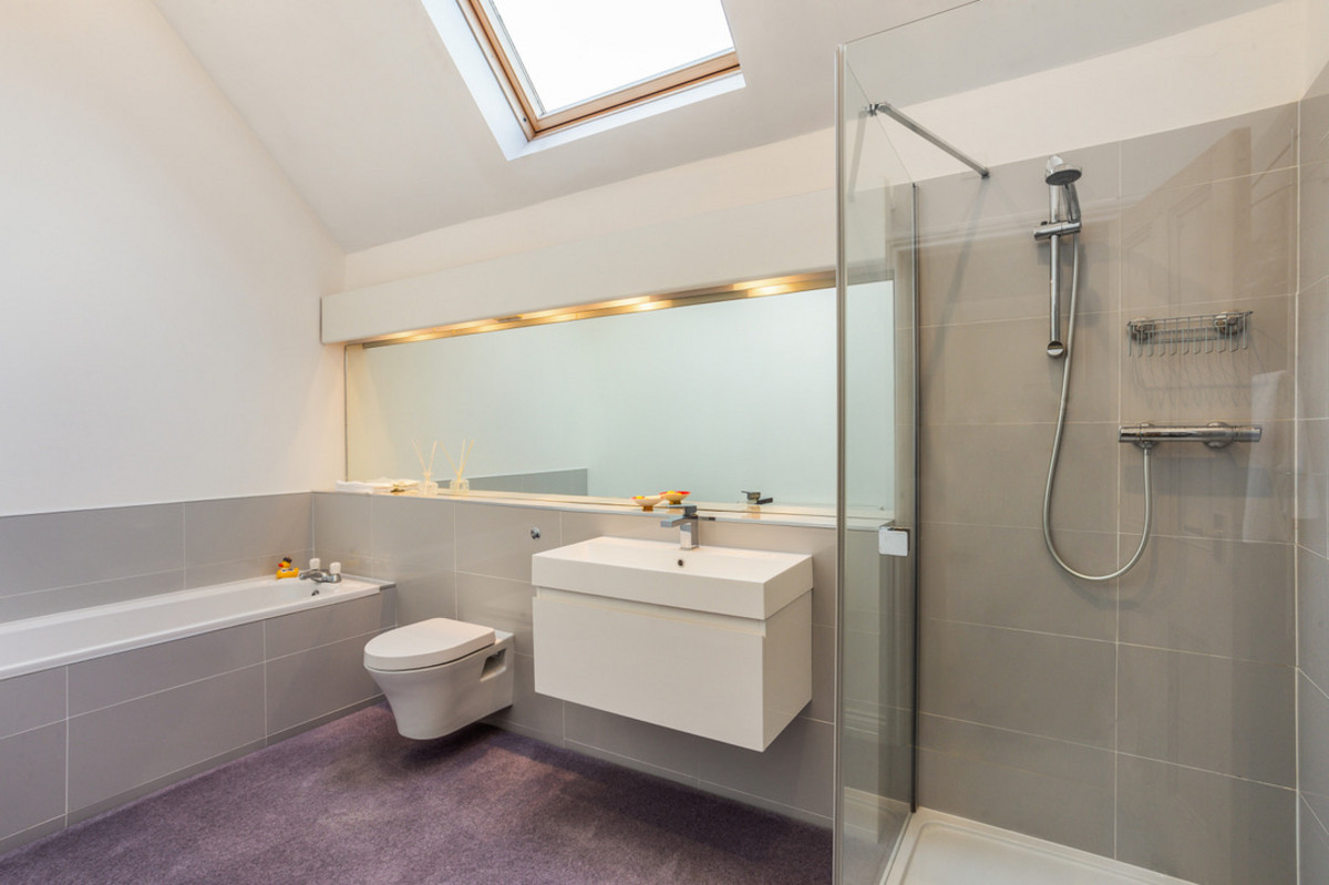 To the right of the landing, a hallway leads to a spacious family bathroom, complete with a fitted bathtub, a wall-mounted toilet, a wall-mounted vanity washbasin, and a separate shower enclosure.