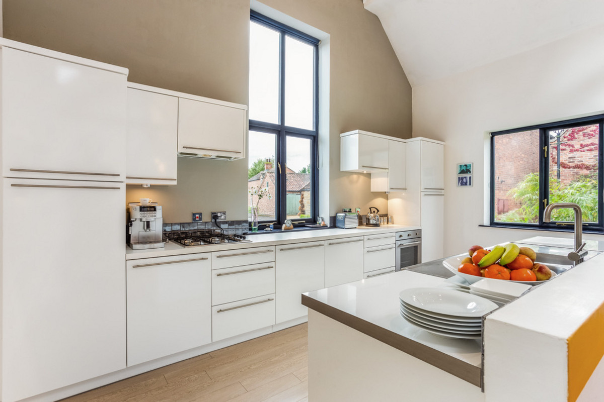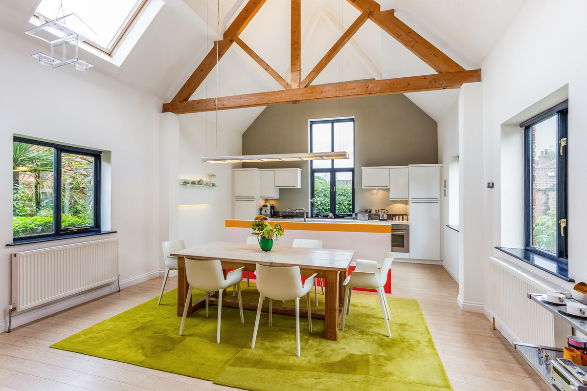 The property's exceptional kitchen and dining area are undoubtedly standout features, boasting triple-aspect views and a vaulted ceiling that reveals exposed oak truss beams. This space is ideal for entertaining, featuring high-gloss white base and wall cabinets, laminated countertops, and integrated appliances such as an electric oven, a four-burner gas Smeg hob, and a double stainless steel sink and drainer. Provisions are also in place for a dishwasher and refrigerator. Adjacent to the kitchen and dining area is a practical utility room, equipped with additional base and wall units, a secondary sink, and connections for a washing machine, dryer, and fridge/freezer.