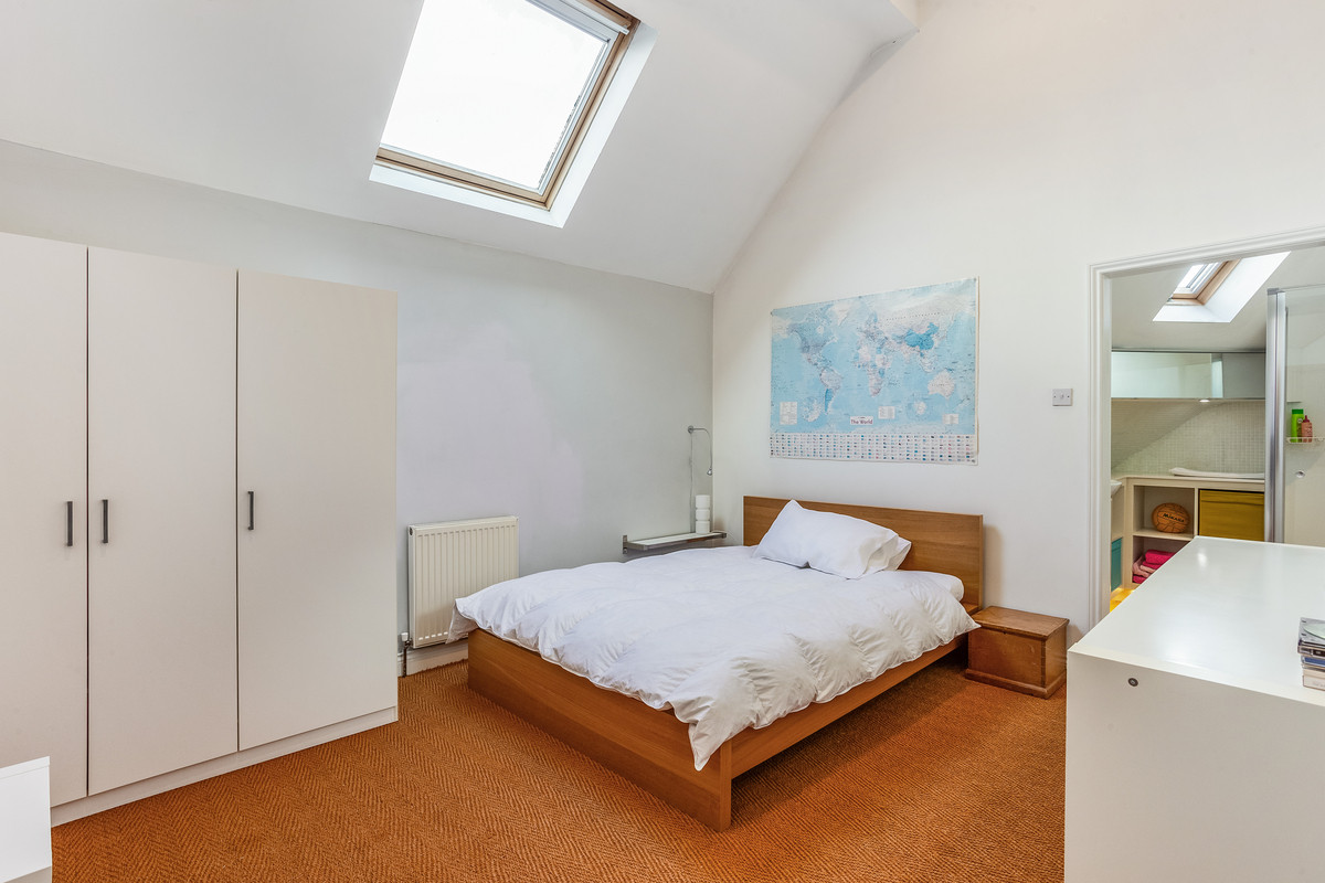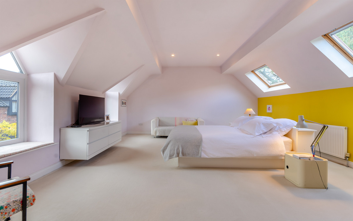 A double bedroom positioned to the front of the property and the main bedroom are located along this hallway. The principal suite is remarkably spacious, featuring dual-aspect views, a walk-in wardrobe, and a modern three-piece en-suite bathroom with a vanity washbasin, a wall-mounted toilet, a corner shower, and a chrome heated towel rail.